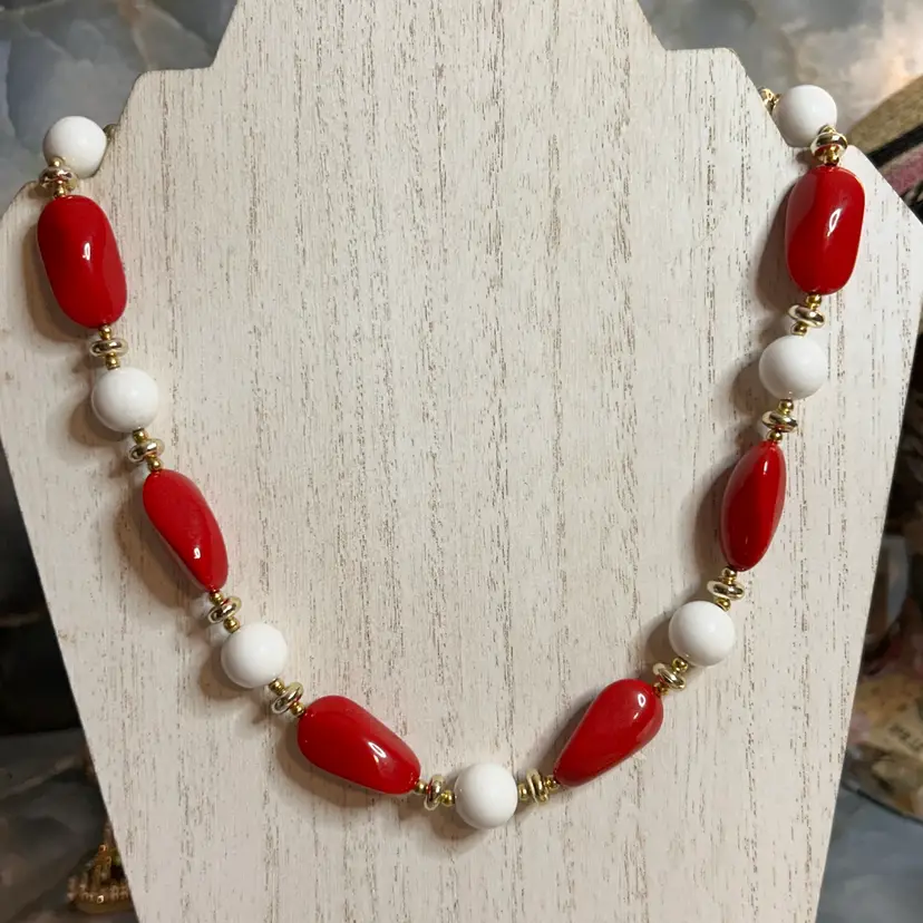 22” length. Red and white acrylic beads with gold tone accents. Please see photos as they are part of the description. Thank you for looking!