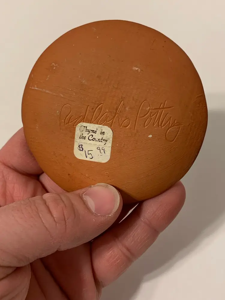 Small size, good as a ring dish. Nice Easton Illinois folk art potter. In good condition. There is some crazing to the glaze. No damage.
