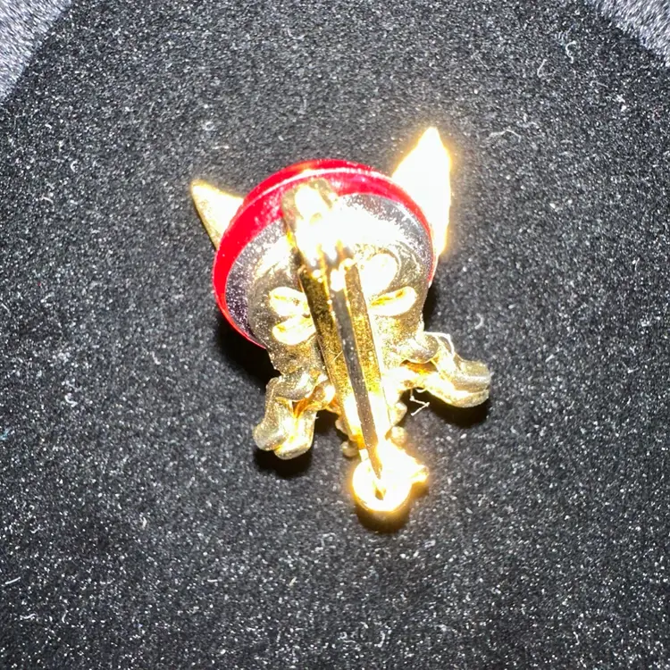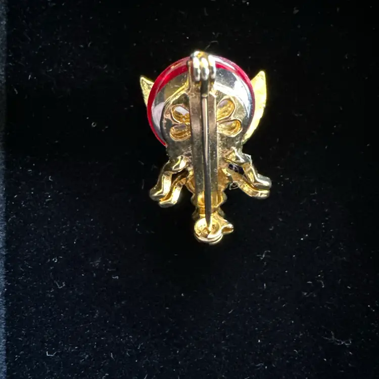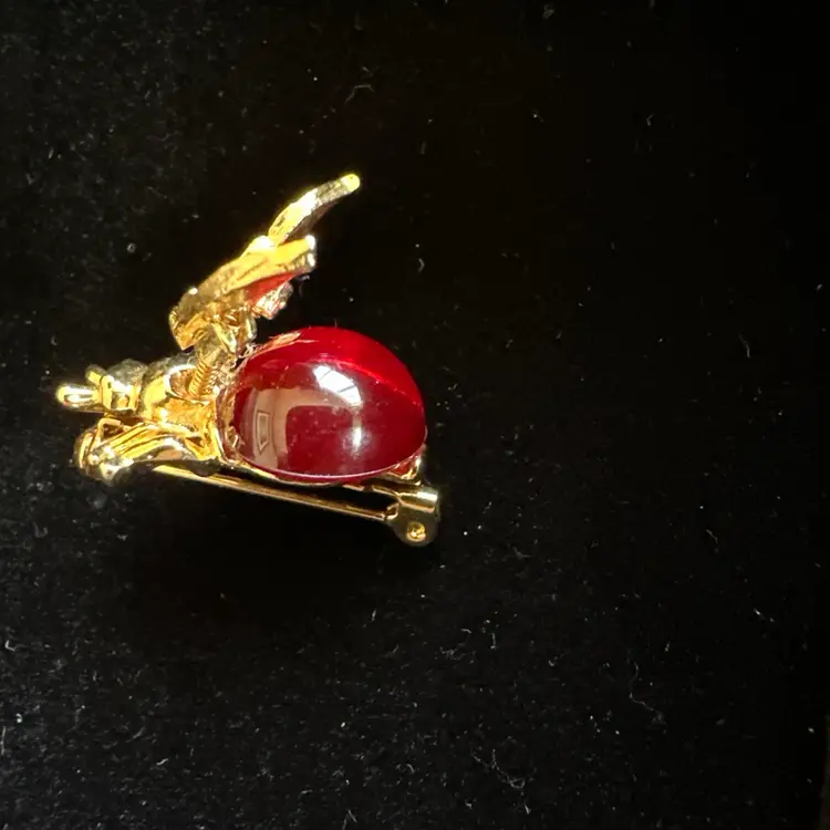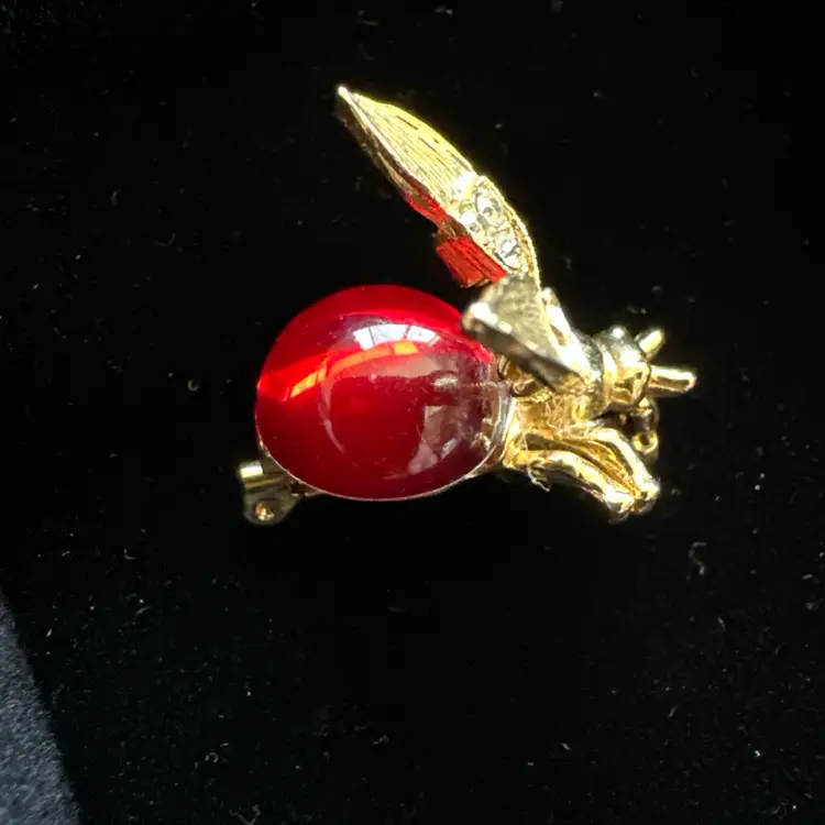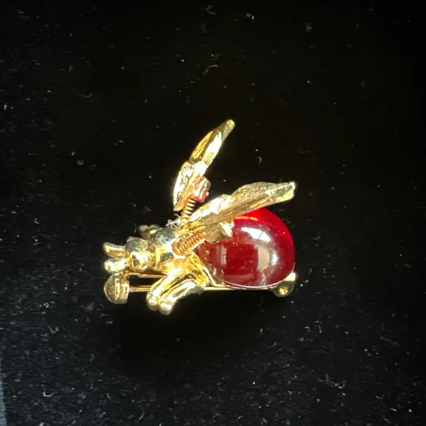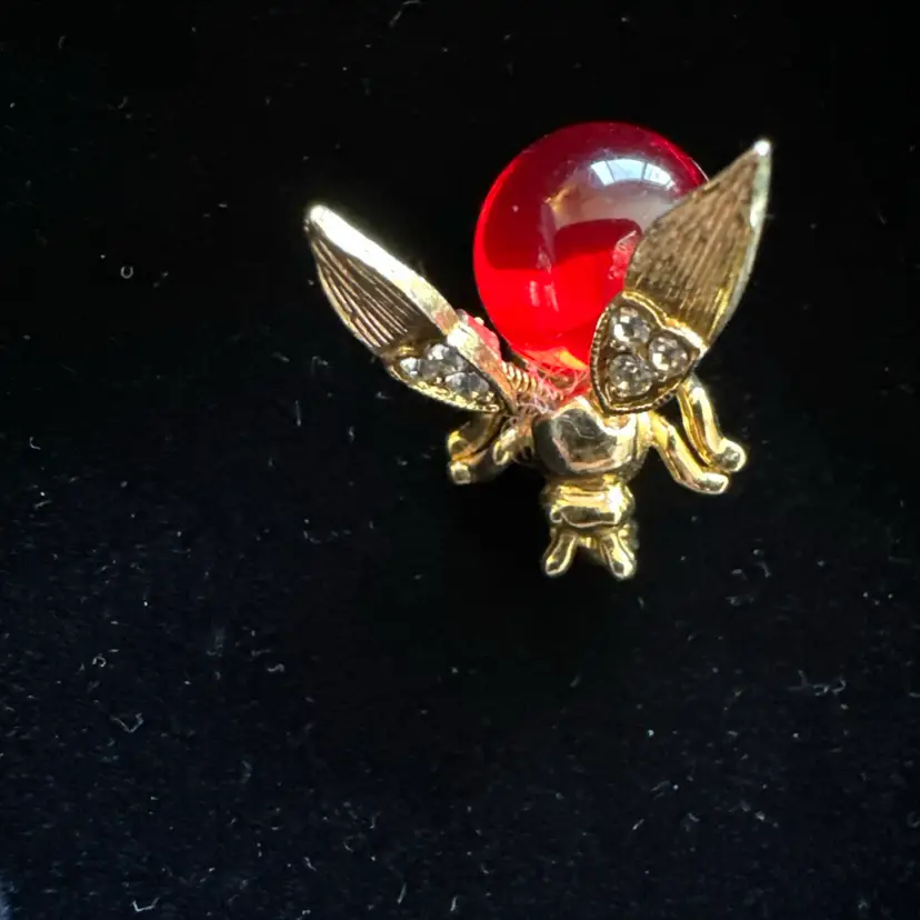 The Vtg Red Rhinestone Jelly Belly Beetle Bug Gold Tone Moving/vibrating Wings Brooch is a vintage piece of jewelry that features a red rhinestone oval shape main stone. The brooch is designed to resemble a beetle bug with gold tone moving wings, giving it a unique and eye-catching appeal. Perfect for all occasions, this retro era piece by Vintage Red brings a touch of whimsy and sparkle to any outfit.