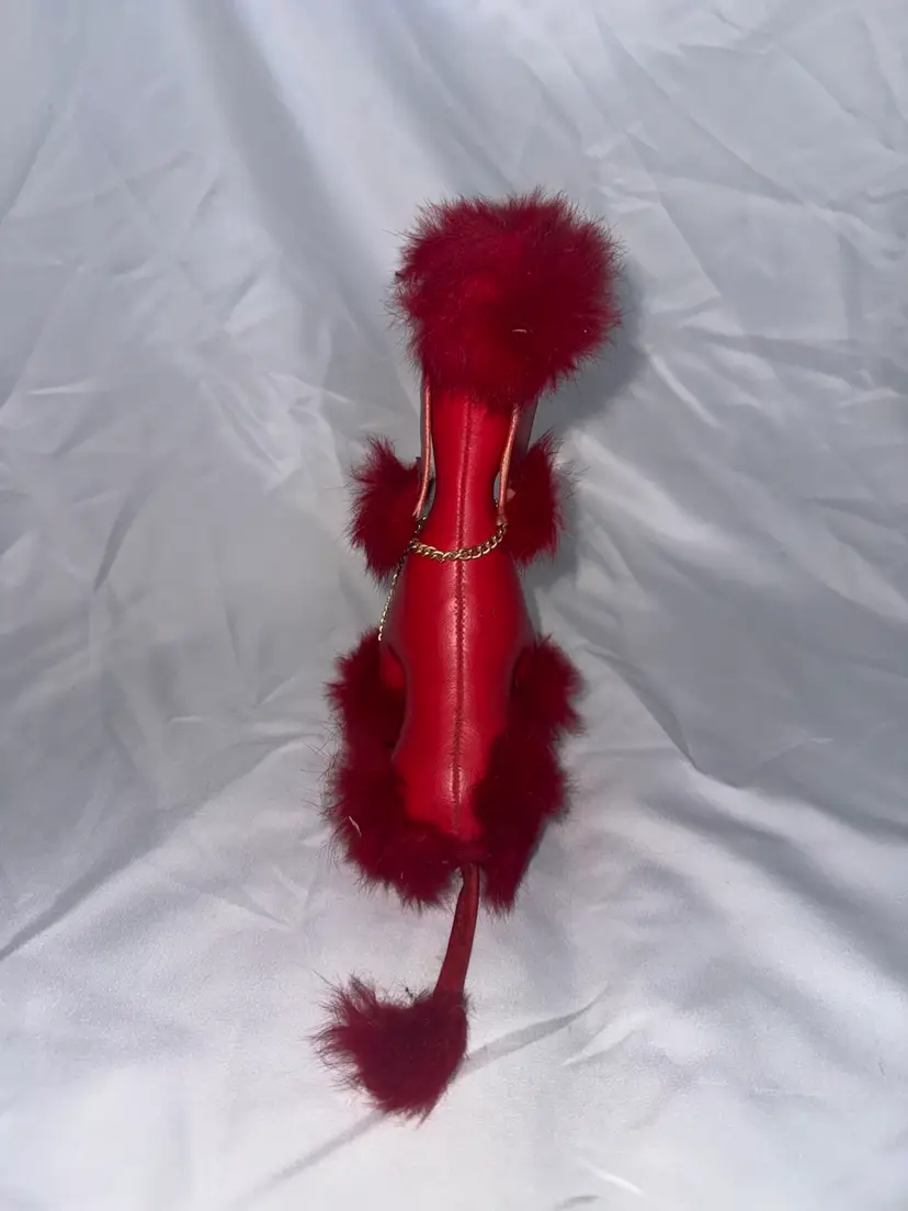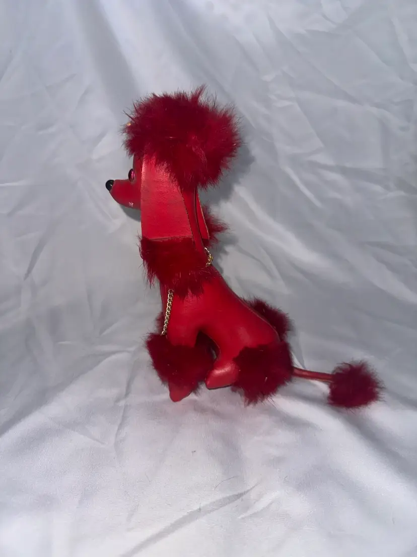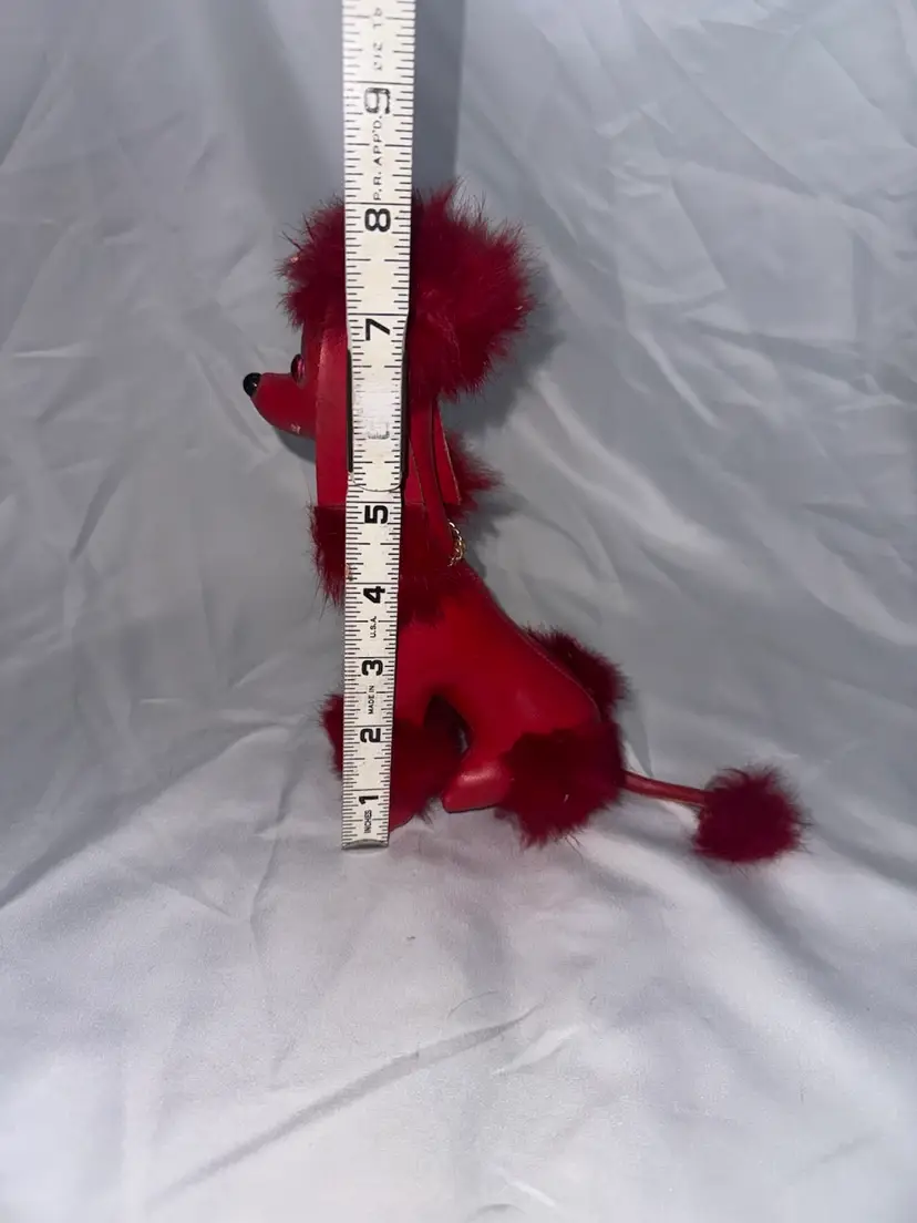 Vintage red vinyl poodle toy with faux hair. This little guy is cute!! Very good condition. See pictures for measurements.