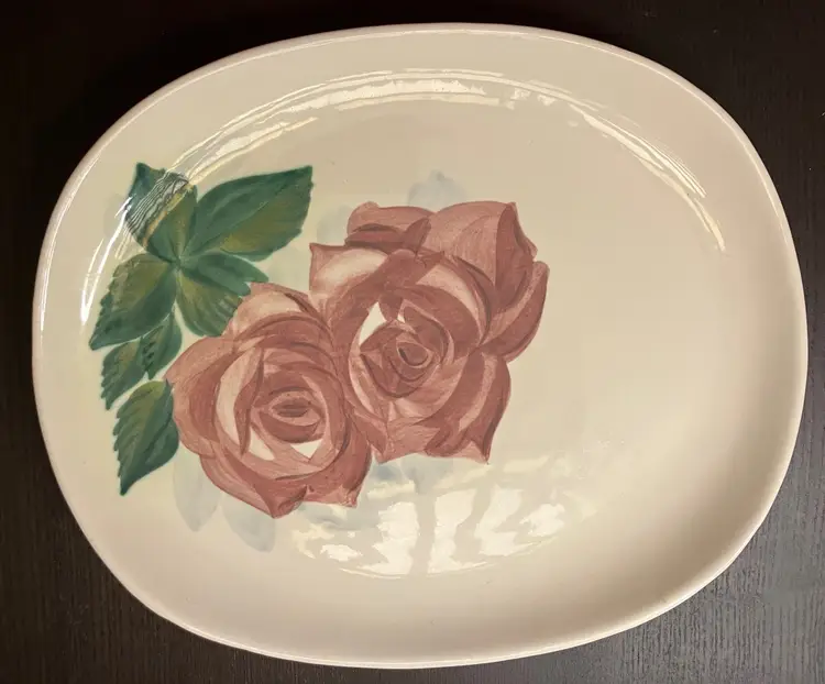 Roses with green leaves on a cream-colored background sometime between 1942 and 1955 Measures 12 3/4" by 10 3/4". Weighs 2 lbs, 3 oz before packaging. Wear on the bottom.