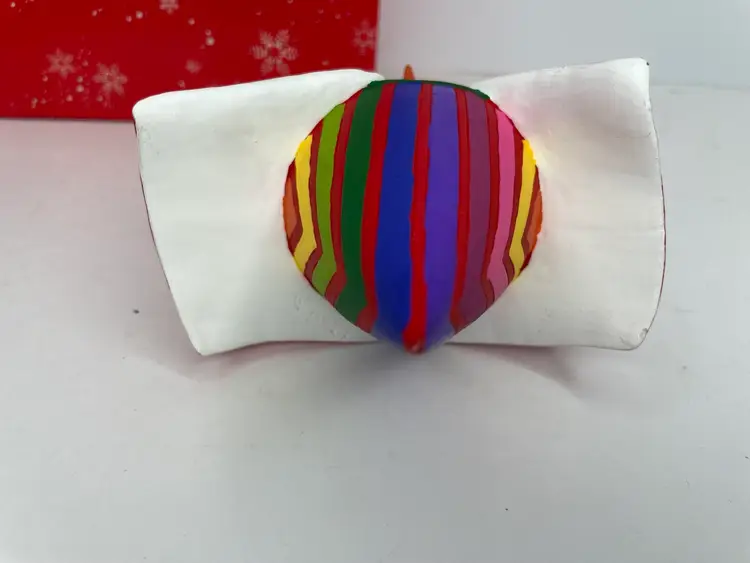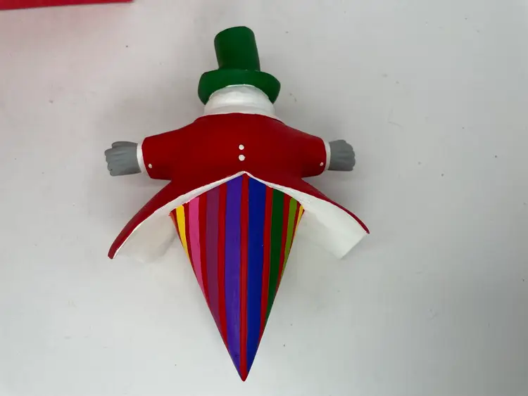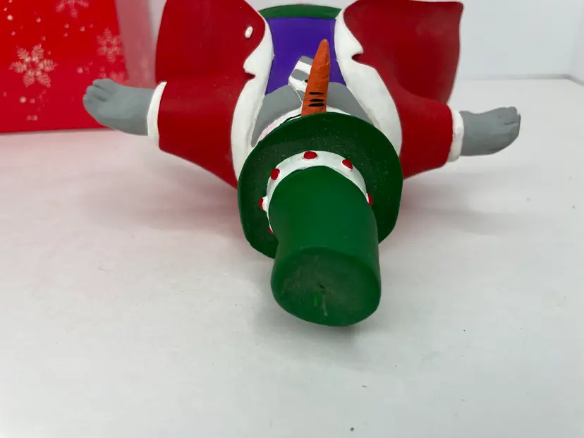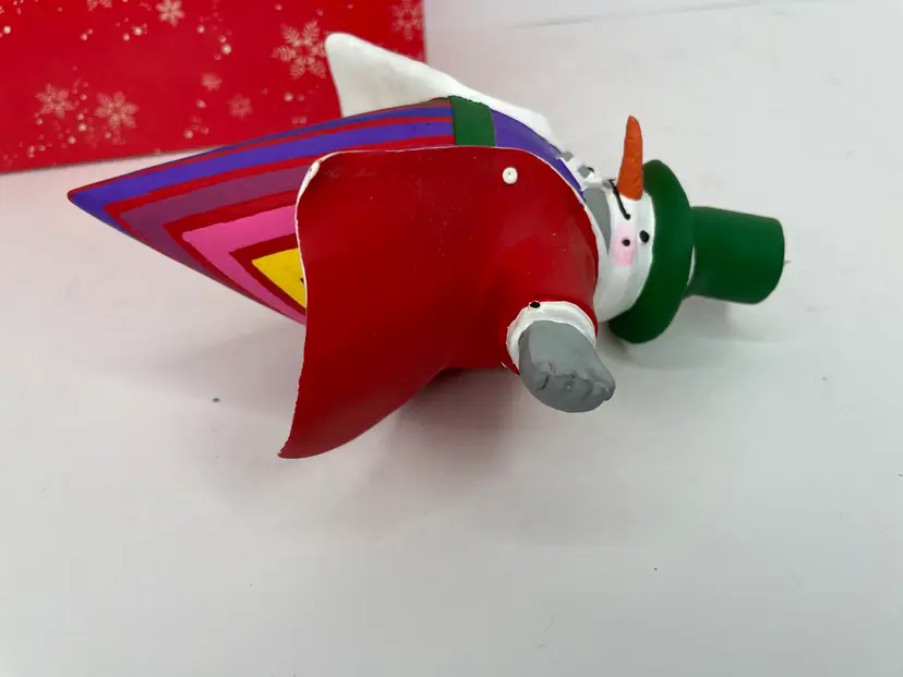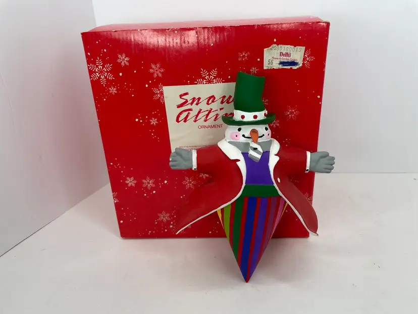 This vintage Department 56 Snow Attire ornament features a charming snowman with a top hat and a colorful multicolor pattern. It is a medium-sized ornament measuring 5.5 inches in length and 7 inches in height. The ornament is perfect for Christmas and holiday occasions, and it comes in its original box.