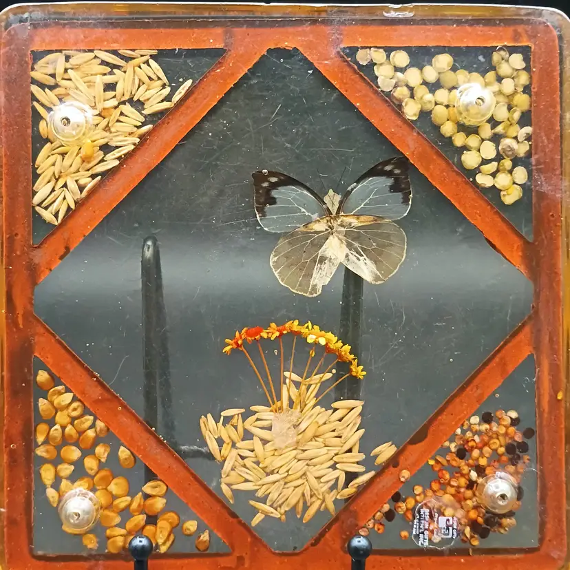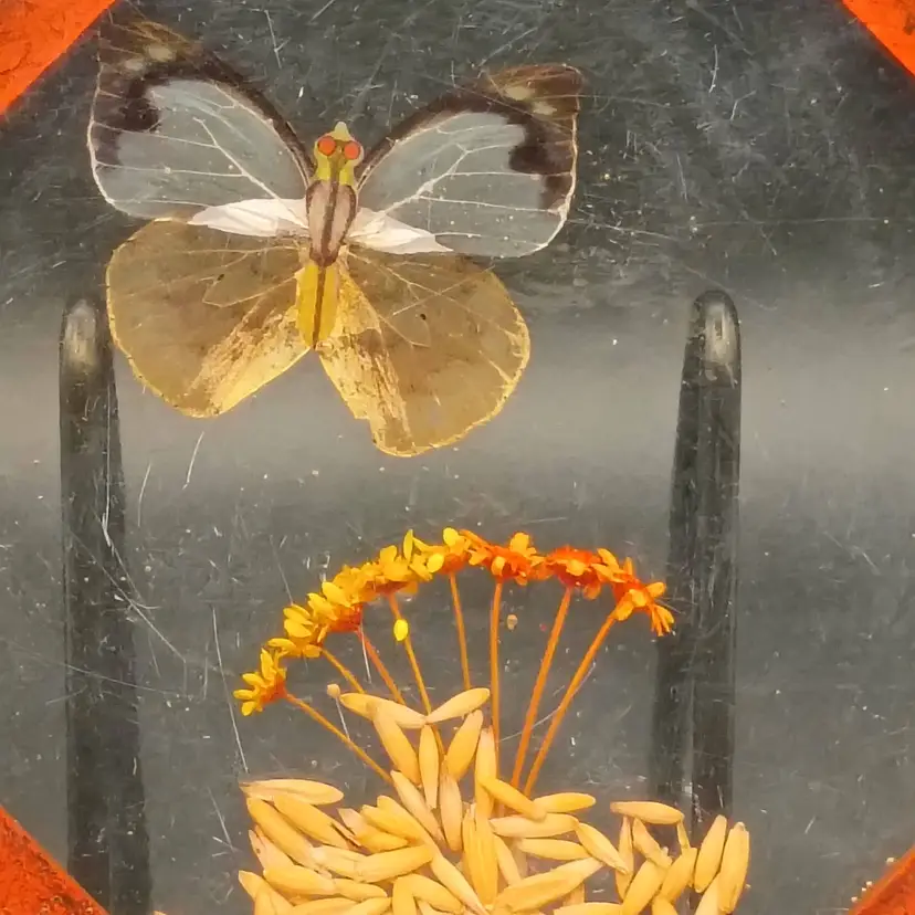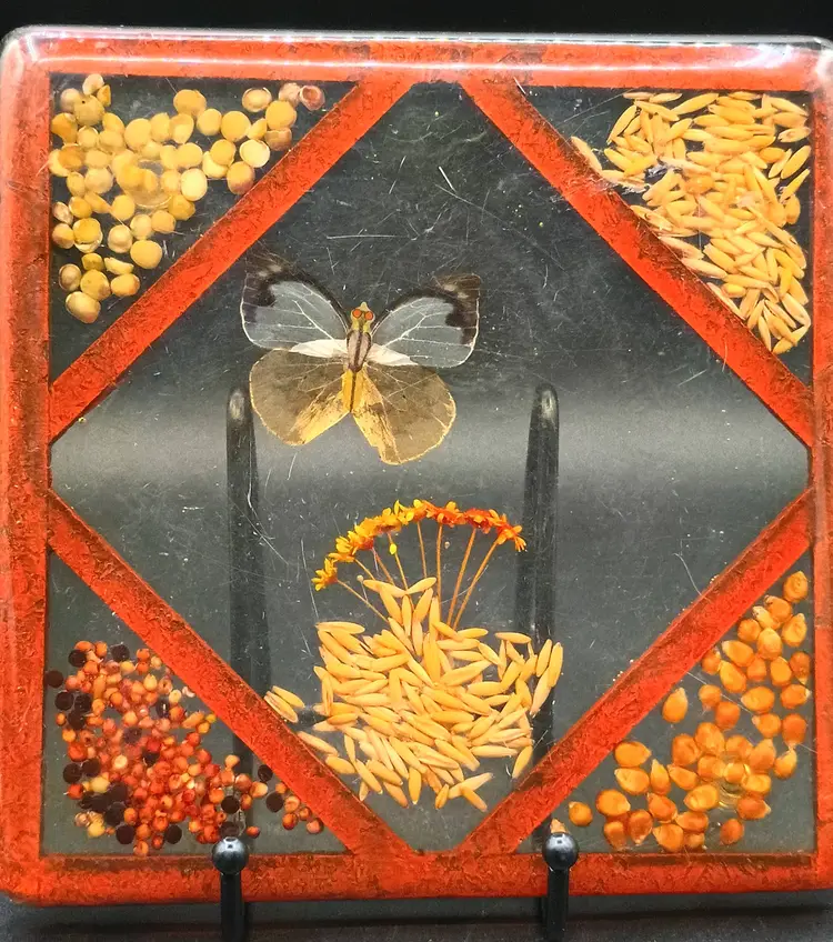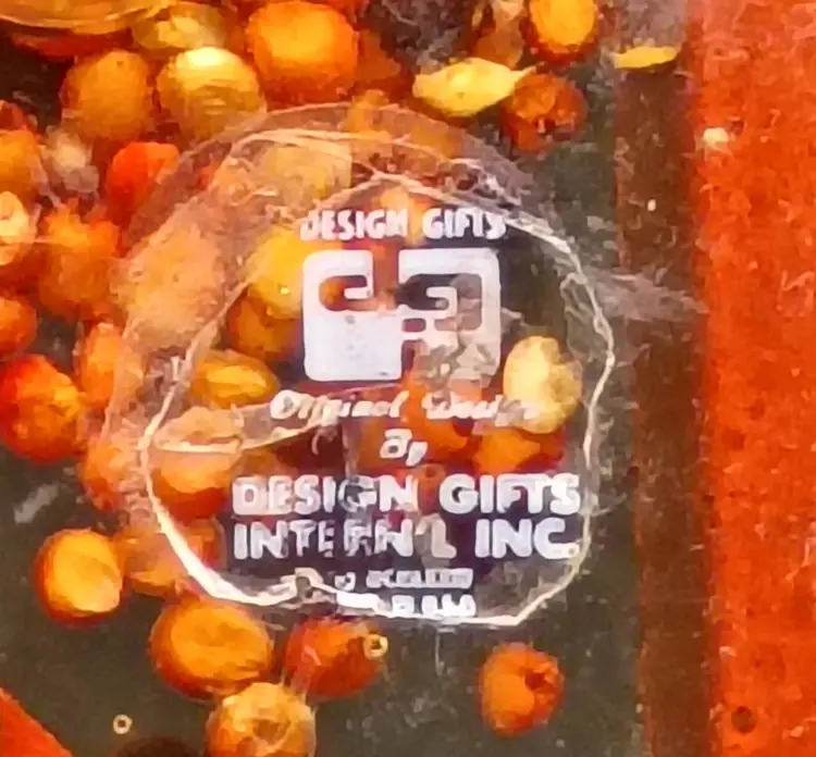 This VTG Retro MCM Resin Acrylic Trivet Square 7 1/2 inches is a decorative piece perfect for all occasions, with a vintage decor pattern and a Mid Century Modern style. Made of multicolor acrylic material, this trivet features a butterfly design and a glossy finish. Hand wash only and sourced from the United States, this unique item adds a touch of retro charm to any kitchen or dining area. There is an original sticker on the bottom -- Design Gifts -- Design Gifts International Inc.