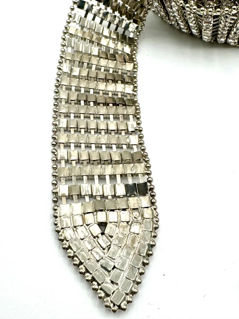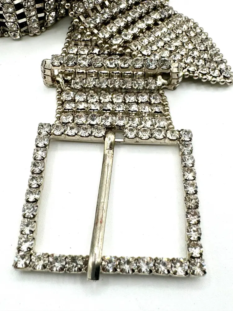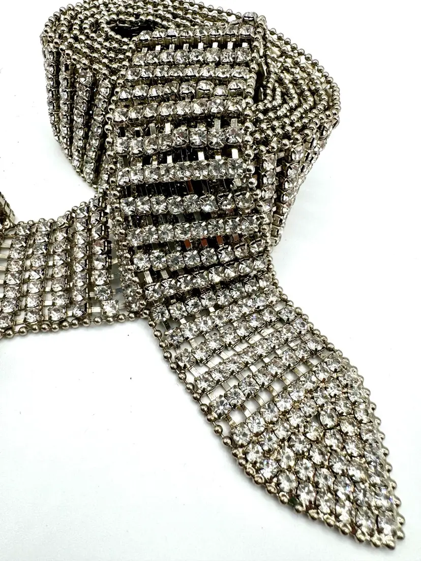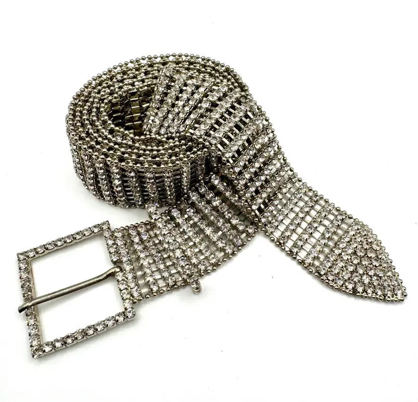 Make a statement with this vintage rhinestone belt that features eight rows of prong-set rhinestones on a silver chain link. The sparkling accessory is perfect for clubwear and disco-themed parties, adding a touch of glamour to any outfit. With its original design from the 1970s and unknown country of manufacture, this belt is a unique and rare find. It measures a large 48 inches in length, making it suitable for women of all sizes. This belt is a must-have for anyone looking to add some vintage flair to their wardrobe.