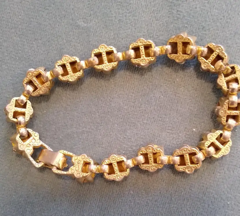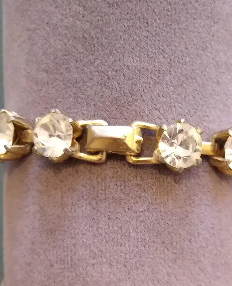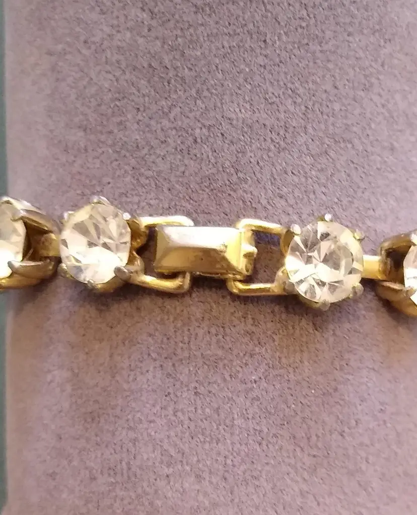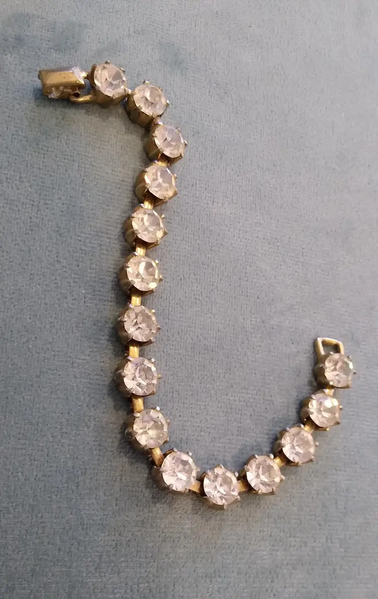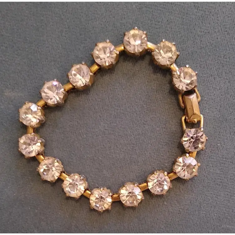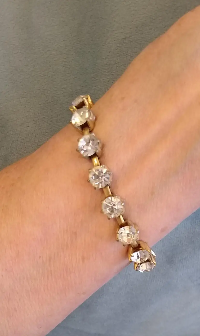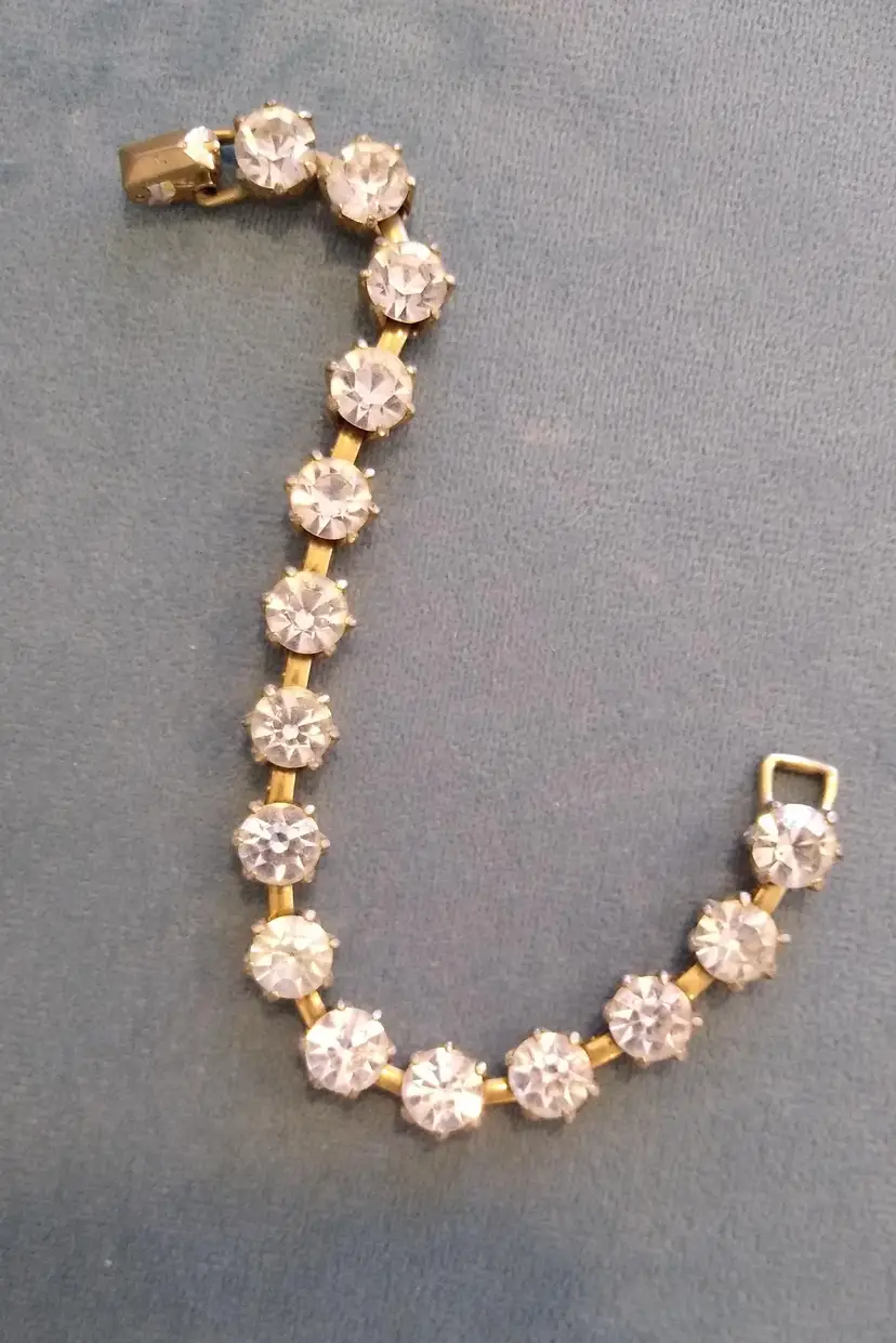 15 large, brilliant foiled paste (Rhinestone) stones in goldtone metal setting. Bracelet and clasp are in excellent condition! Super showy & gorgeous! #Regency era #bridgeton glam