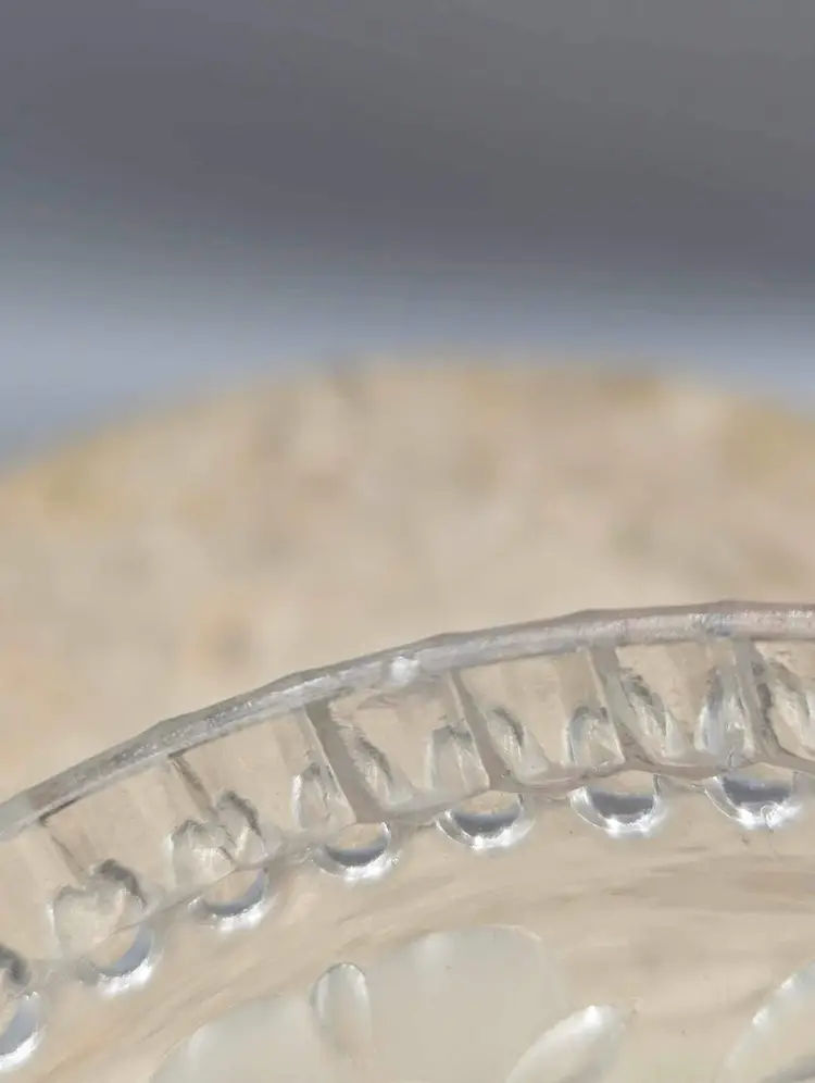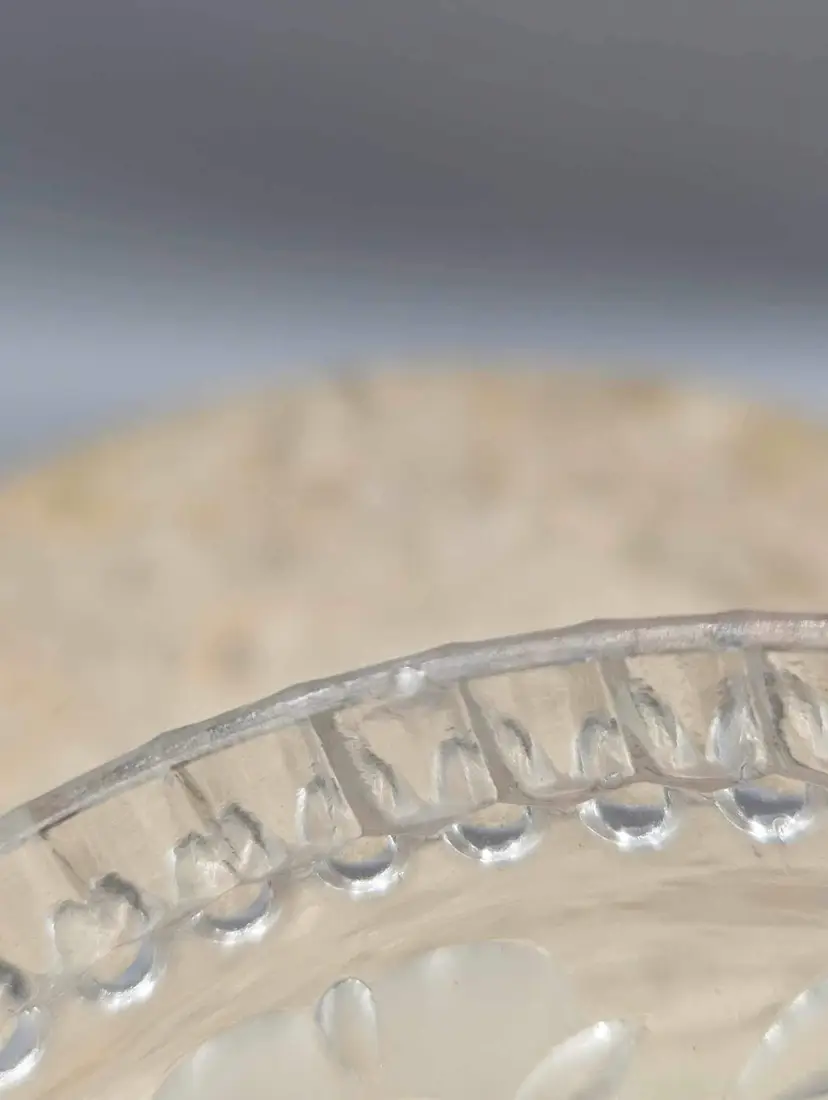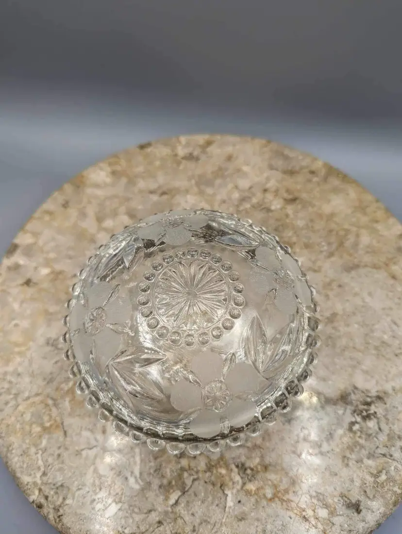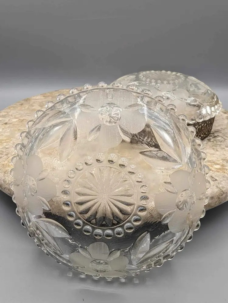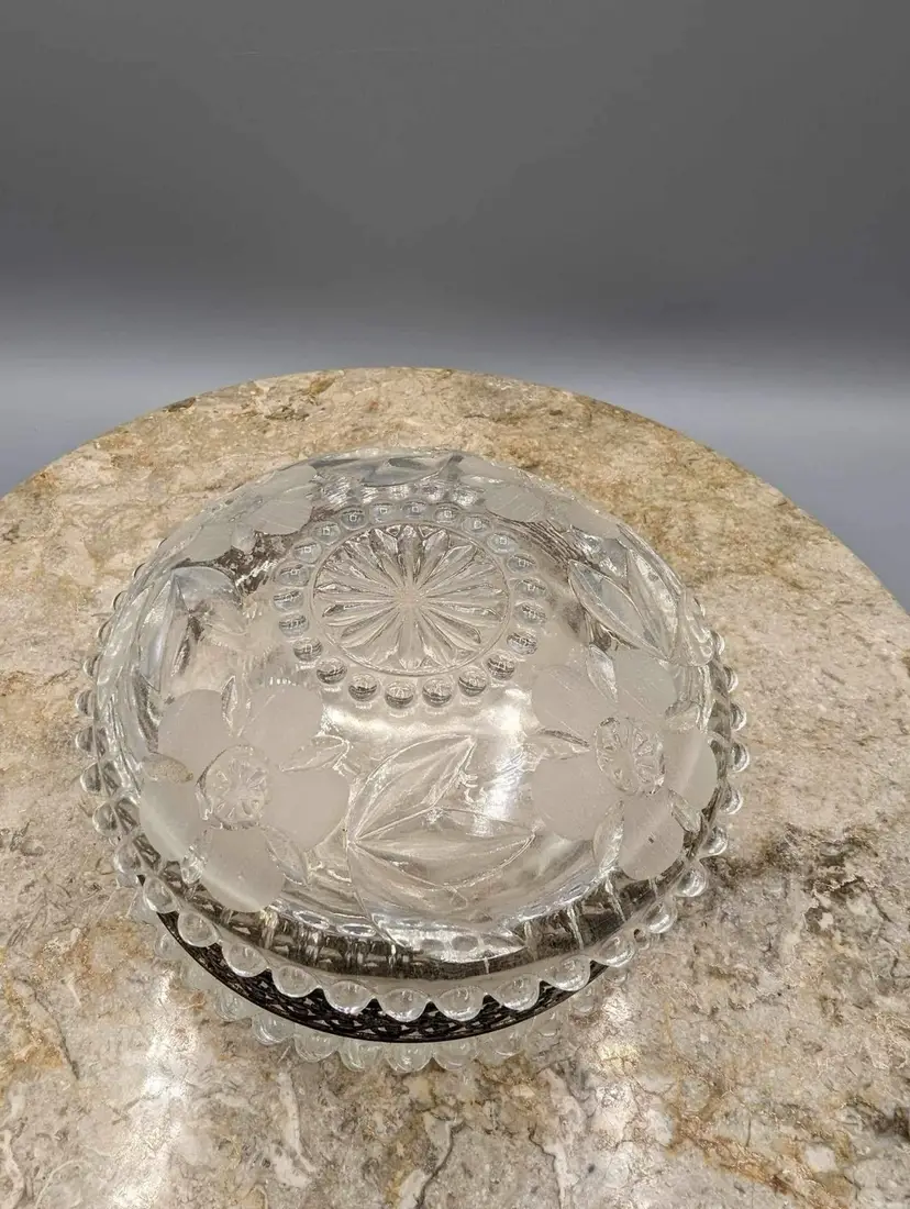 Perfectly sized for trinkets or jewelry, this round crystal box is both functional and beautiful. The crystal sparkles in the light, adding a touch of elegance to any room. Don't miss out on the opportunity to own this beautiful vintage piece. Beautiful vintage condition. Only one small crack on inside rim of bottom piece. A couple tiny flea bites as well on the same rim. Not sharp. Please see pictures.