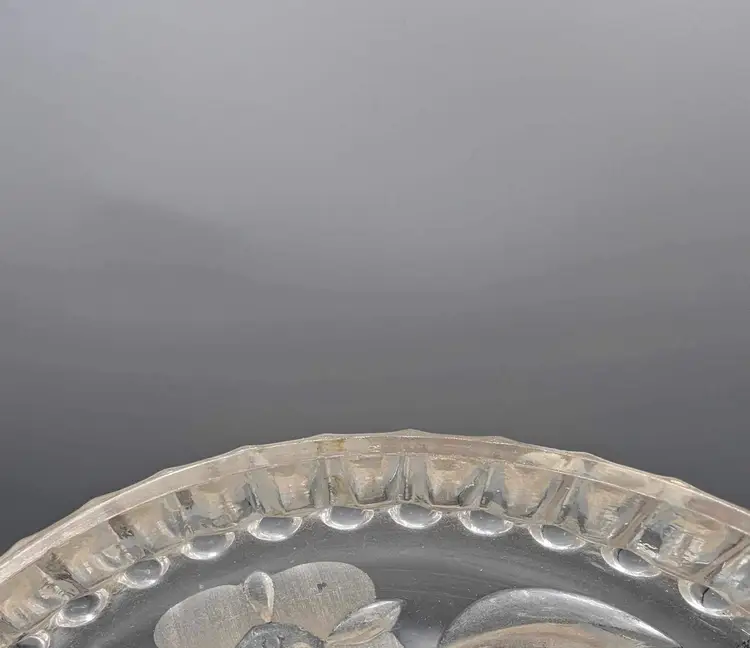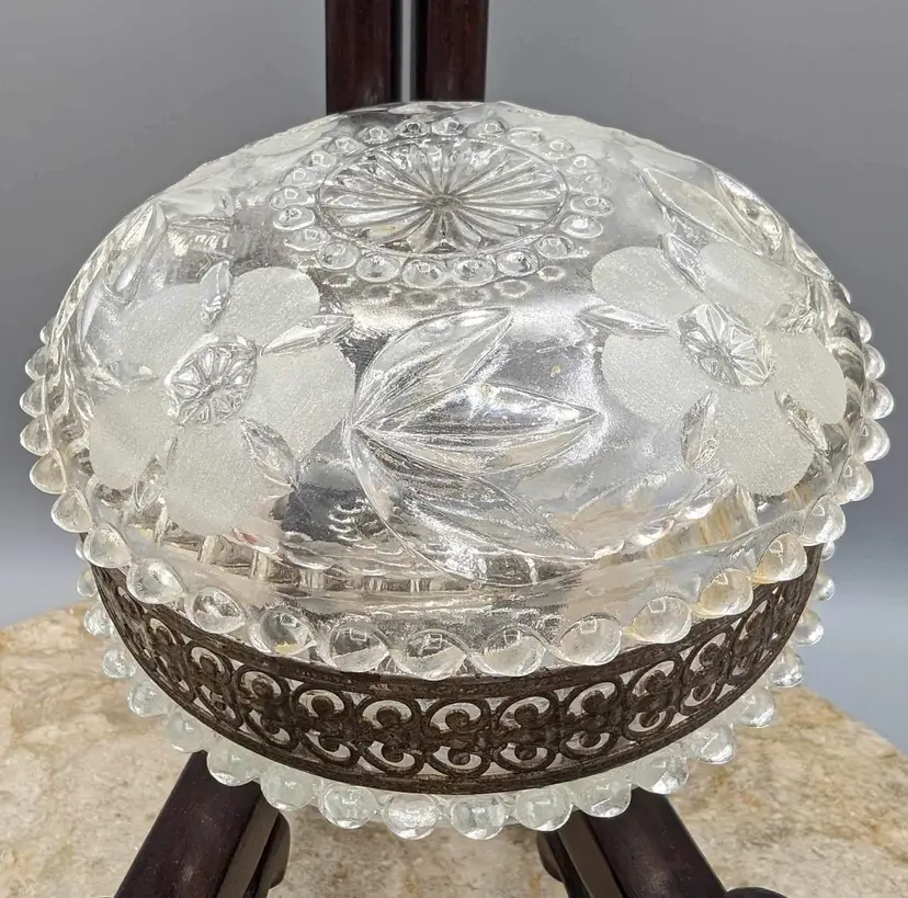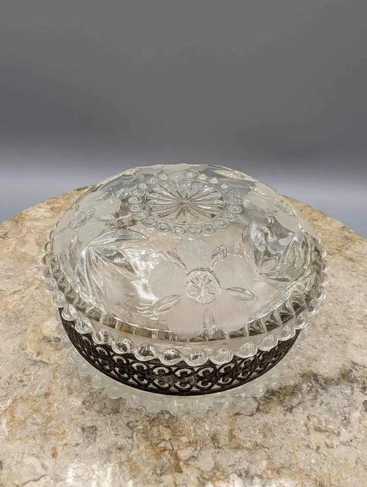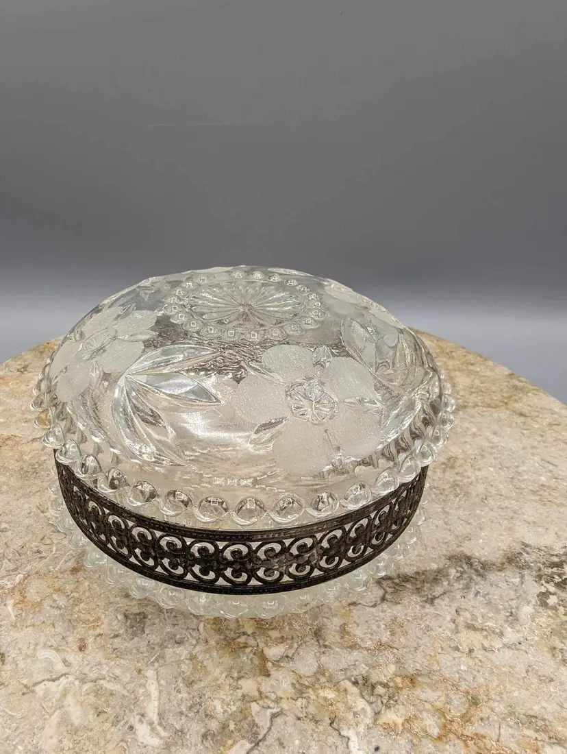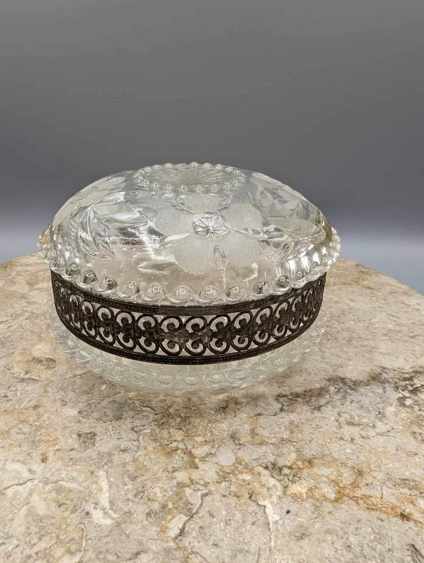 This vintage round crystal box with gilt metal detail and floral etched cut crystal jar is a stunning addition to any collection. The intricate details of the floral etching and the gilt metal accents make this piece truly unique. 5” X 3”