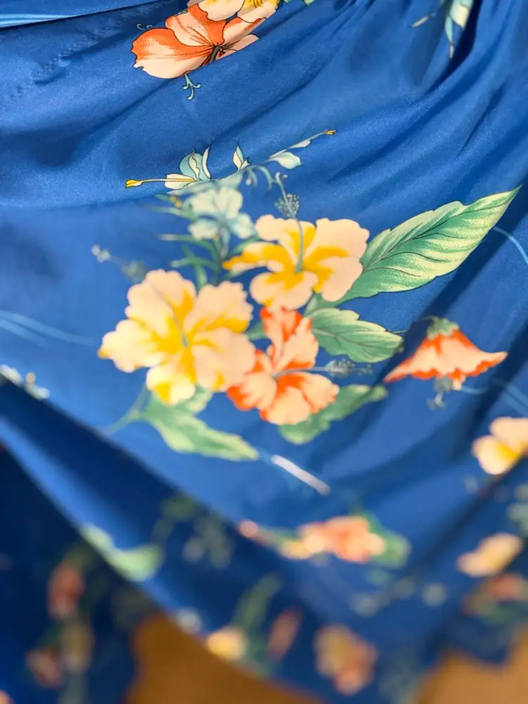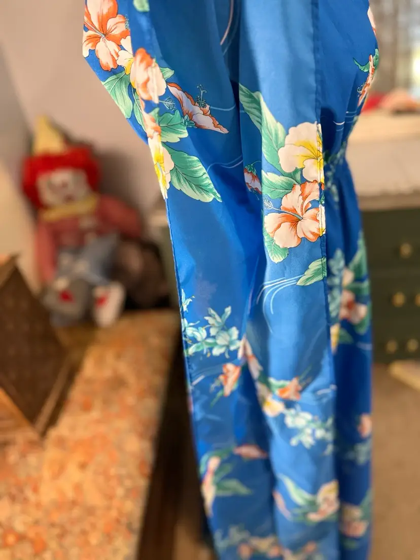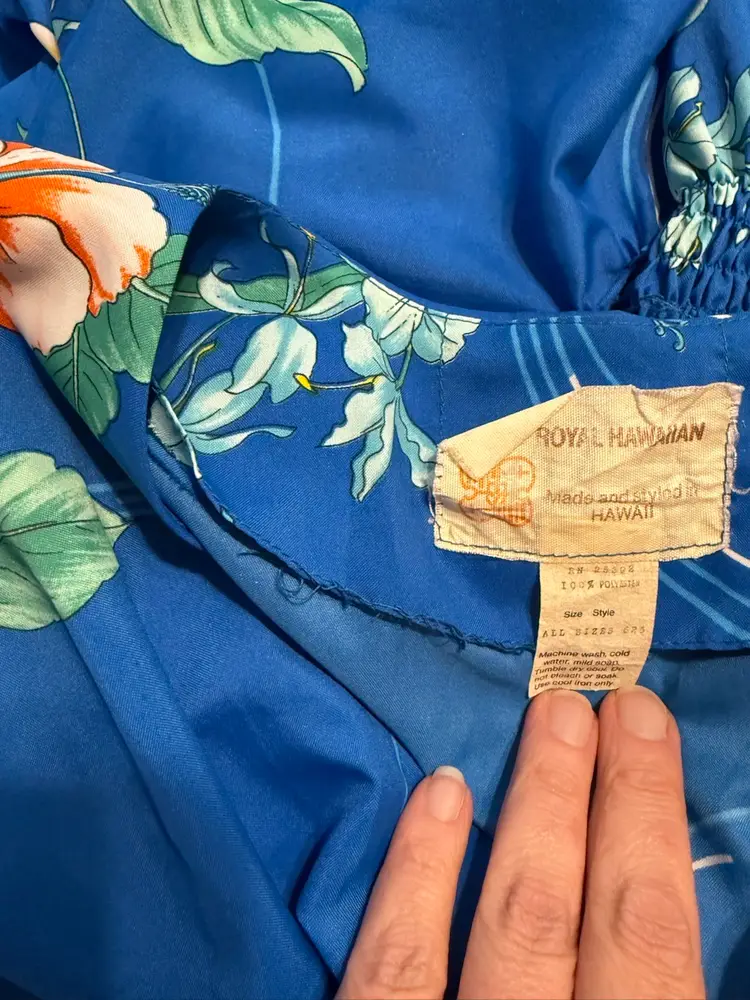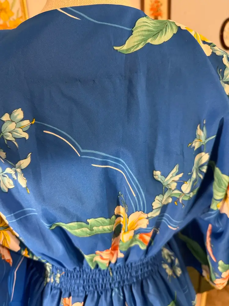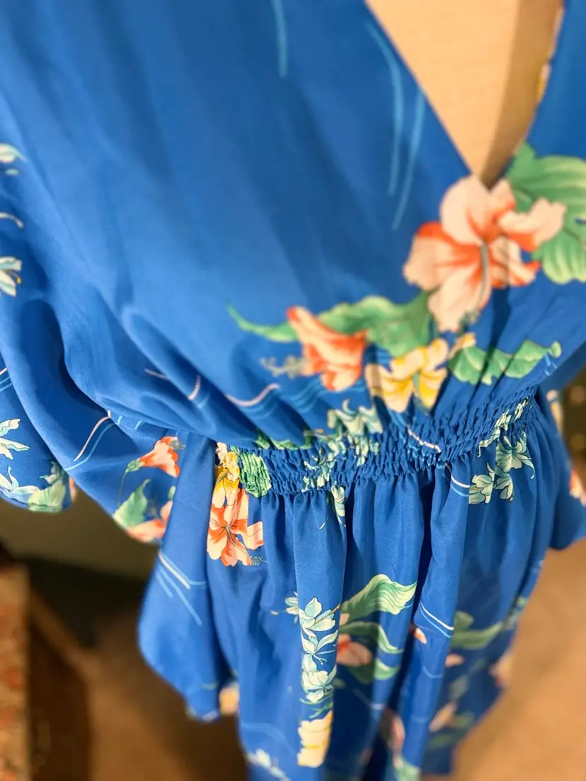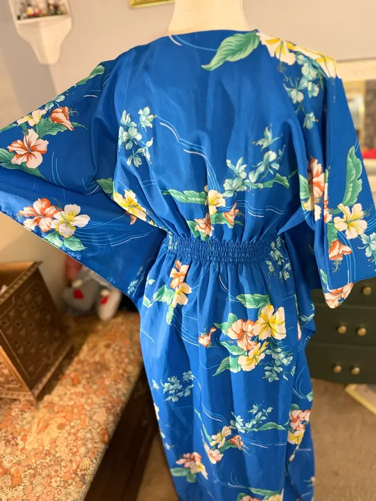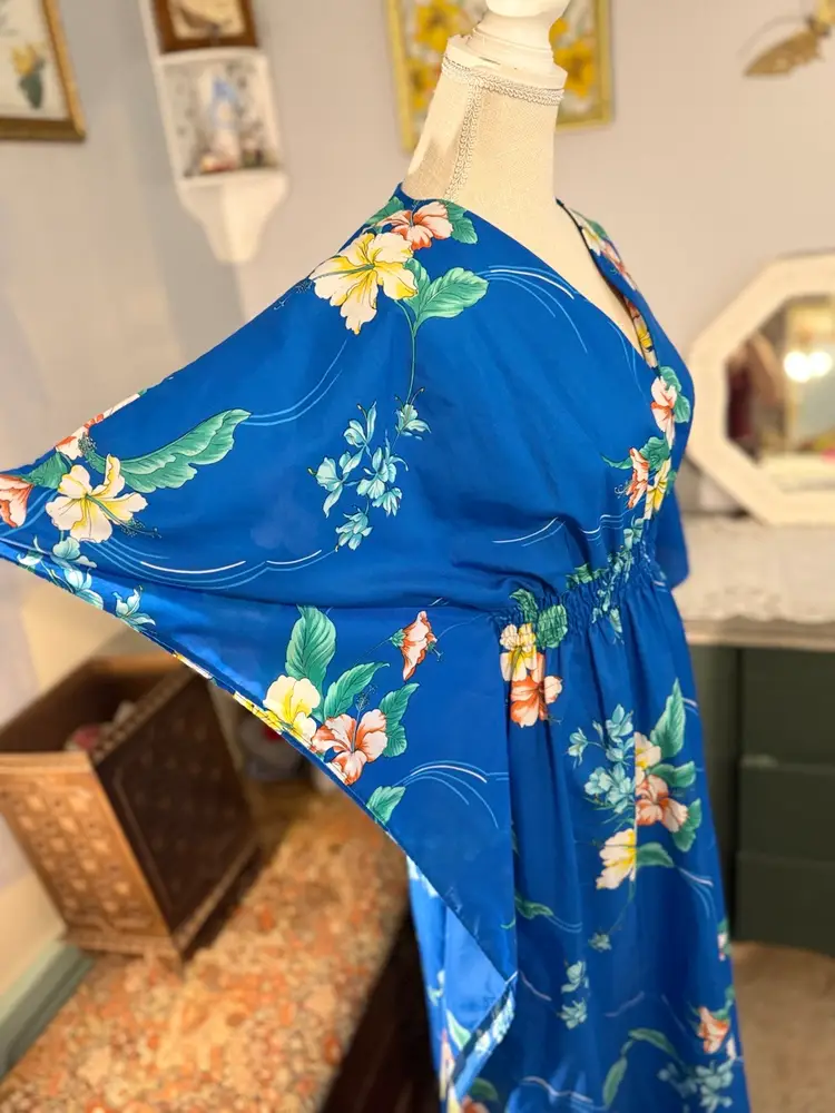 Vintage Royal Hawaiian floral printed caftan Amazing hibiscus printed caftan in the prettiest shade of blue. This dress is so light and flowy and the long exaggerated sleeves are everything 🤩In overall excellent condition has one spot on the back with a run in the fabric but it’s so vibrant and busy it isn’t noticeable when worn. Marked a OSFM measurements (flat lay) are as follows ⬇️ Waist - 10” at rest stretches to 23” comfortably Length - 43” under bust to bottom hem