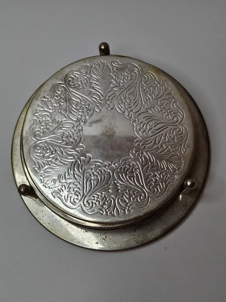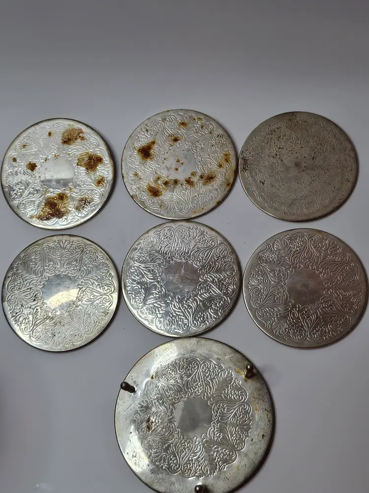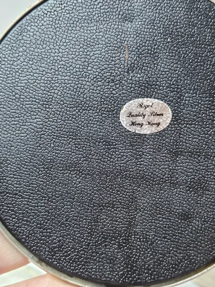 This vintage Royal Quality Silver Coasters Set includes 6 round coasters with a bordered design, made of silver material. The set comes with a carrying case for storage, and the coasters are stackable and washable. They are stain/water resistant and have an embossed design, adding a touch of elegance to any occasion. While some tarnish may be present due to age, these original coasters from Hong Kong are perfect for all occasions and make a stylish addition to any home barware collection.