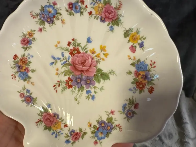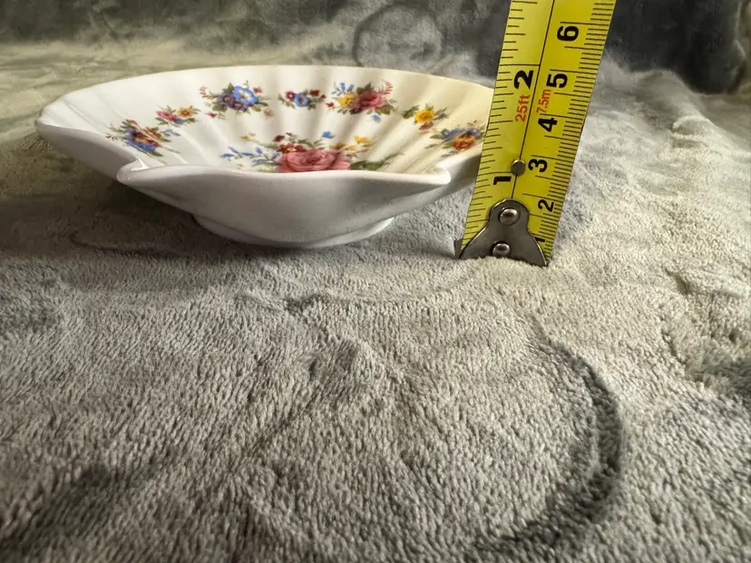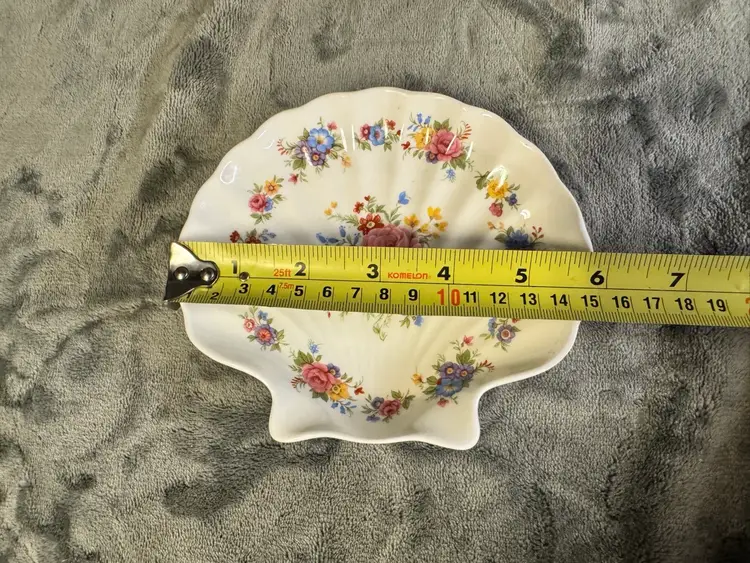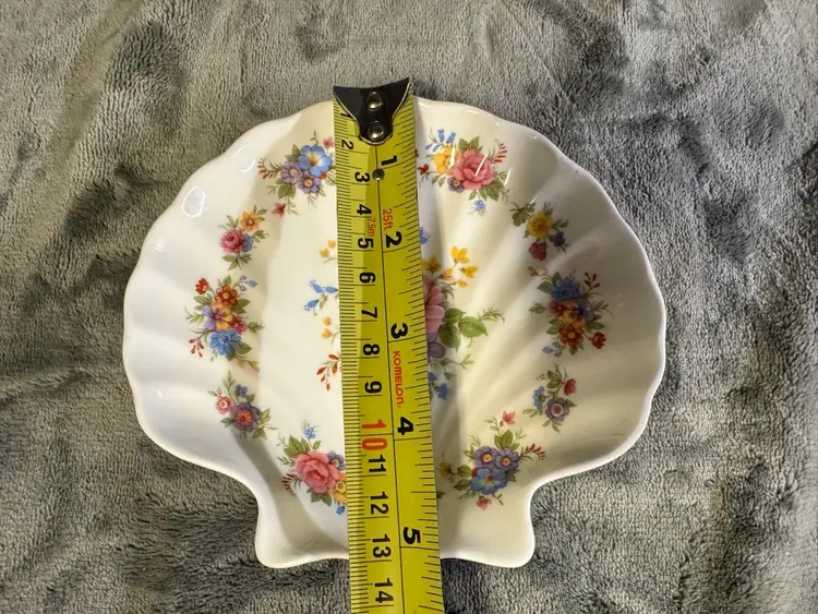 This vintage Royal Stafford fine bone china shell trinket dish, made in England, features a beautiful floral pattern with a pink rose design. The seashell shape and glossy finish add a touch of elegance to its decorative appeal. With its single compartment and original vintage design, this trinket dish is a charming and collectible piece perfect for storing small treasures or jewelry. Excellent condition. No chips, cracks, scratches, or crazing. See photos for measurements.