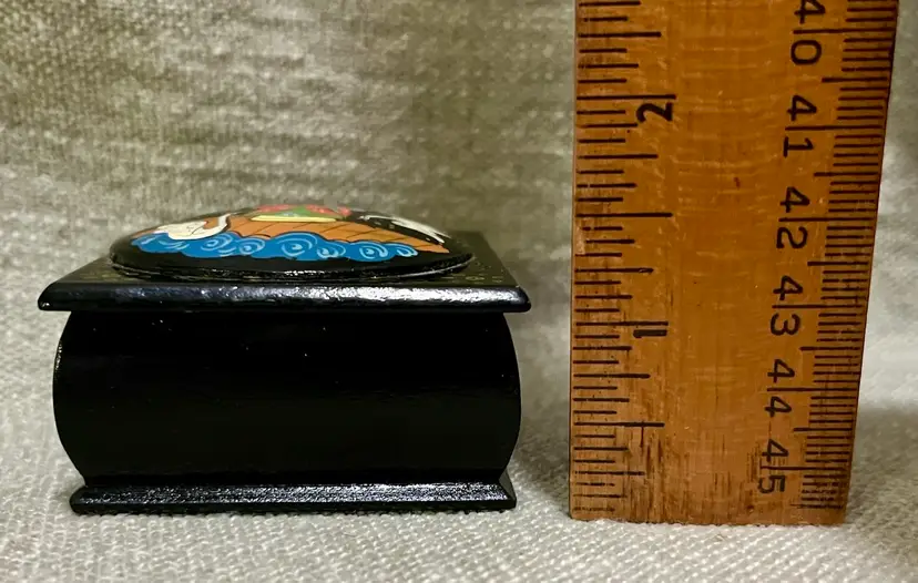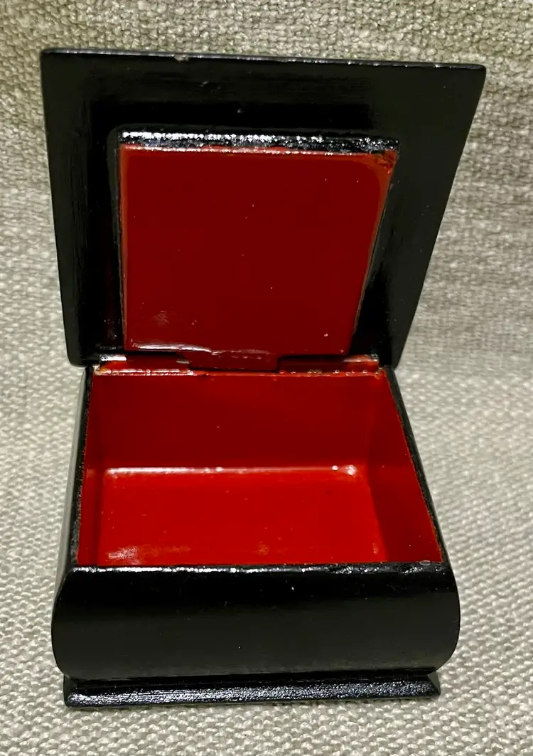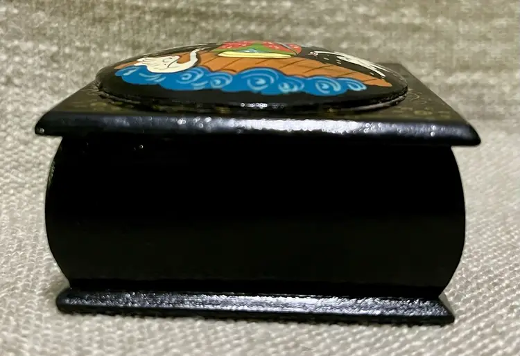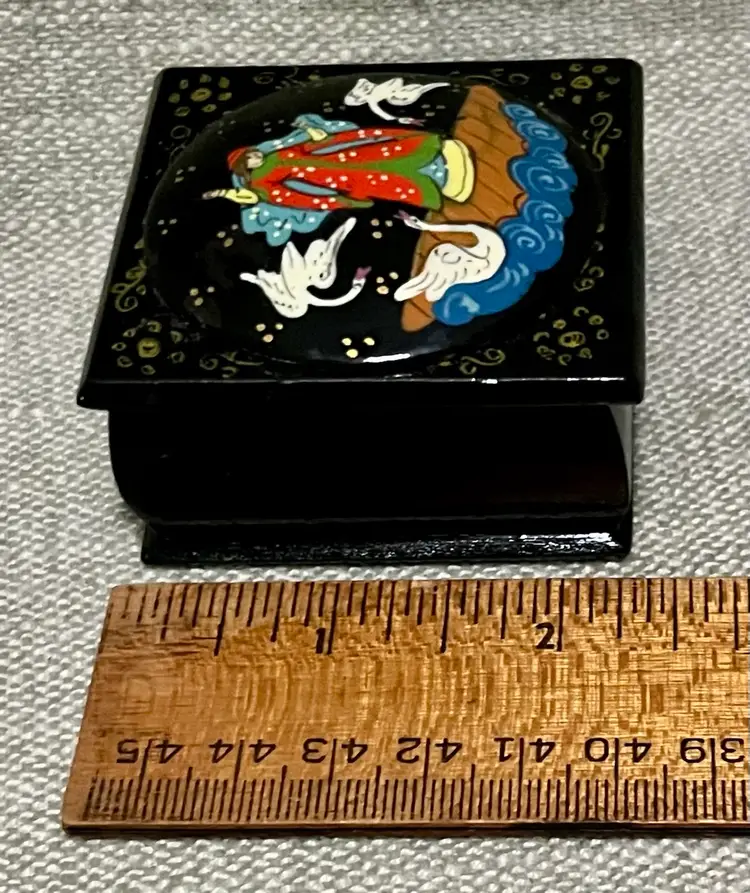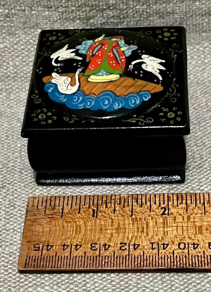 This vintage Russian black and red lacquer hinged lid box features intricate hand-painted artwork (based on the irregularities of the painting) of a magic swan and geese on what appears to be a raised lid with red interior. Measuring 2.25 x 2.25 inches, this traditional piece showcases the beauty and craftsmanship of Russian culture. A charming addition to any collection or decor inspired by Russian artistry and folklore, fairytales of the culture. These boxes are primarily made from papier-mâché, constructed from layers of cardboard, glued, pressed, and cured for weeks to ensure durability. The boxes are soaked in hot linseed oil for waterproofing, painted—often with oils or tempera—coated with multiple layers of clear varnish, and traditionally feature a red cinnabar-colored interior.