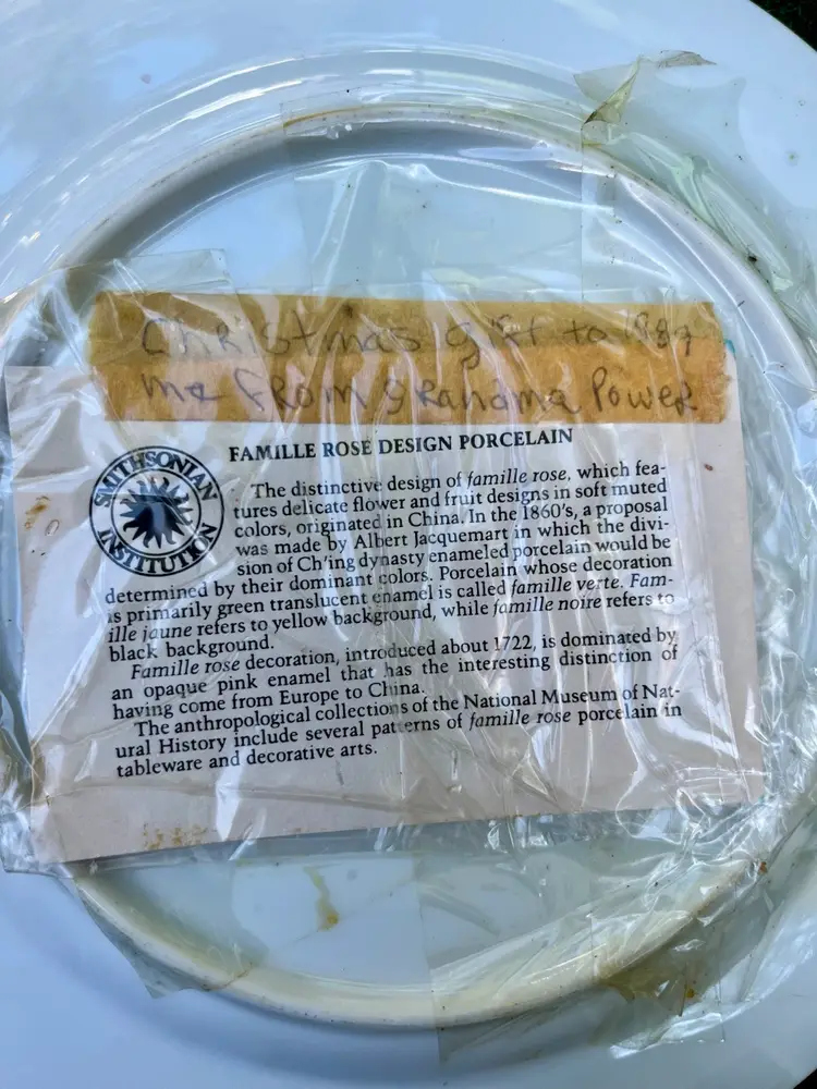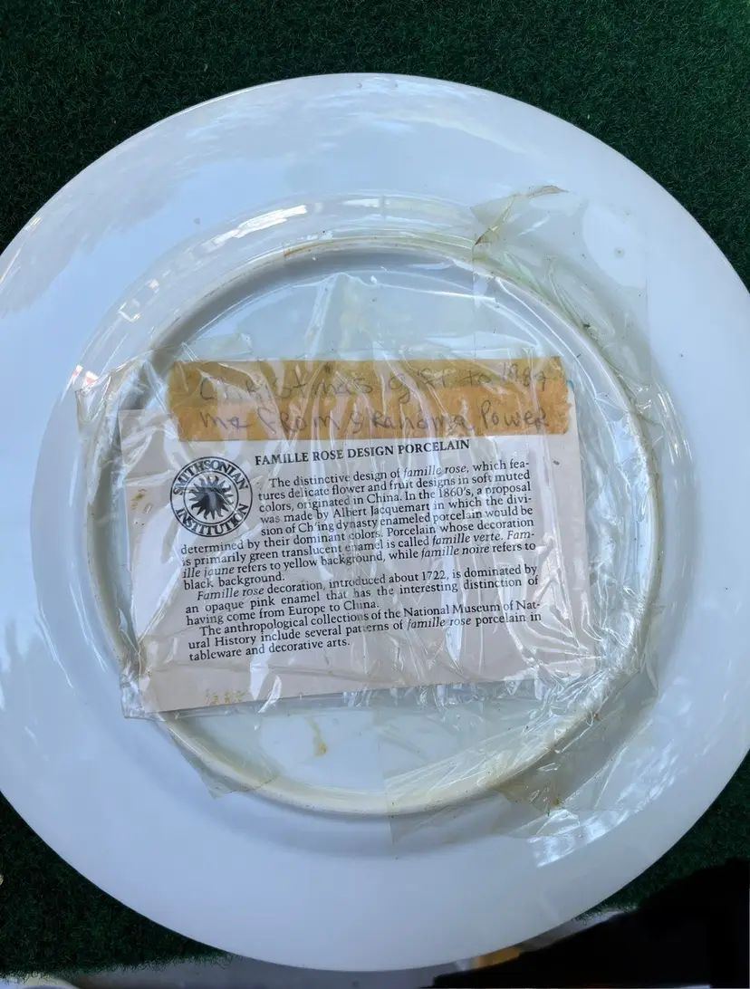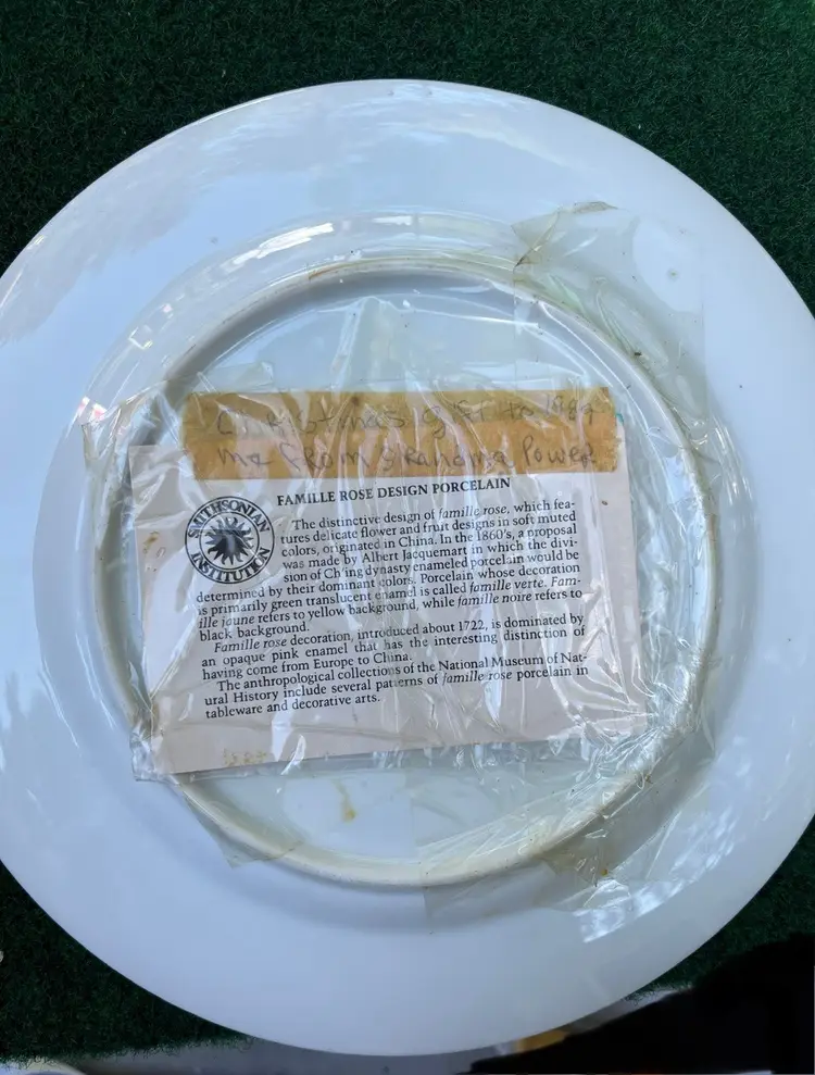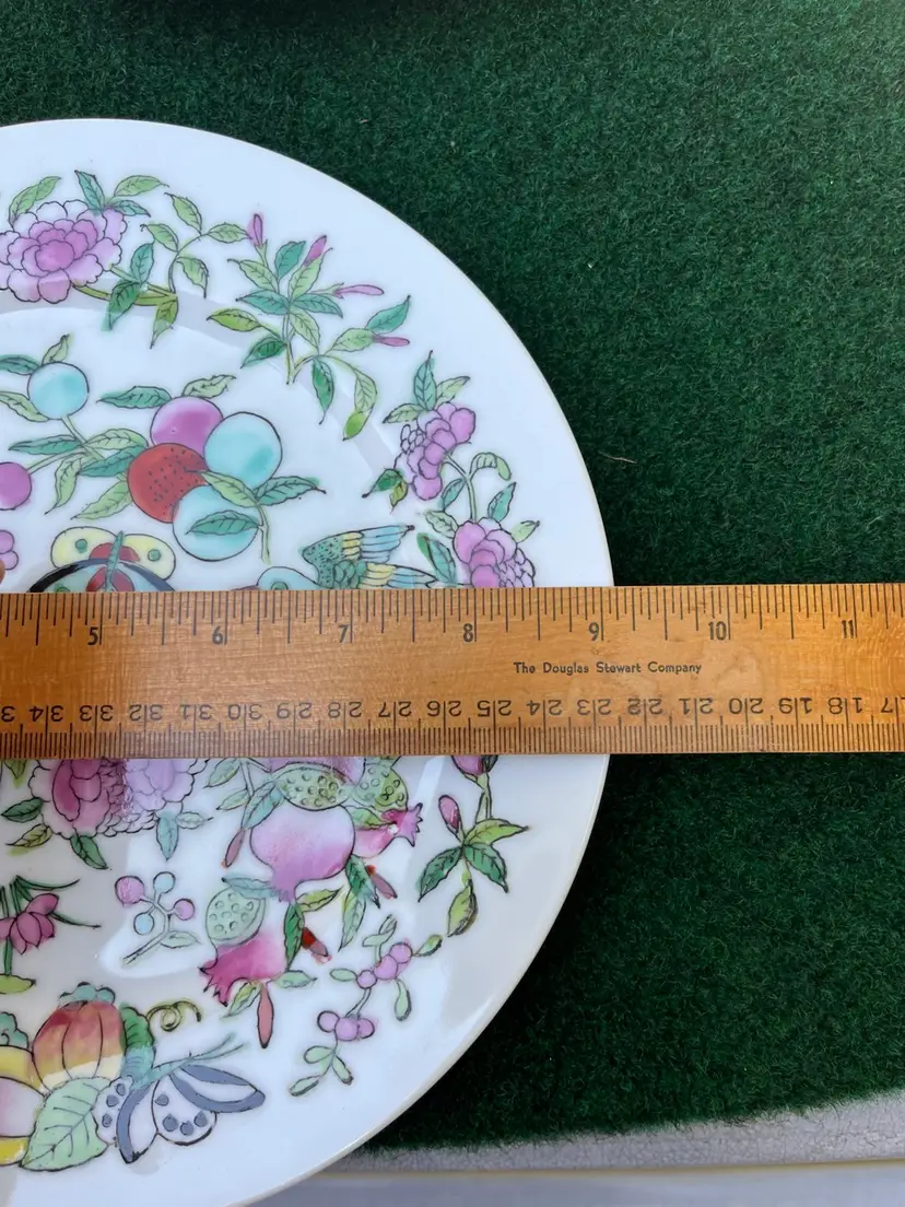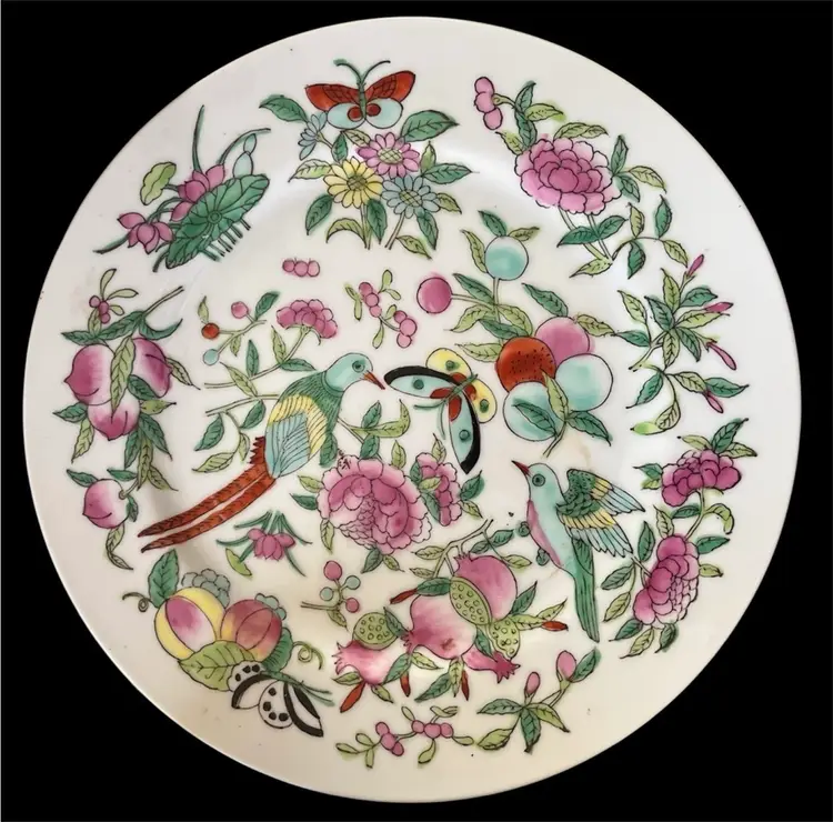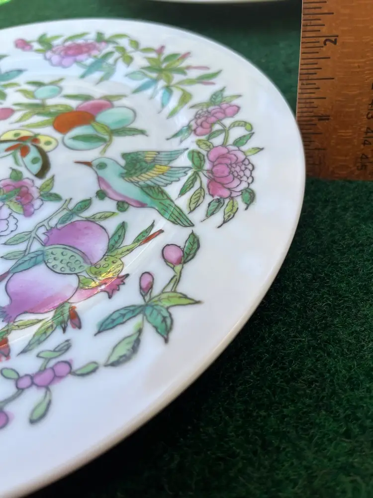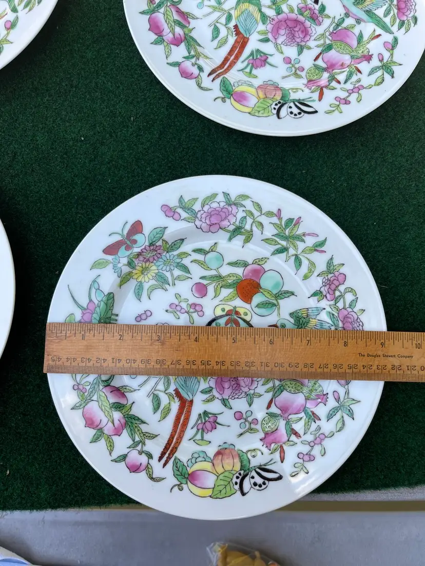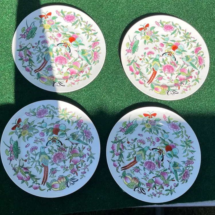 This set of 4 vintage 9" Famile Rose porcelain plates features intricate designs of birds and butterflies in a chinoiserie style. Imported from Europe to China, these plates showcase traditional Chinese culture with a touch of European influence. Not handmade, these plates are perfect for collectors interested in Asian cultures and ethnicities from the early 20th century. The ornate patterns and craftsmanship make them a unique and decorative addition to any collection. On the back of one plate adds a “new” level of provenance with an attached-by-tape note.