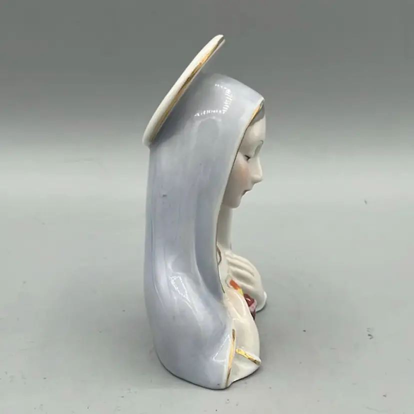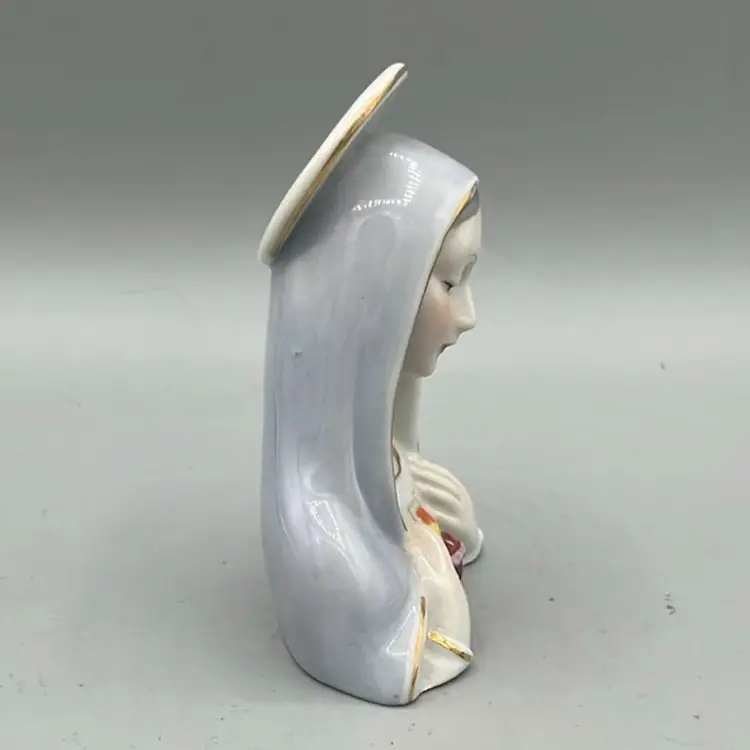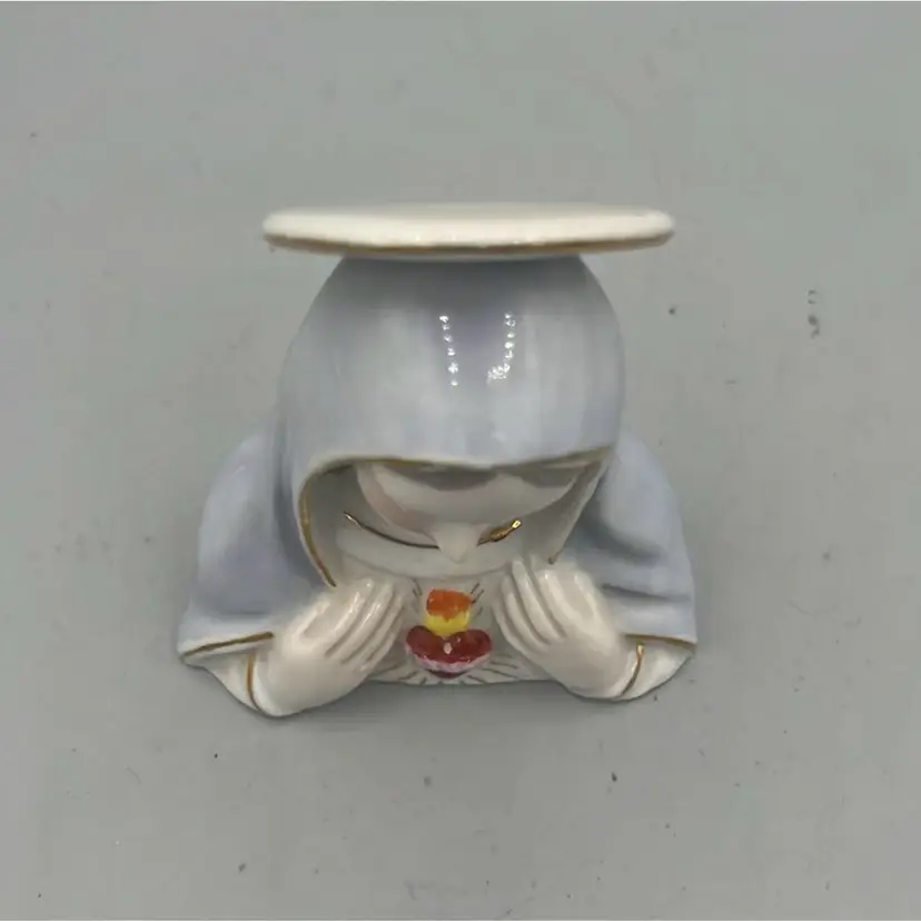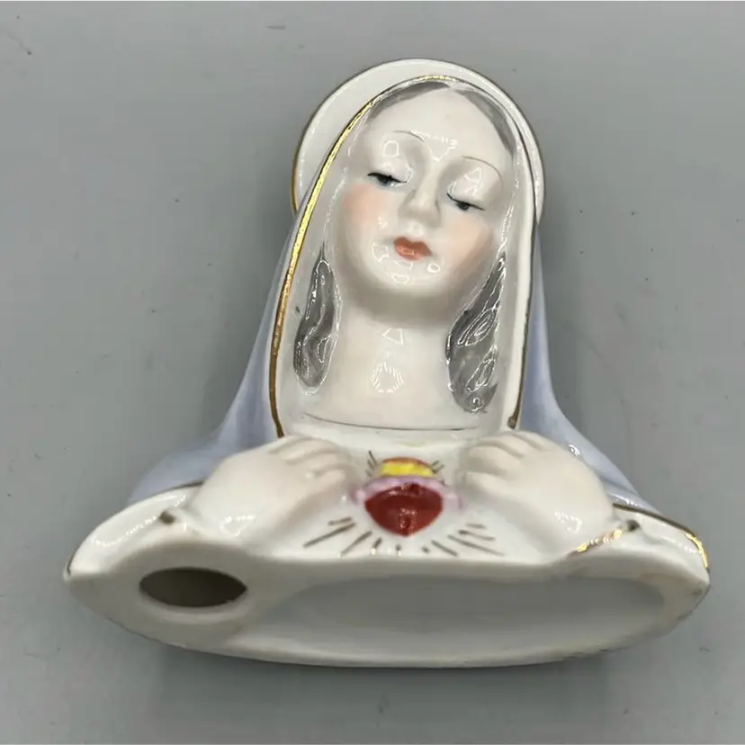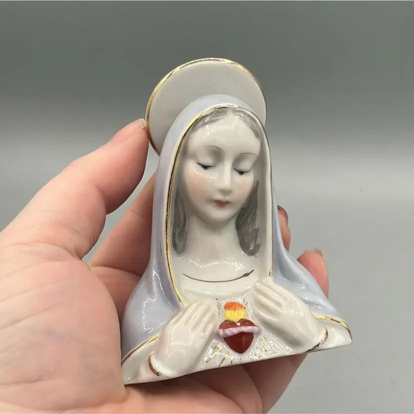 Sweet Mary porcelain bust with sacred heart detail. Pastel shroud and halo with gold detail as well. Great addition to any religious collection. Perfect size for an assemblage as well.