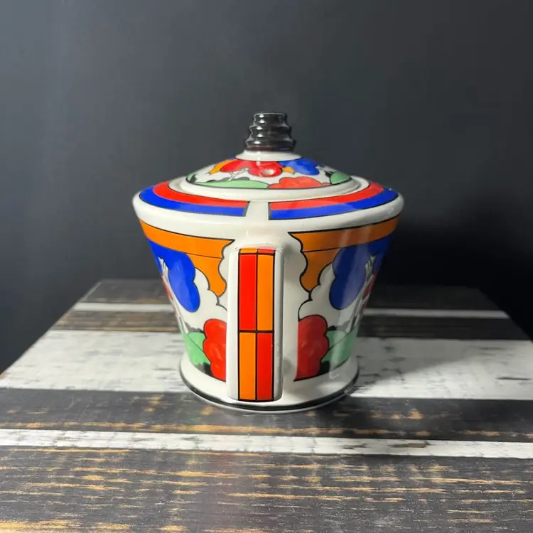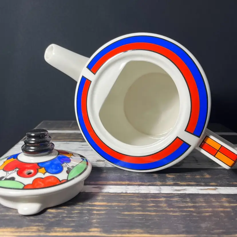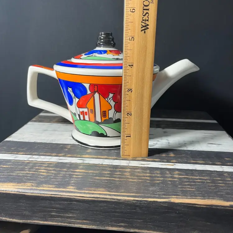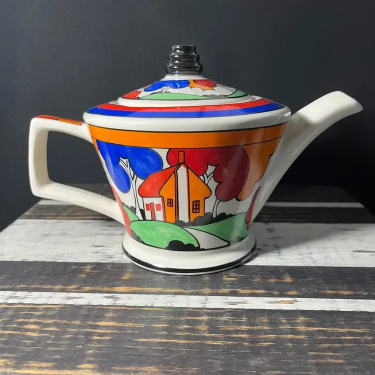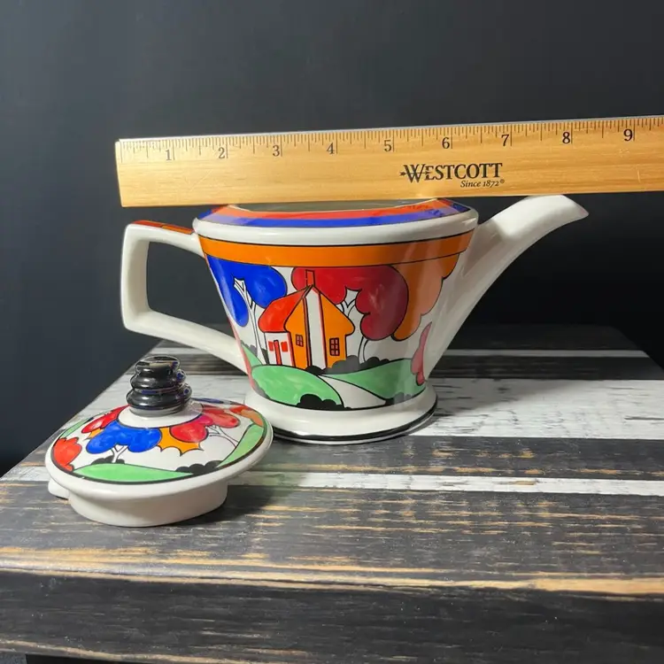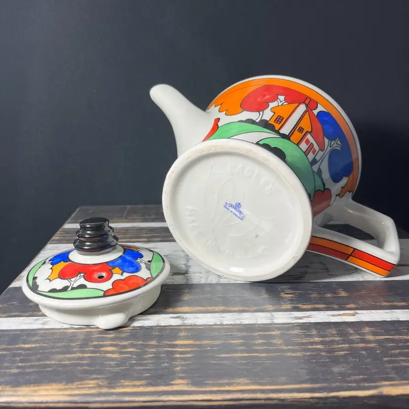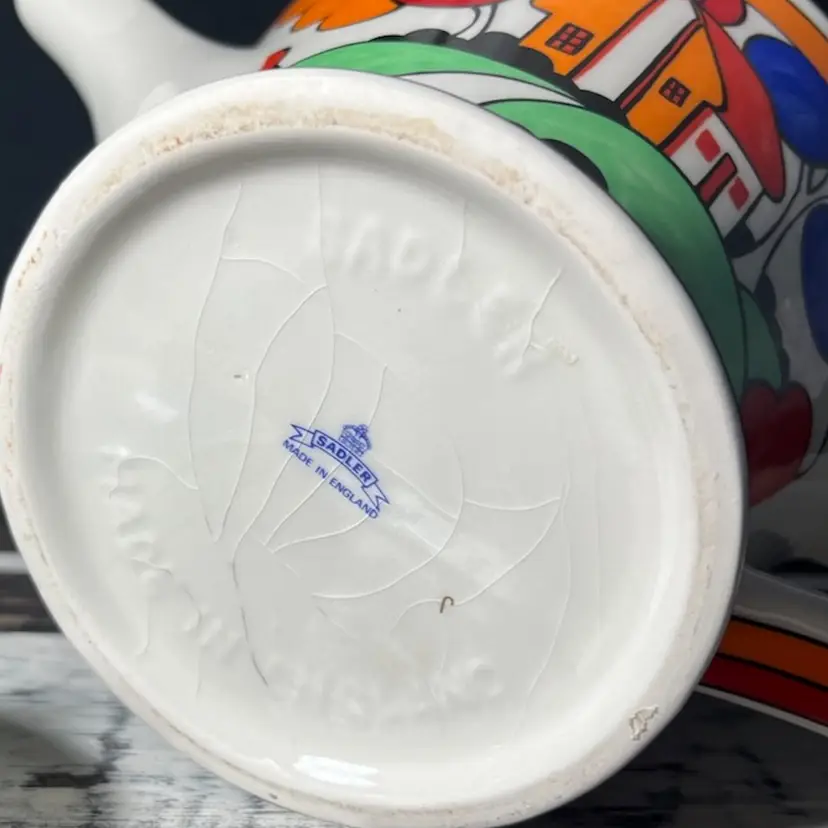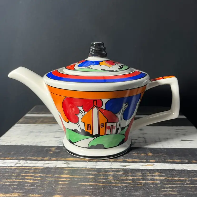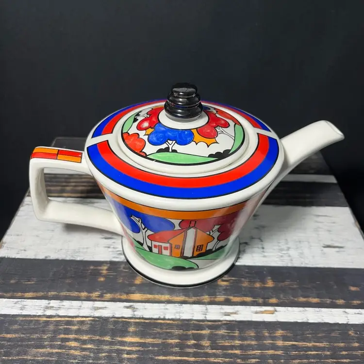 #1014 VTG Sadler Made In England Art Deco Farmhouse Teapot Inspired By Clarice Cliff. Some crazing mostly on bottom. Measures 5.25” x 8.5”.