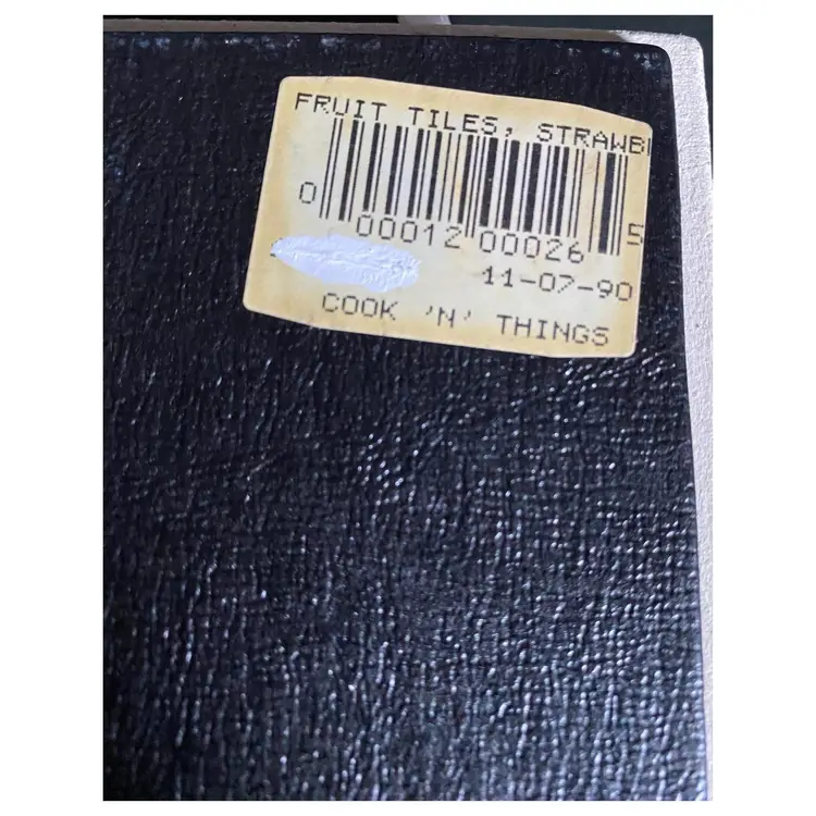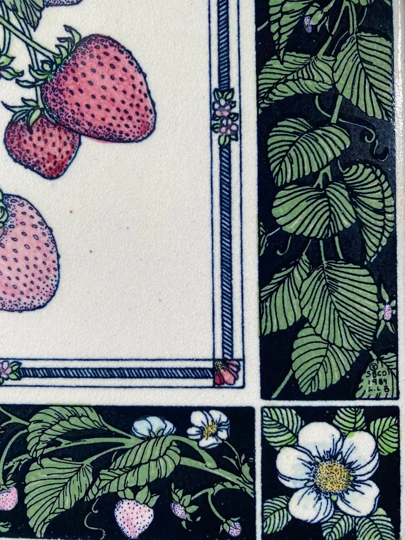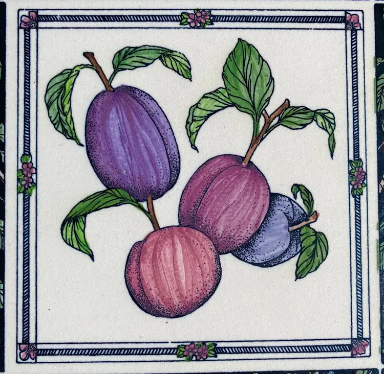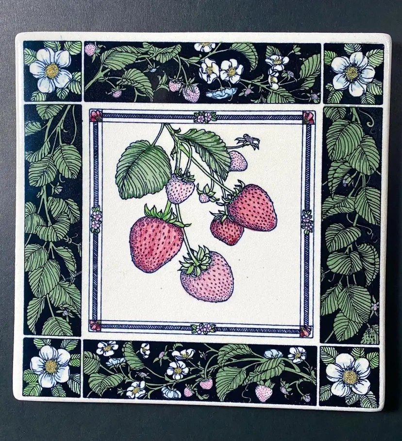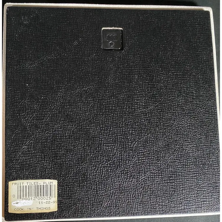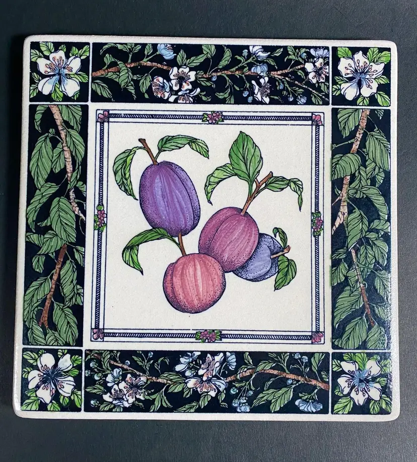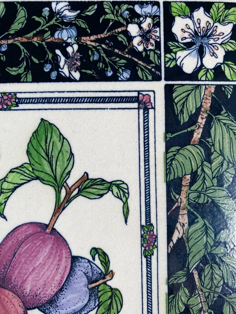 These charming trivets feature a 9 patch quilt block with fruit in the large center block. Both tiles are surrounded by a narrow border and the outer blocks are pink strawberries, white blossoms and green leaves on black. The other tile is surrounded by a narrow border and the outer blocks are purple plums, white blossoms and green leaves on black. These tiles were produced in the 1990's using studio art pottery techniques, making them unique. The trivets can be used in any room and is perfect for displaying on a table or using as a hot pad. They would look great on the wall, too. Comes ready to hang. Measures about 7.75 in length by about 7.75 inches across by about .25 inches thickness. Has black cardboard on underside to protect surfaces. These trivets are brand new and in excellent condition. SET OF 2