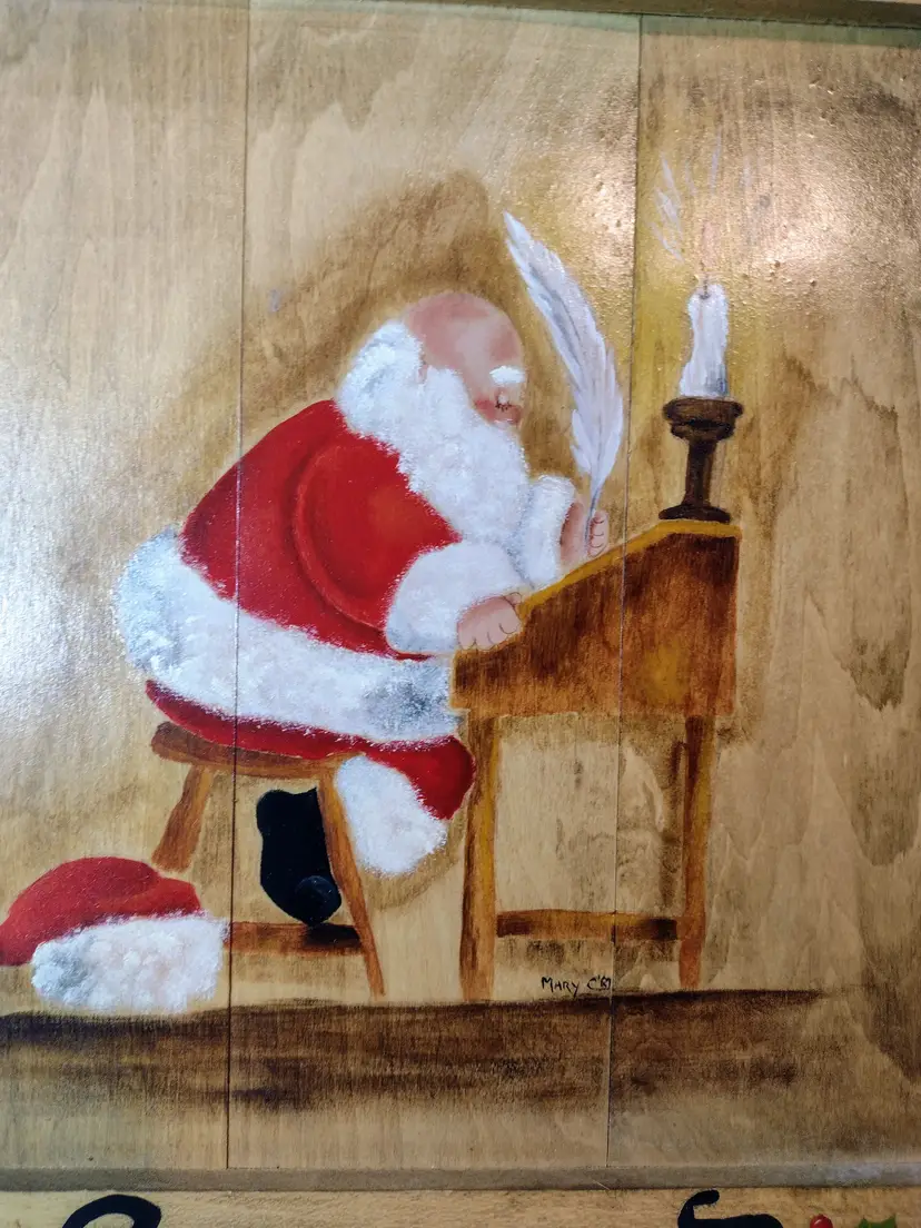 This is a sweet handpainted Santa sitting at his desk writing with an old school quill pen. This is the perfect decor and has an old school charm & is also signed by the artist. Piece measures 18" tall x 12" wide.