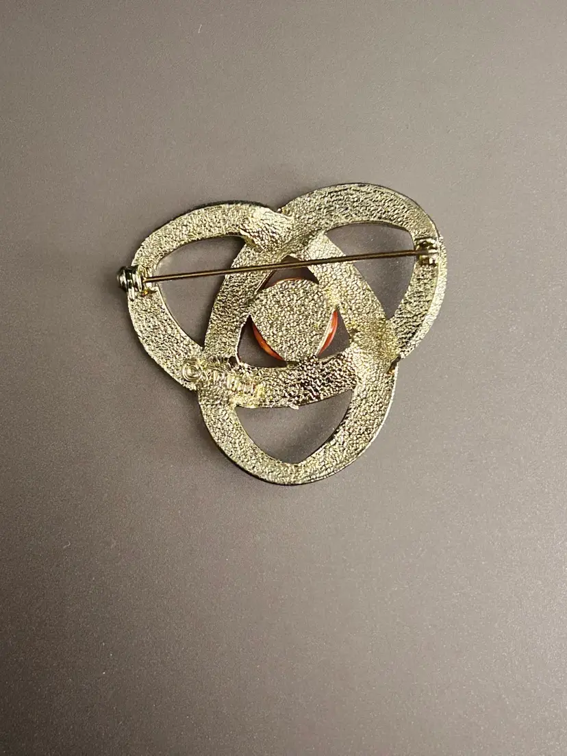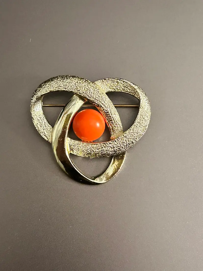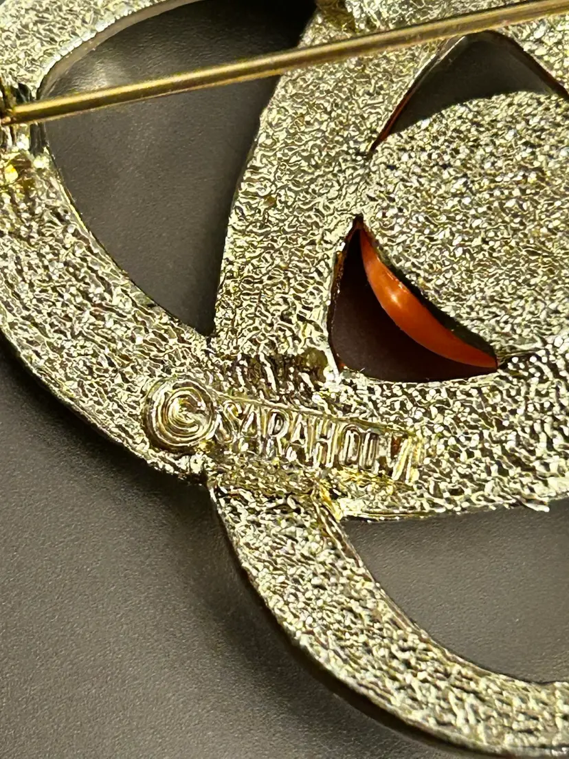 Vtg Sarah Coventry Gold tone textured brooch w/ orange cabochon accent, EUC. 1.75” X 1.75” Please see photos. Let me know if you have any questions.