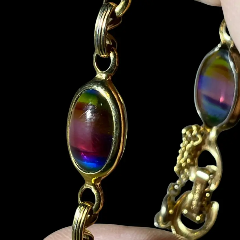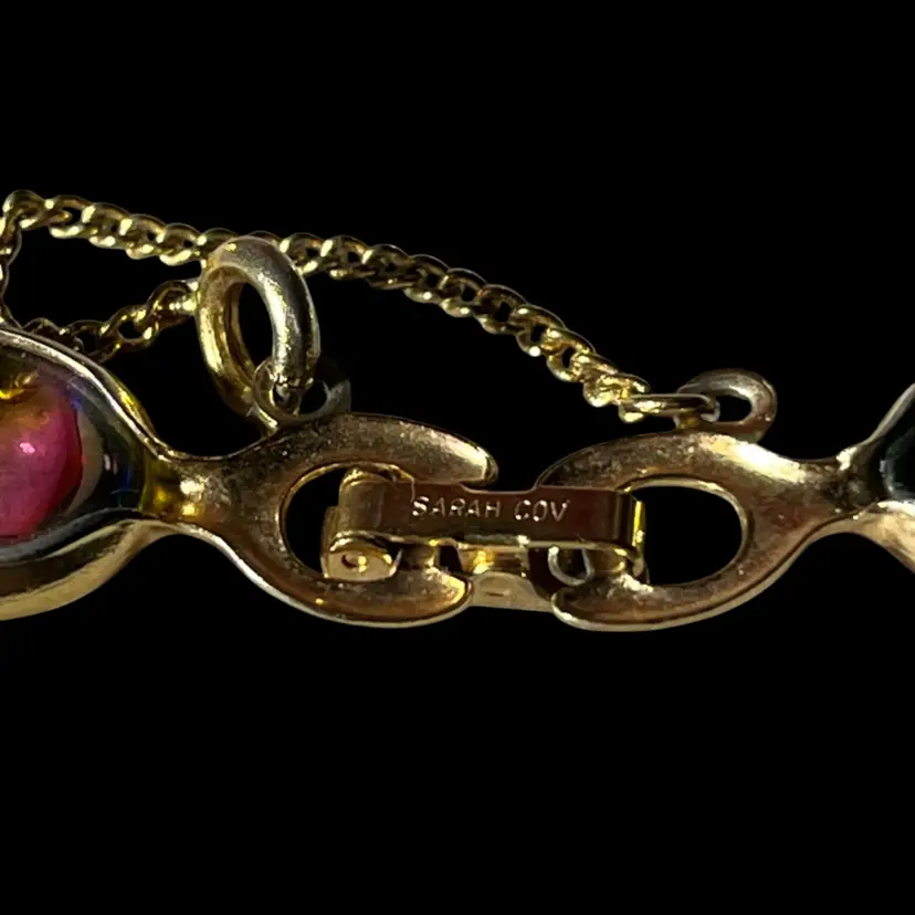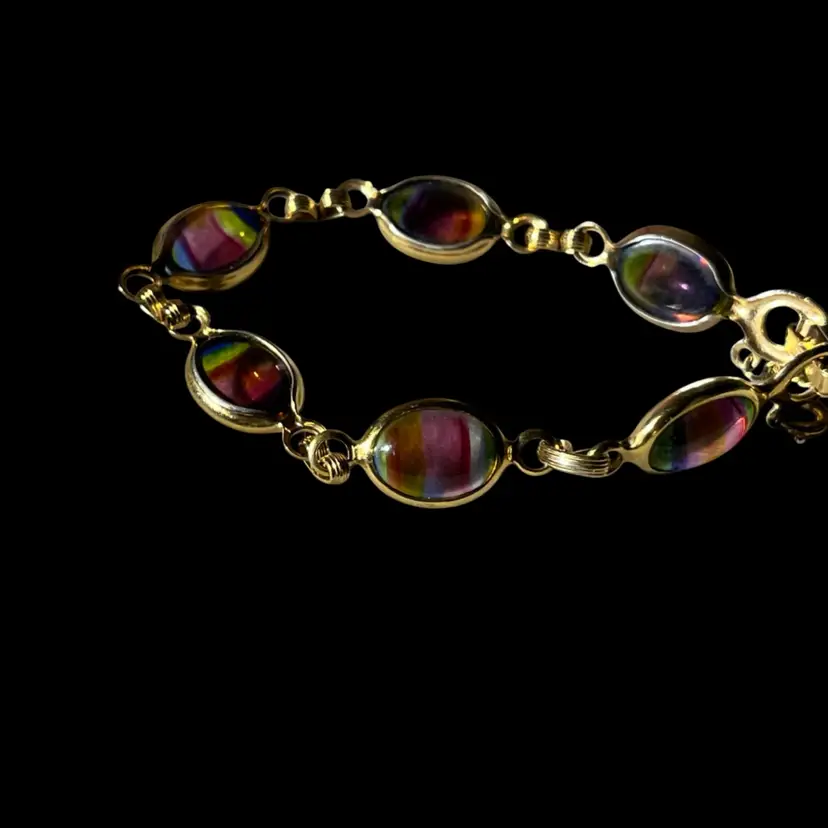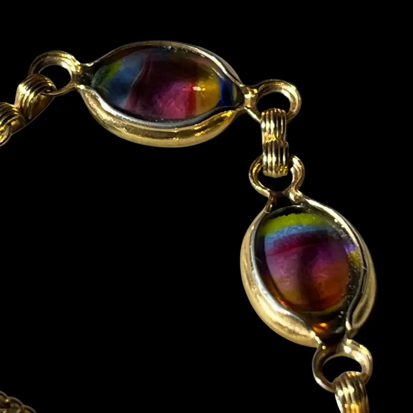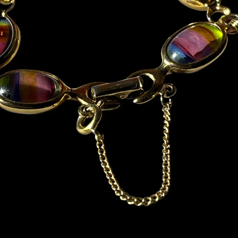 Vtg Sarah Coventry Harmony Bracelet Rainbow Glass GoldT 1960s Safety Chain 7.5”L