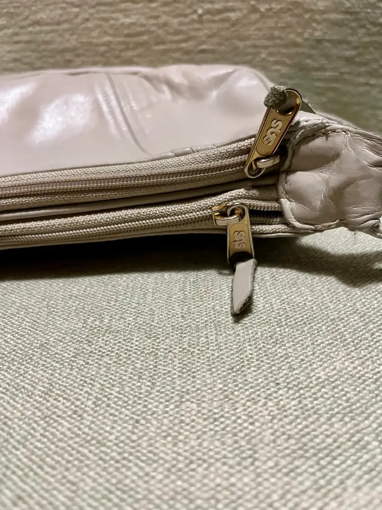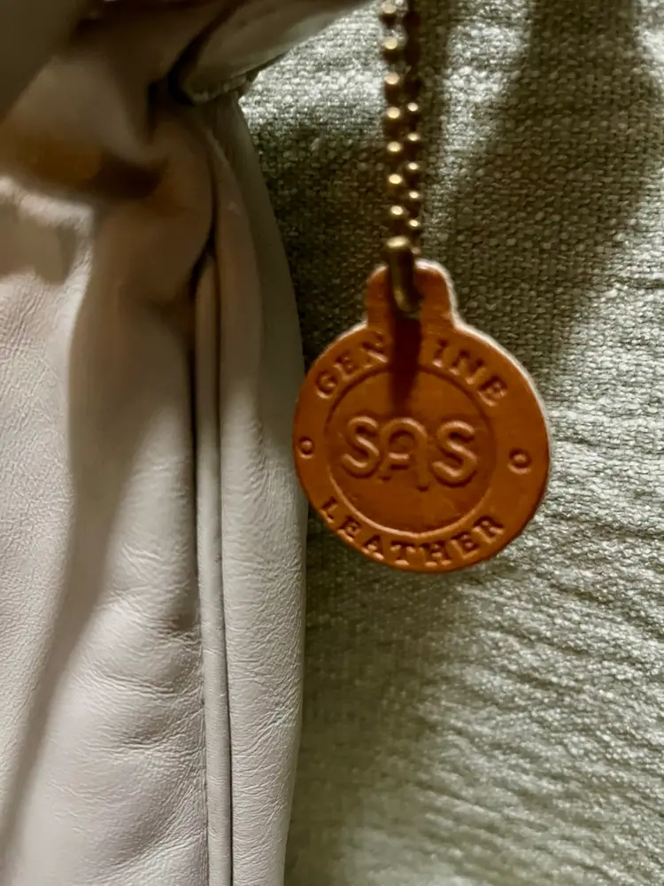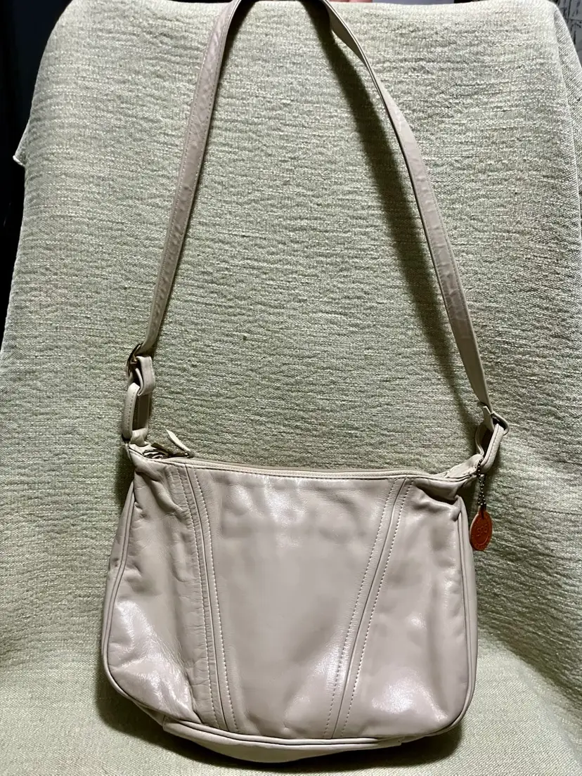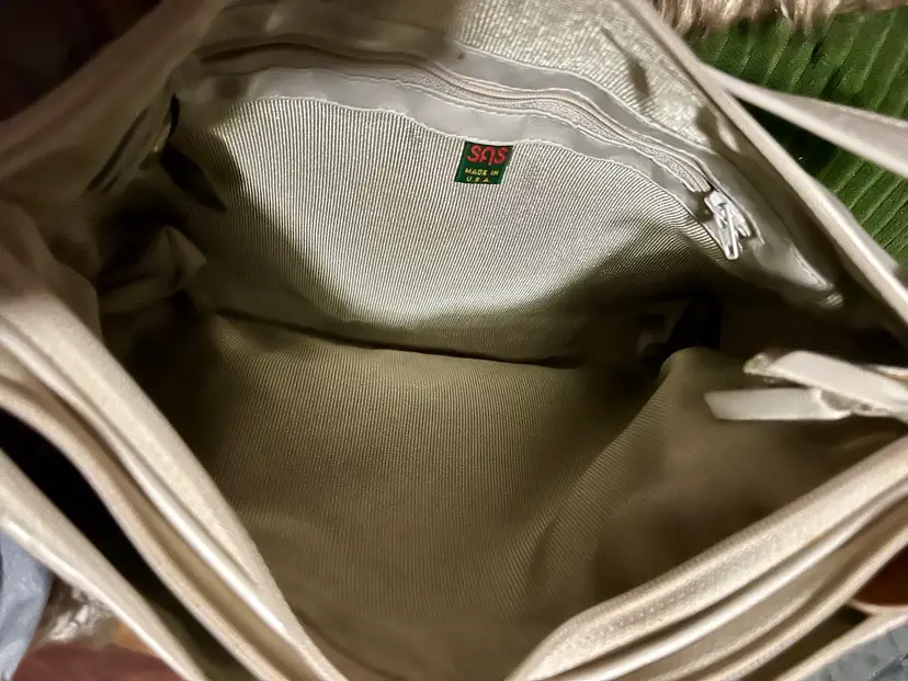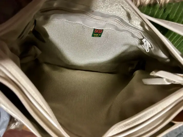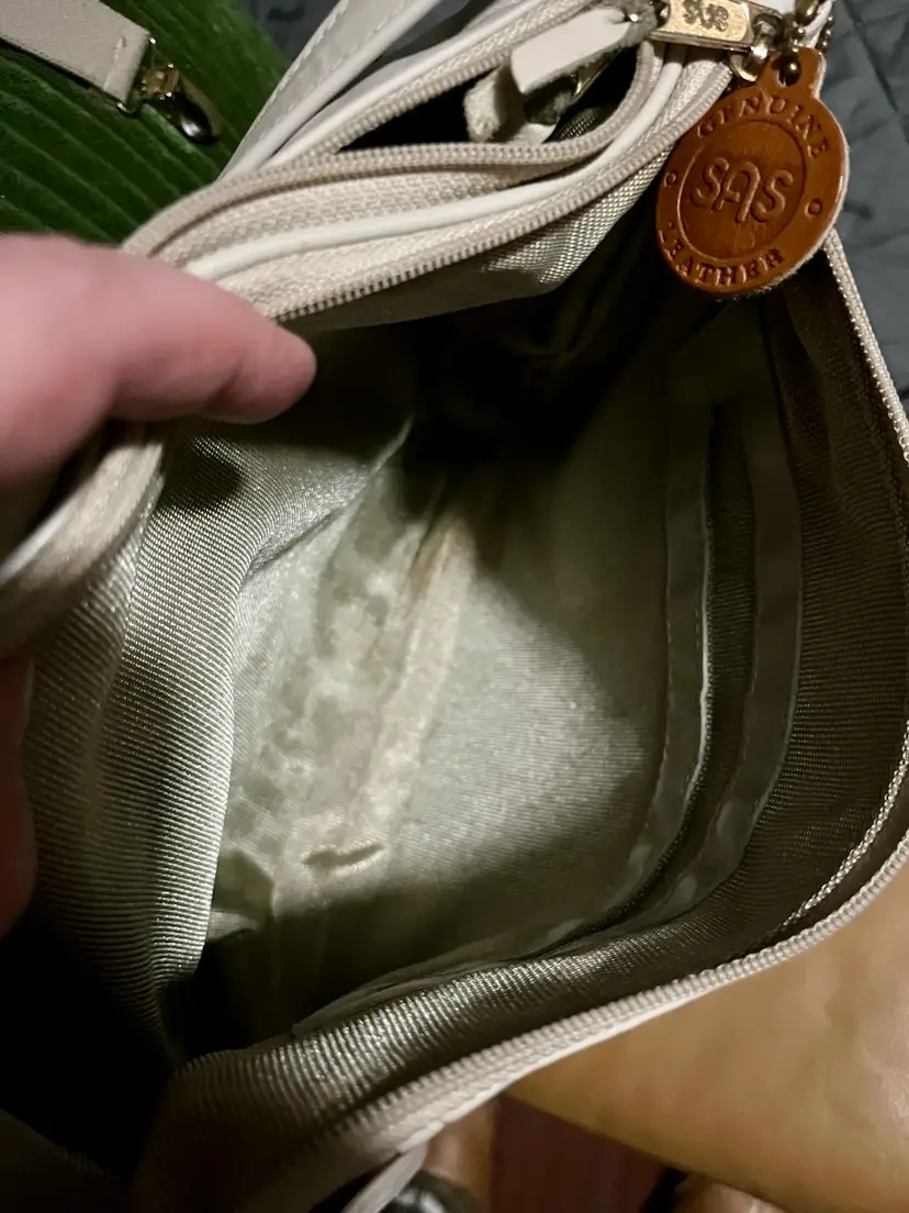 This vintage SAS cream-beige leather shoulder bag features a rectangular shape with a zip closure and gold hardware along with a leather logo key chain fob. The adjustable strap allows for versatile use as a snug crossbody or shoulder purse. Made in the USA, the bag has inner pockets and dividers, a cream-champagne lining, and a classic 80s-inspired design. Perfect for casual occasions, this medium-sized bag exudes a timeless style with a touch of nostalgia.