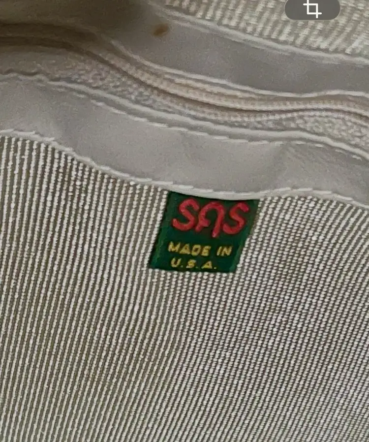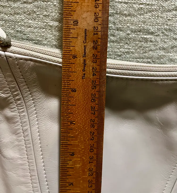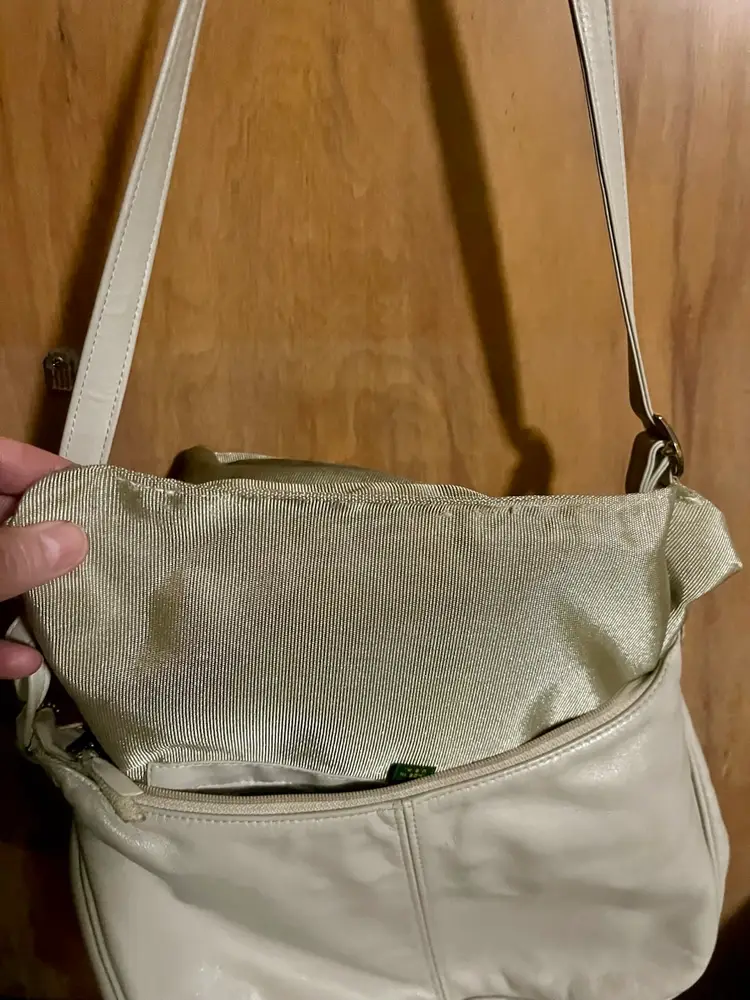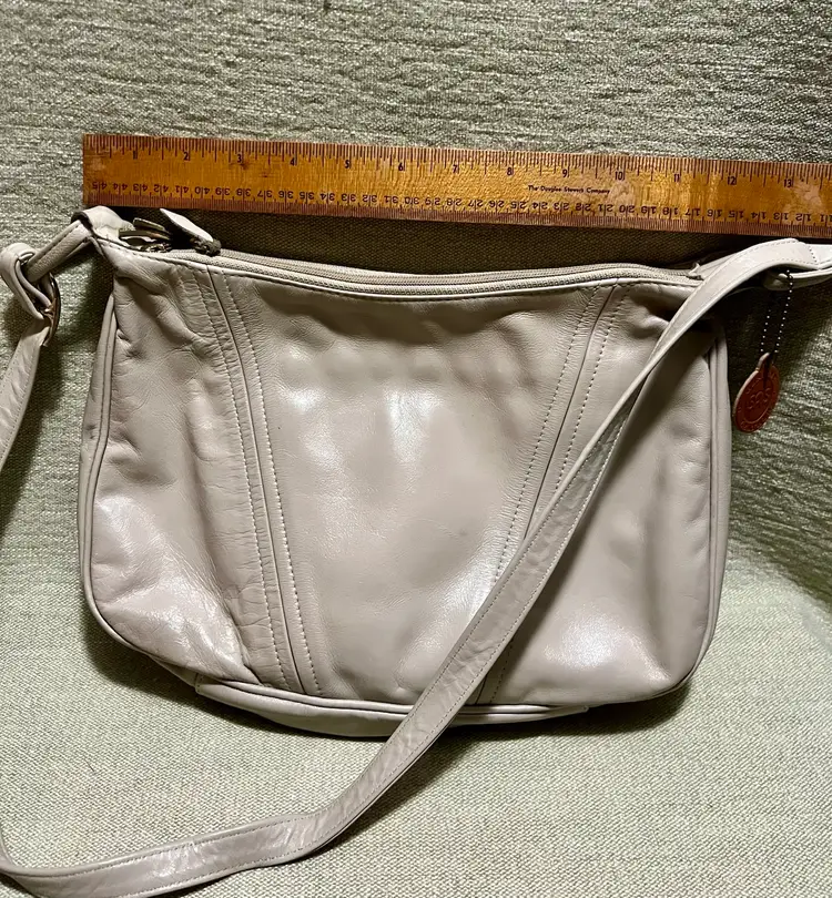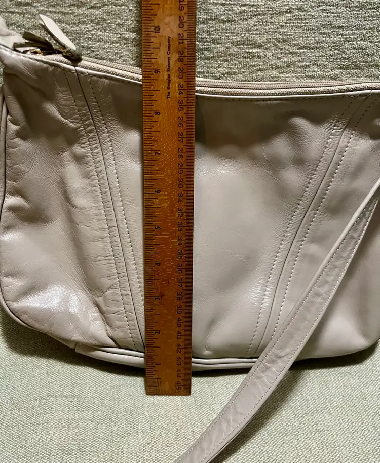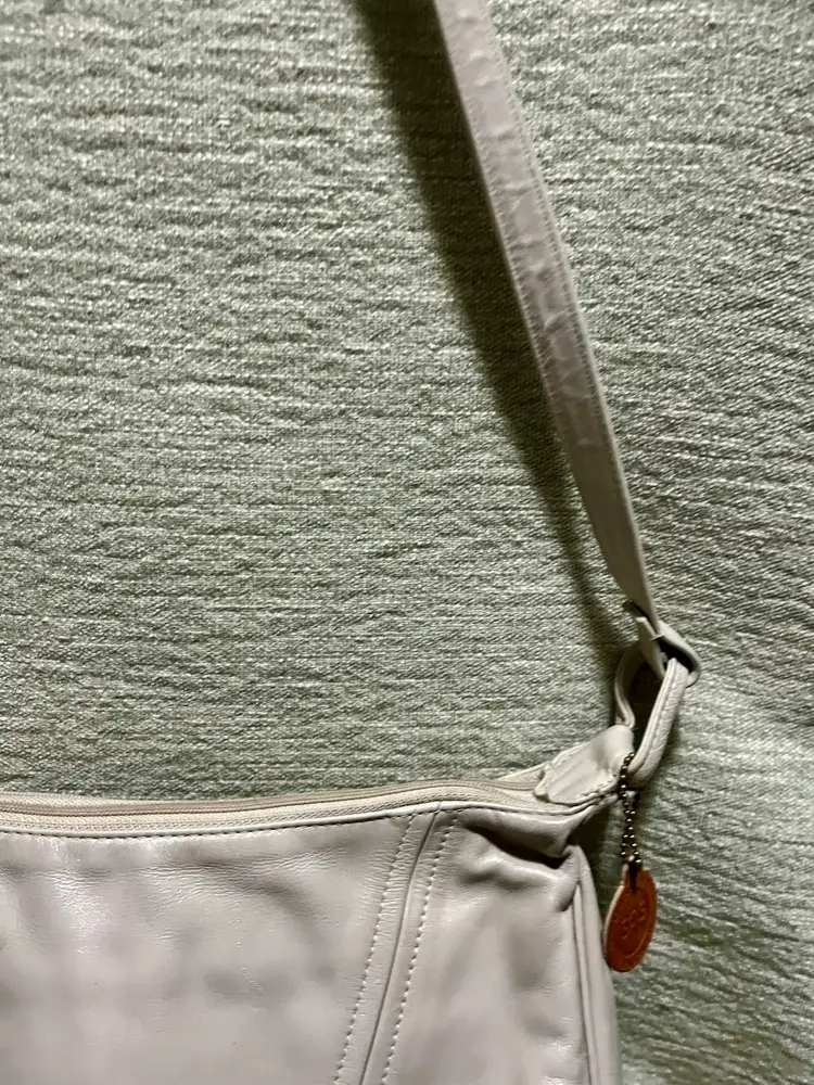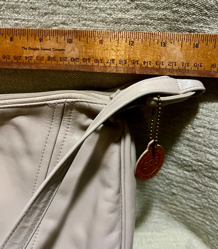 This vintage SAS cream-beige leather shoulder bag features a rectangular shape with a zip closure and gold hardware along with a leather logo key chain fob. The adjustable strap allows for versatile use as a snug crossbody or shoulder purse. Made in the USA, the bag has inner pockets and dividers, a cream-champagne lining, and a classic 80s-inspired design. Perfect for casual occasions, this medium-sized bag exudes a timeless style with a touch of nostalgia.