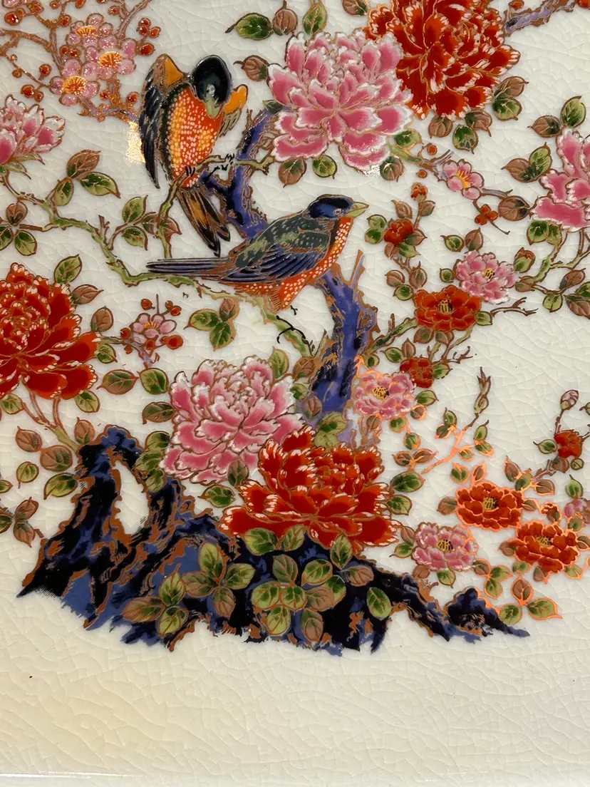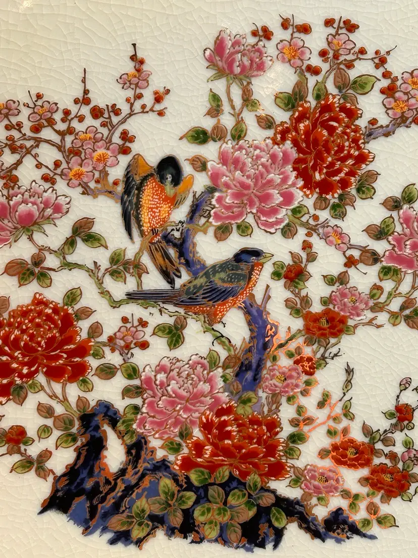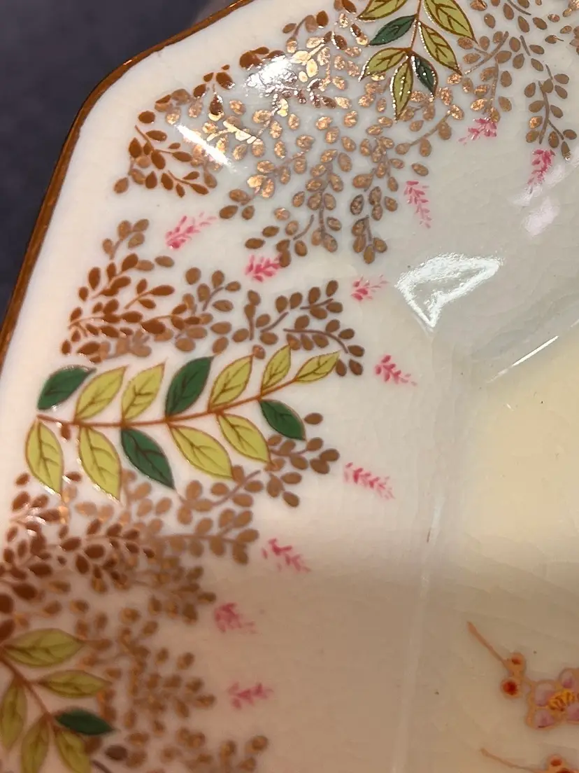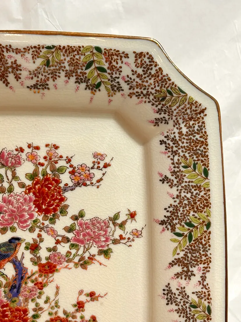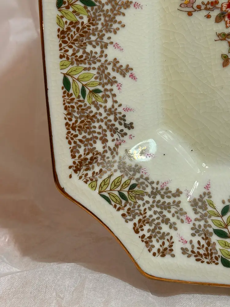 Vintage mid 20th century porcelain plate. Lovely motif of Nature featuring a gold and green botanical pattern trim. Wonderful landscape of Birds amongst Chrysanthemum flowers on an octagonal porcelain plate. Smoke pet free home. Some expected age-related yellowing & crazing but still lovely enough to display. No chips, scratches or paint loss. 10.5” Diameter - Handpainted - Gold Trim - Stamped ** travel over to my listings for many beautiful, Home Decor items, including vintage.