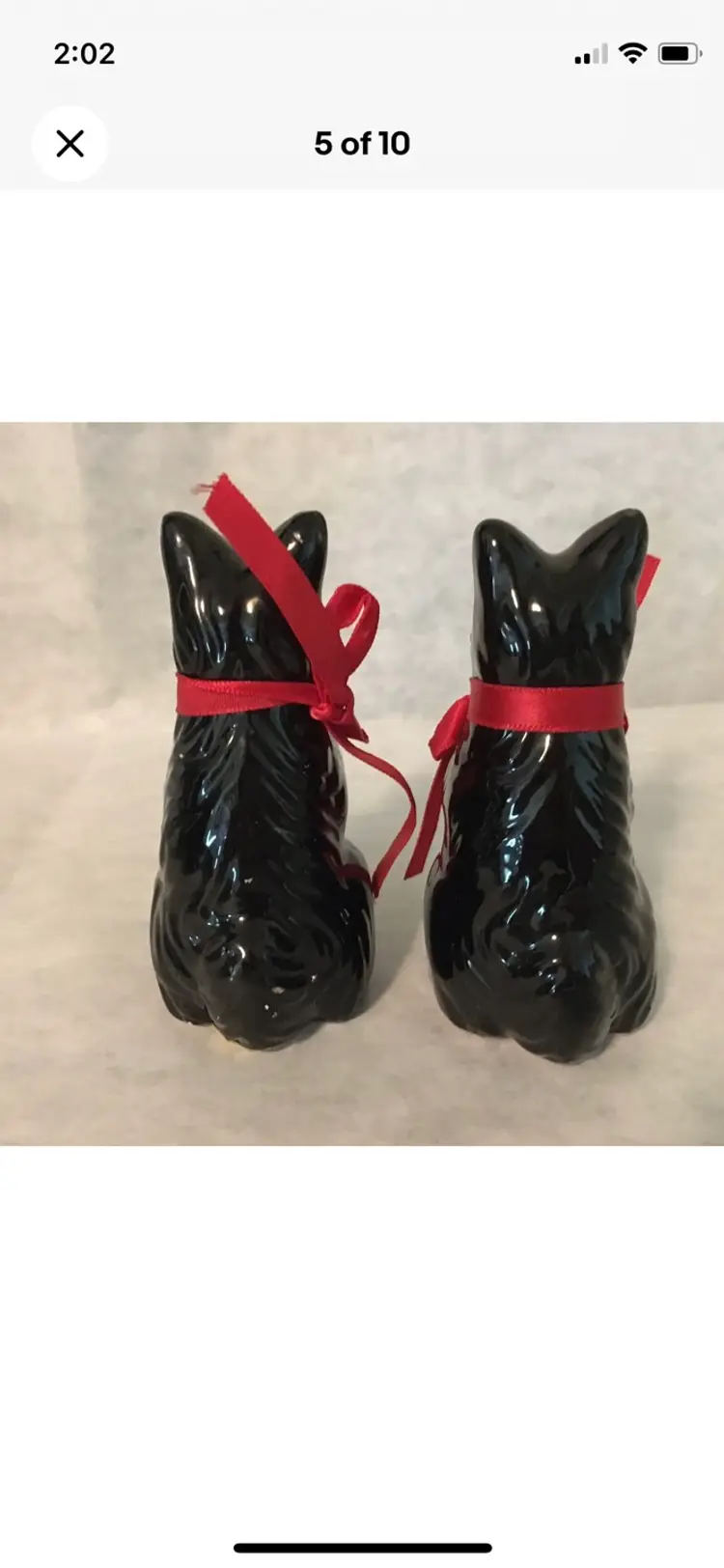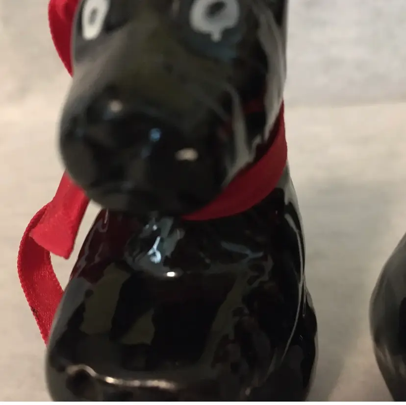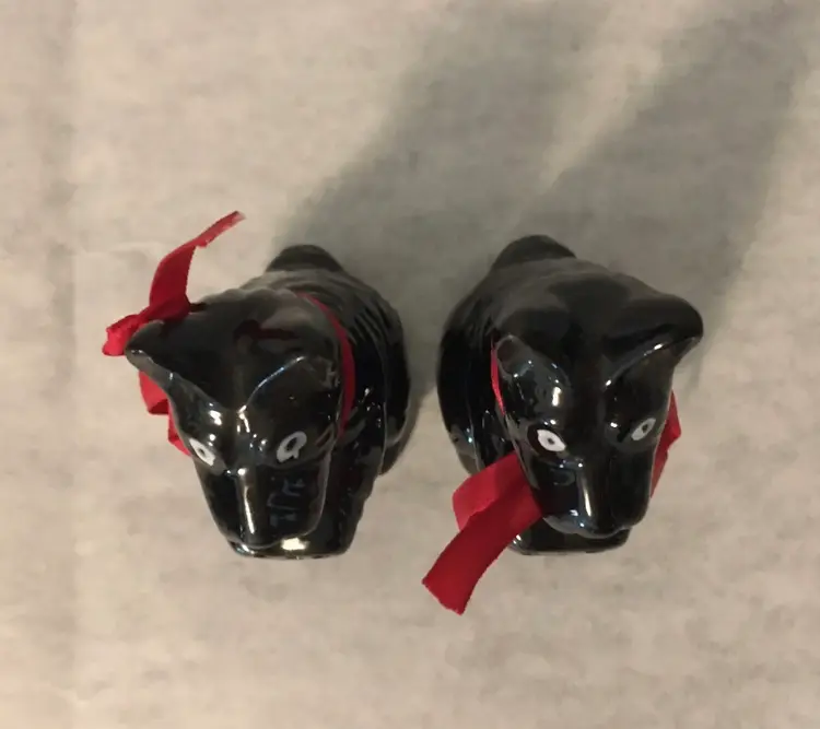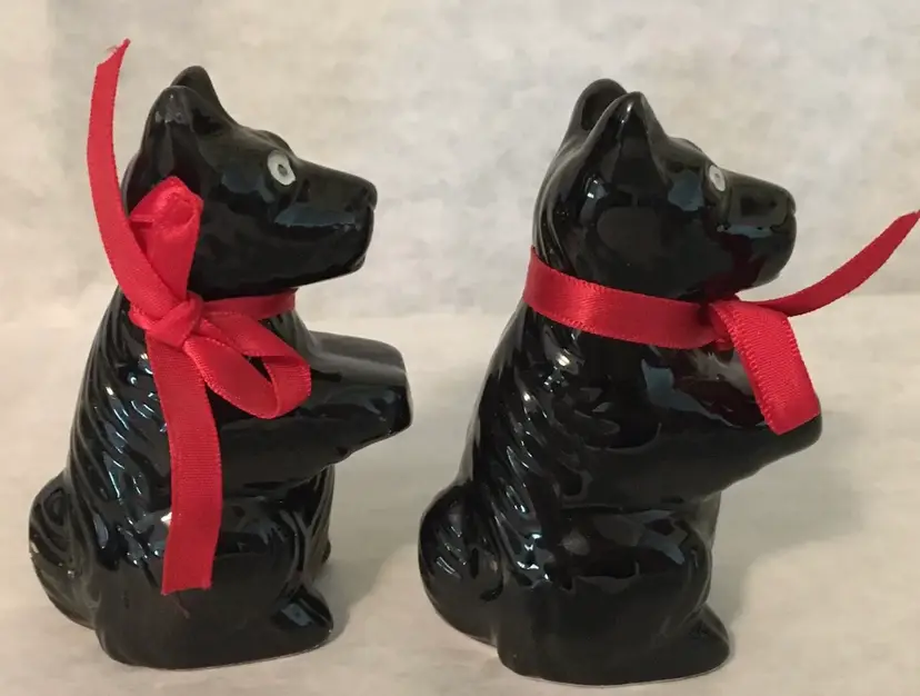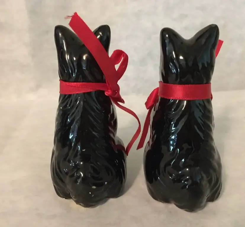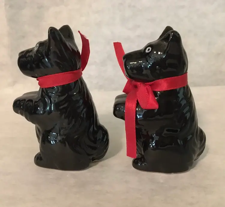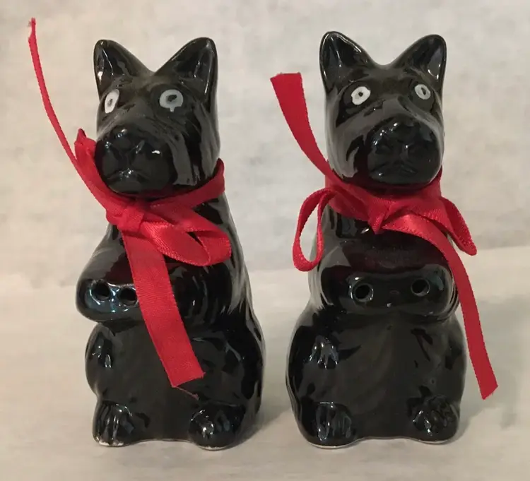 VTG Scotty Dog Salt and Pepper Shakers ArtMark Black Red Ribbon 3.25” H. Condition is "Used".