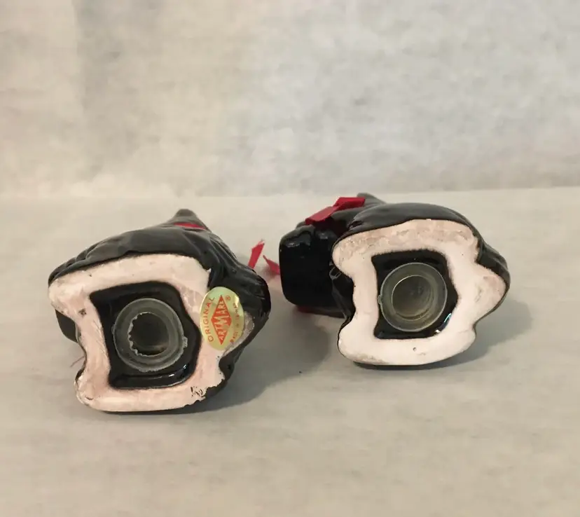 Artmark. Made in Taiwan. Matching set. Holes are in front paws. Salt has 3 holes. Pepper has 2 holes. Original red ribbons. Both have plastic stoppers. Artmark foil sticker. Approx 3.25” H.