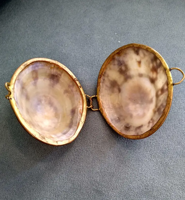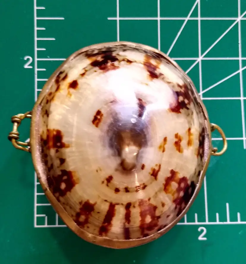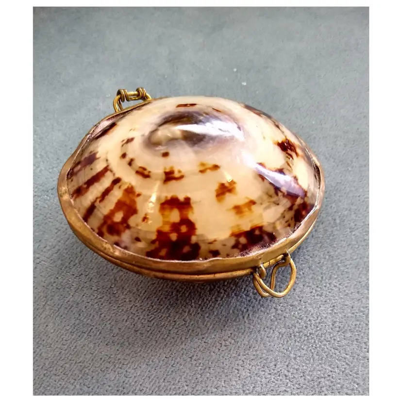 Charming vintage trinket box featuring a natural seashell lid with a brass base. Perfect for storing small treasures or as a decorative piece. Measures approximately 3 inches in diameter.