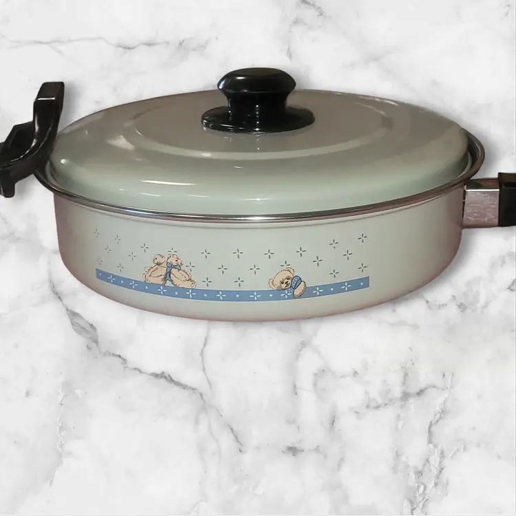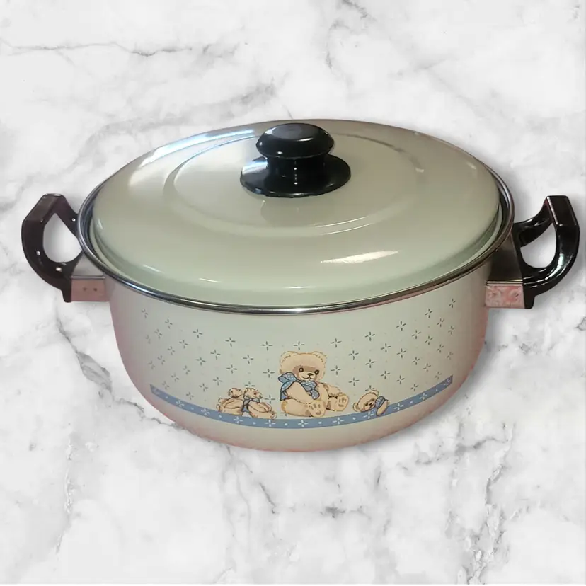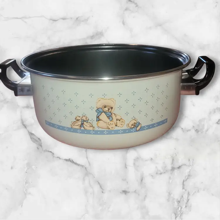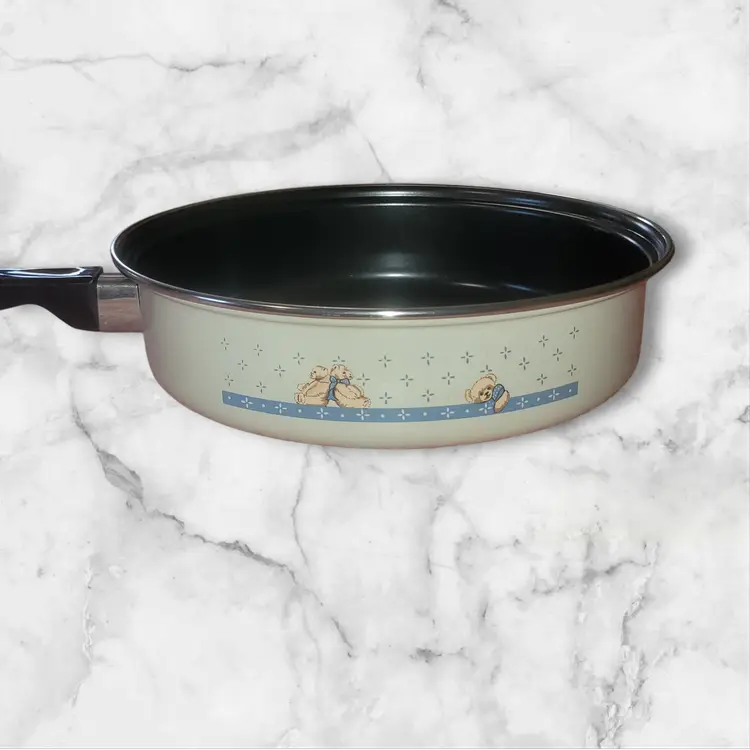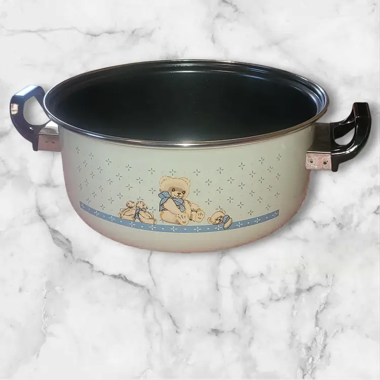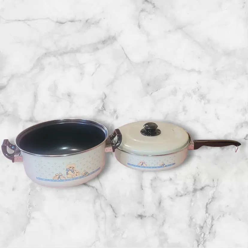 Vintaged set of 2 Tienshan Theodore Country Bear Pans. Includes one Stock Pot, one 10 inch Skillet and one lid that fits both pans. Pans are in excellent condition as seen in photos.