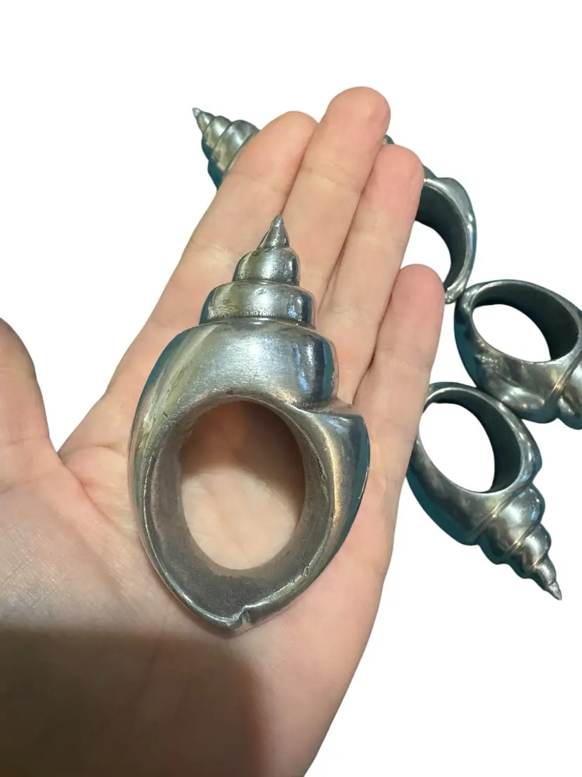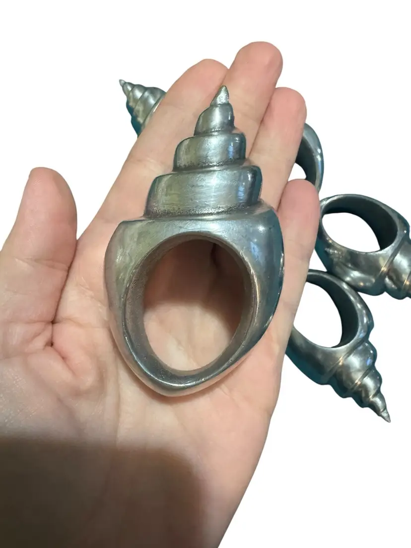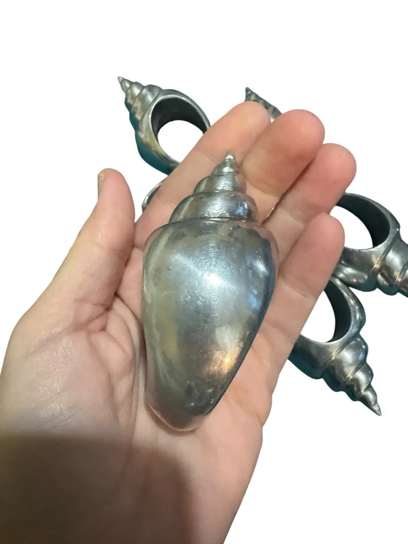 Set of 7 silver toned aluminum conch shell napkin rings. Excellent condition. These are nice and heavy in hand and perfect for your summer get together or your beach house.