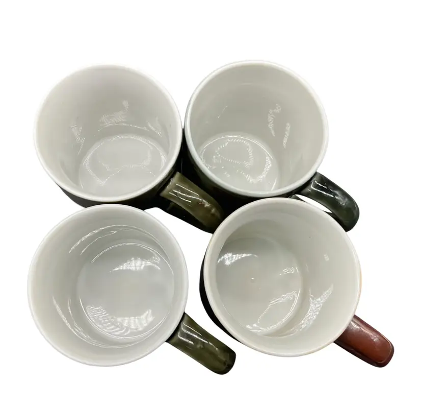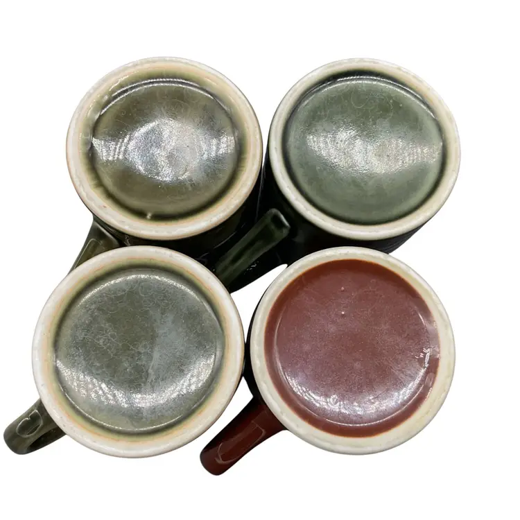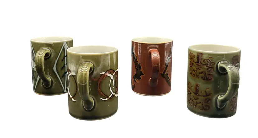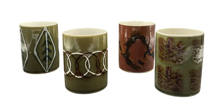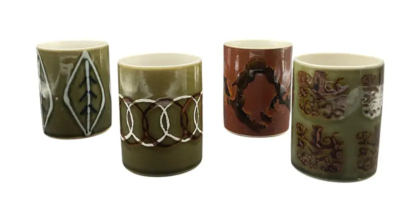 This set of four MCM ceramic mugs offers a blend of artistry and functionality. Featuring unique abstract designs, the earthy tones enhance their aesthetic appeal. Ideal for serving beverages, these mugs are both durable and stylish, making them a versatile addition to any kitchen collection.