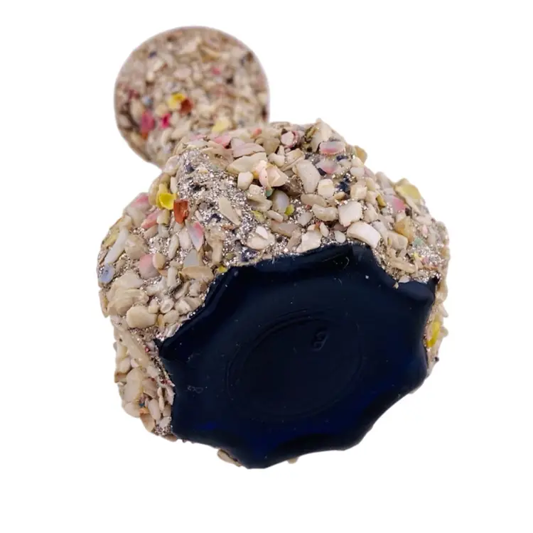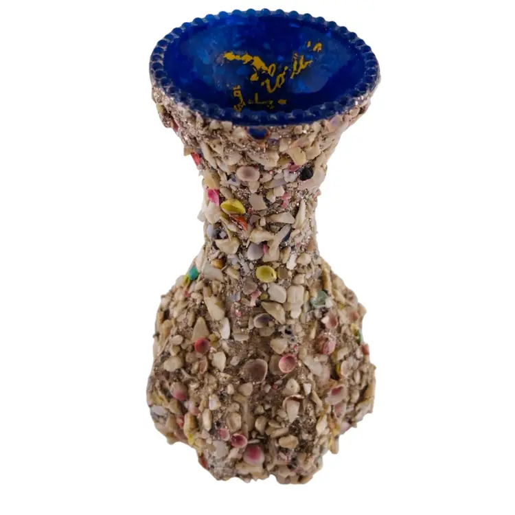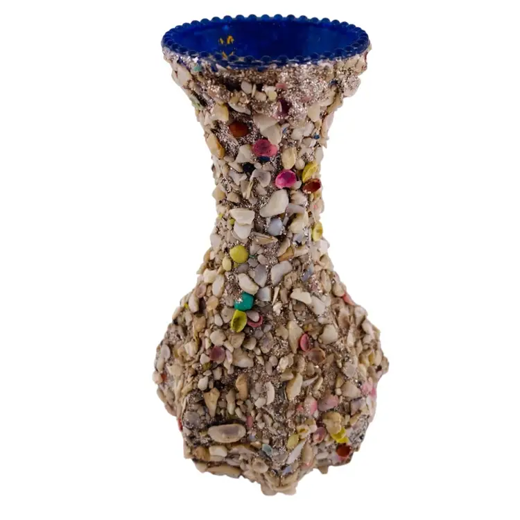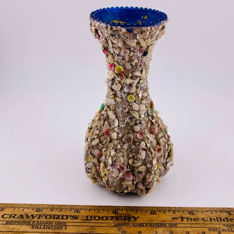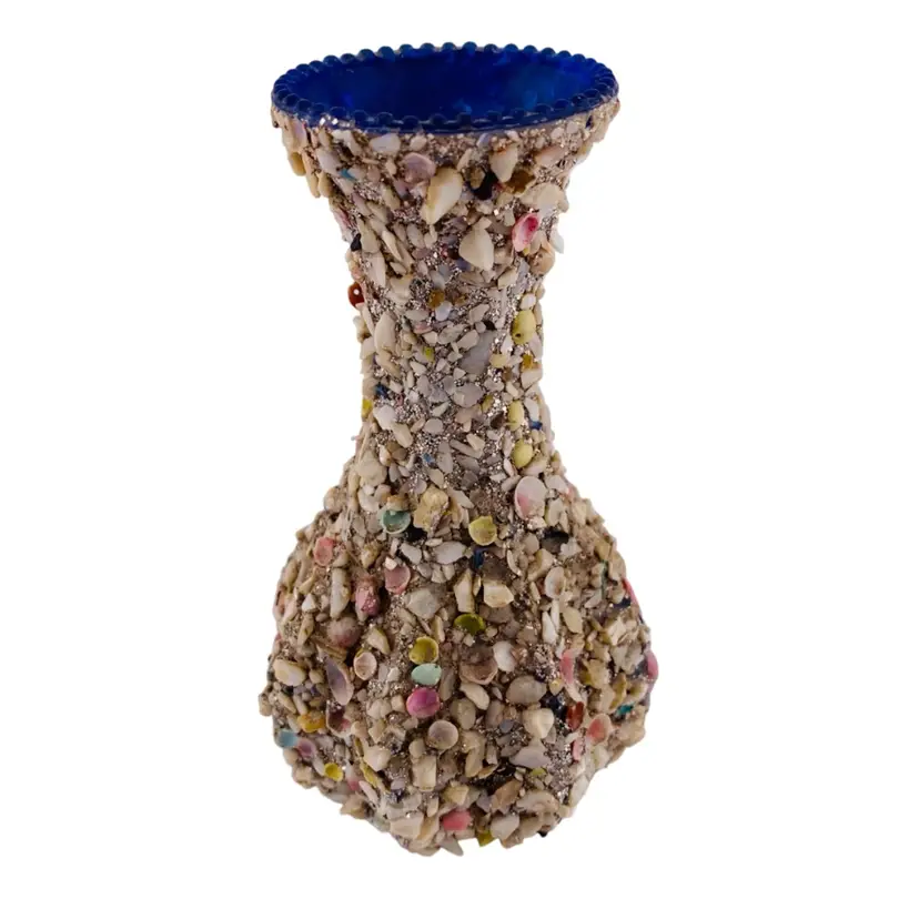 VTG Shell Covered Blue Glass Vase Souvenir Retro Beach House Coastal 1970s