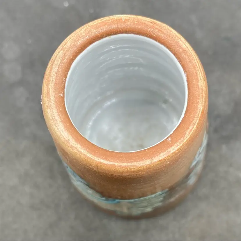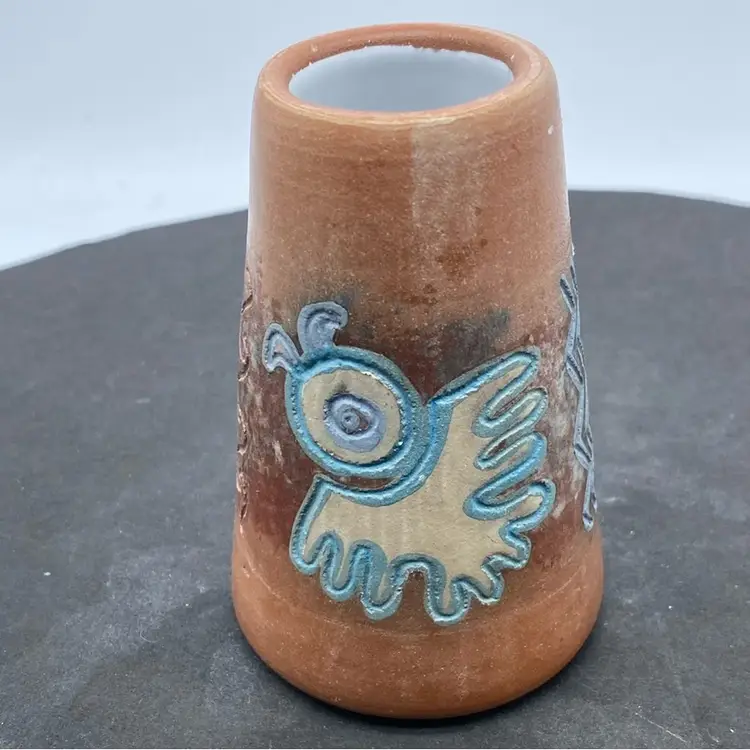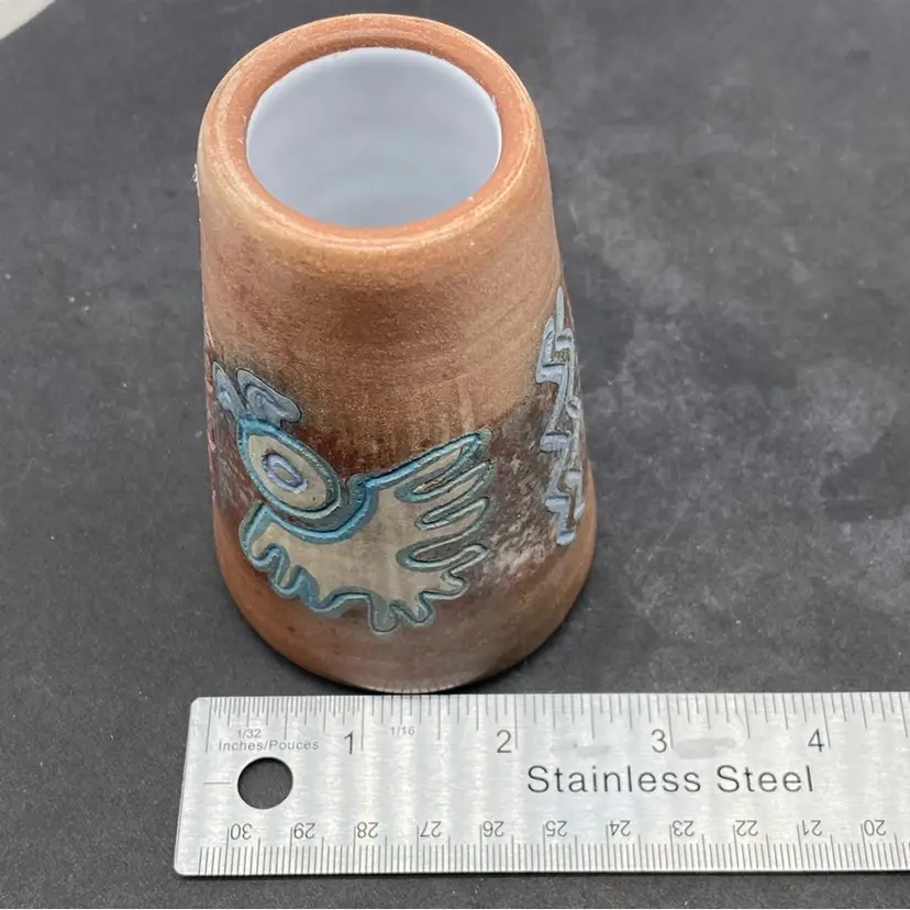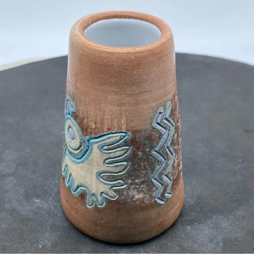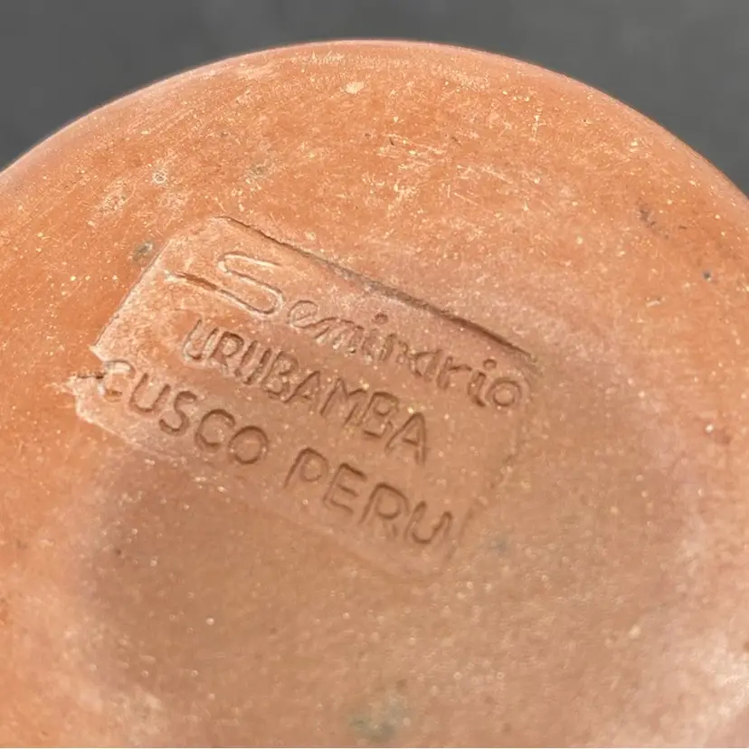 Handmade pottery cup or vase from Apu Yawarmaky, Urubamba, Cusco, Peru. It is made in the style developed by Pablo Seminario and Marilu Behar, featuring engraved images and colors from nature. No chips or cracks Approx 4 x 3 inch
