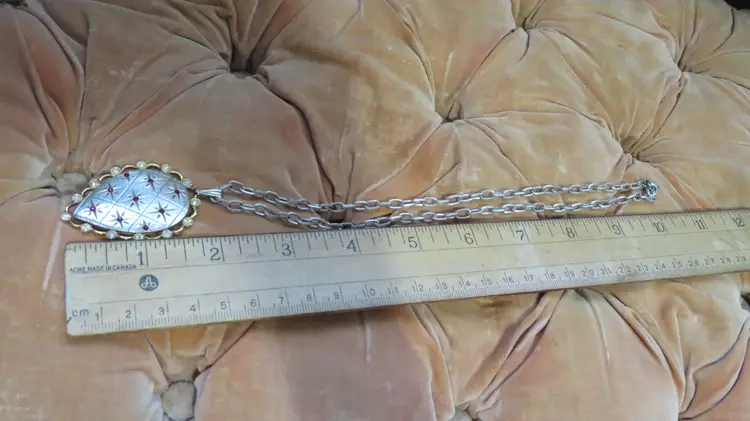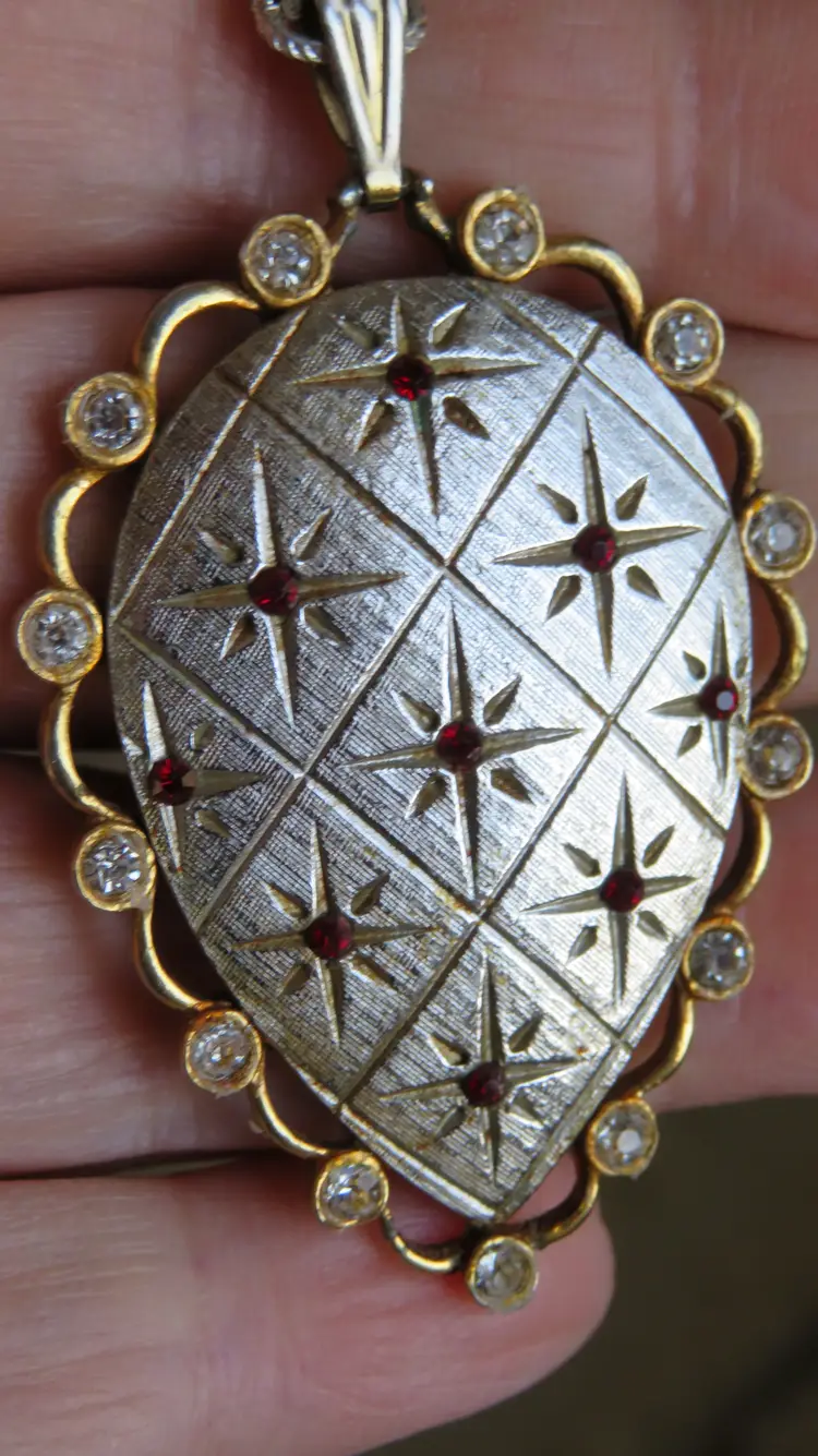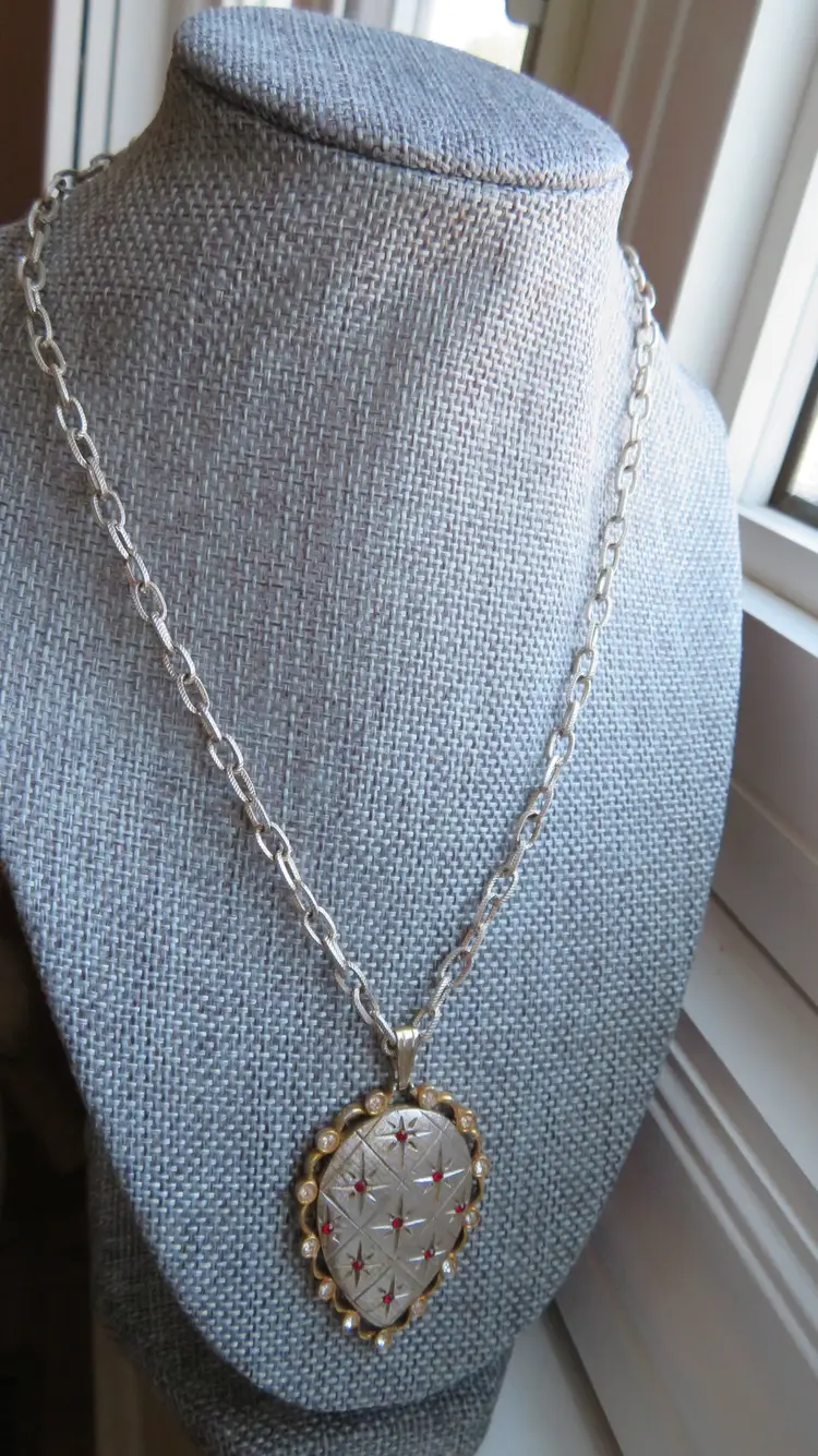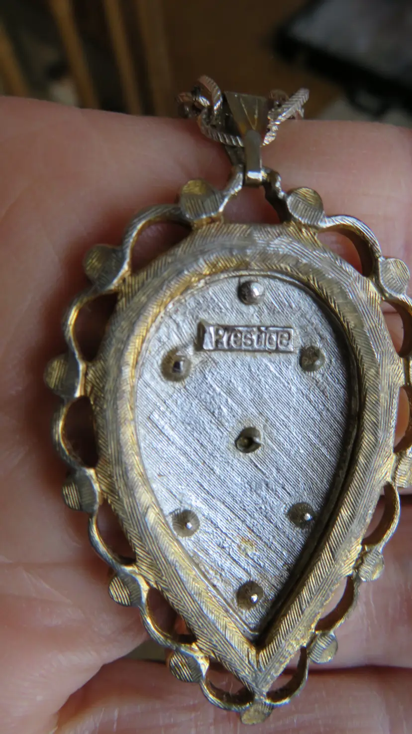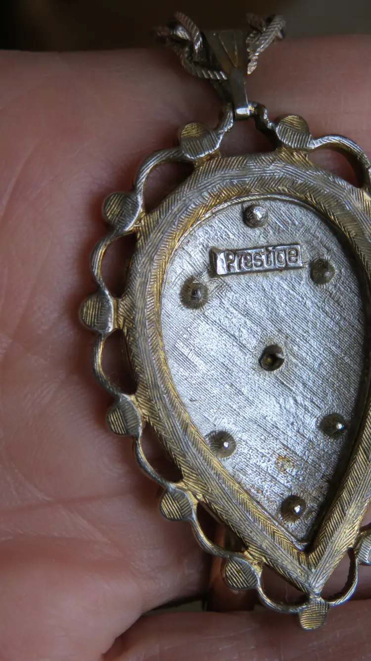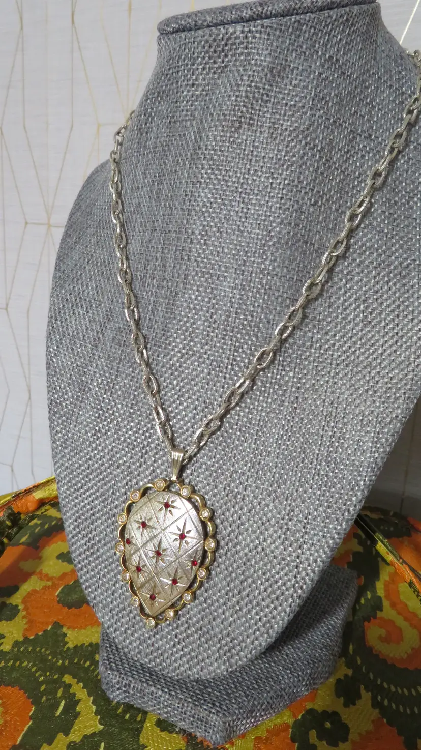 Elevate your jewelry collection with this vintage Prestige pendant necklace from the 1960s. Featuring a stunning ruby red crystal that captures the light with every movement, this piece is a true testament to timeless elegance. The silver chain complements the starburst design of the pendant, adding a touch of sophistication that's sure to draw attention.The necklace embodies a classic style with a hint of glamour, making it a versatile accessory for both casual and formal occasions. Signed by Prestige, this necklace is a collectible treasure that exudes charm and historical allure, perfect for anyone with an appreciation for antique jewelry.