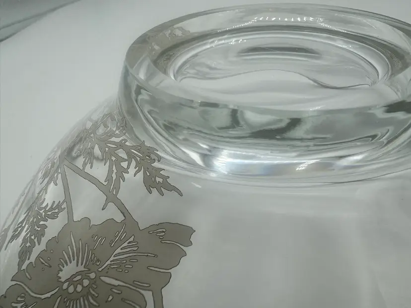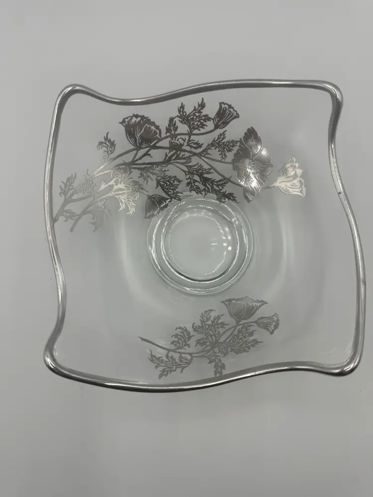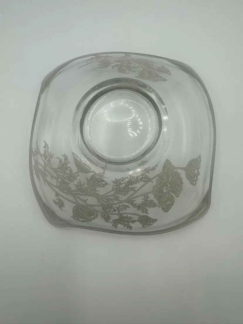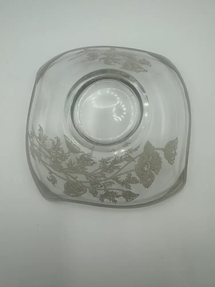 Add a touch of vintage charm to your table setting with this elegant round glass bowl from Flanders. The bowl features a beautiful silver city poppy design and is made of high-quality sterling silver overlay material. Perfect for all occasions, this bowl is a great addition to your mid-century modern and retro decor collection. As this condition. Has chip on the bottom rim. Not sharp at all and does not take away from the beauty of the dish. Can’t see when it’s sitting. Please see photos. Measures 2 3/4" X 7 1/2"
