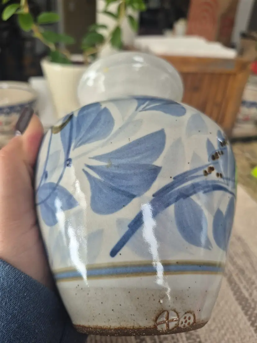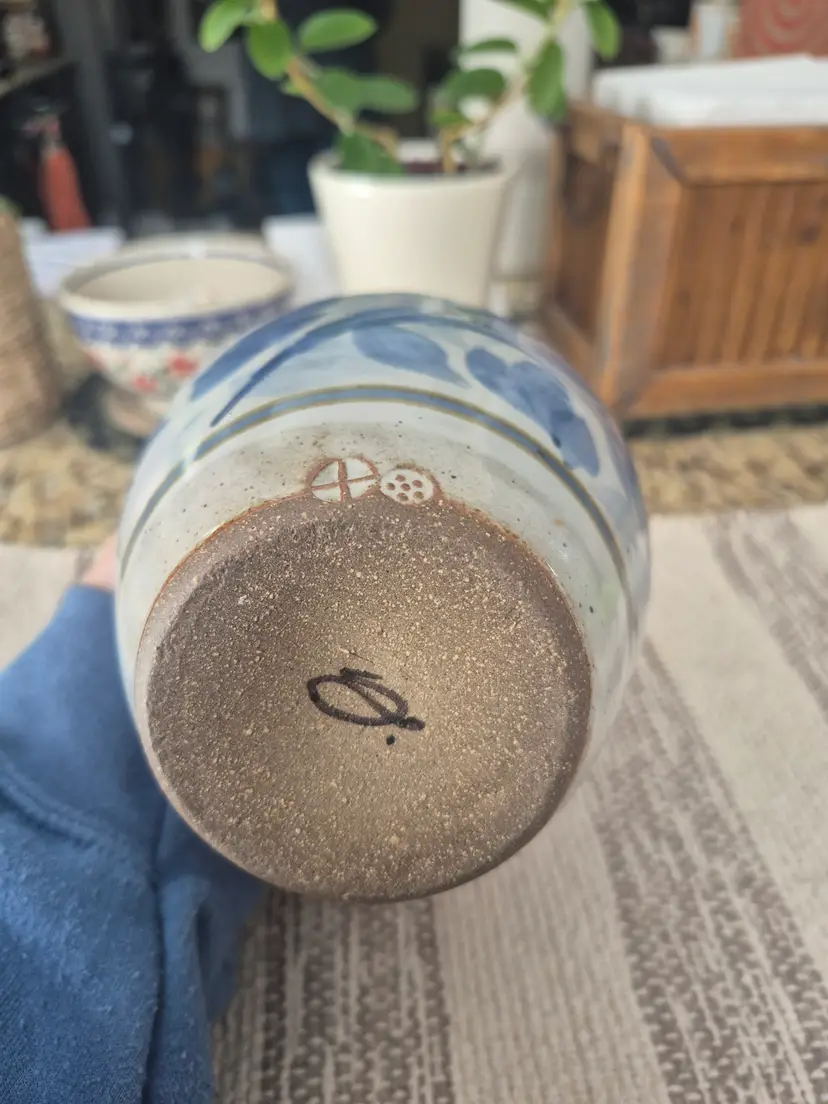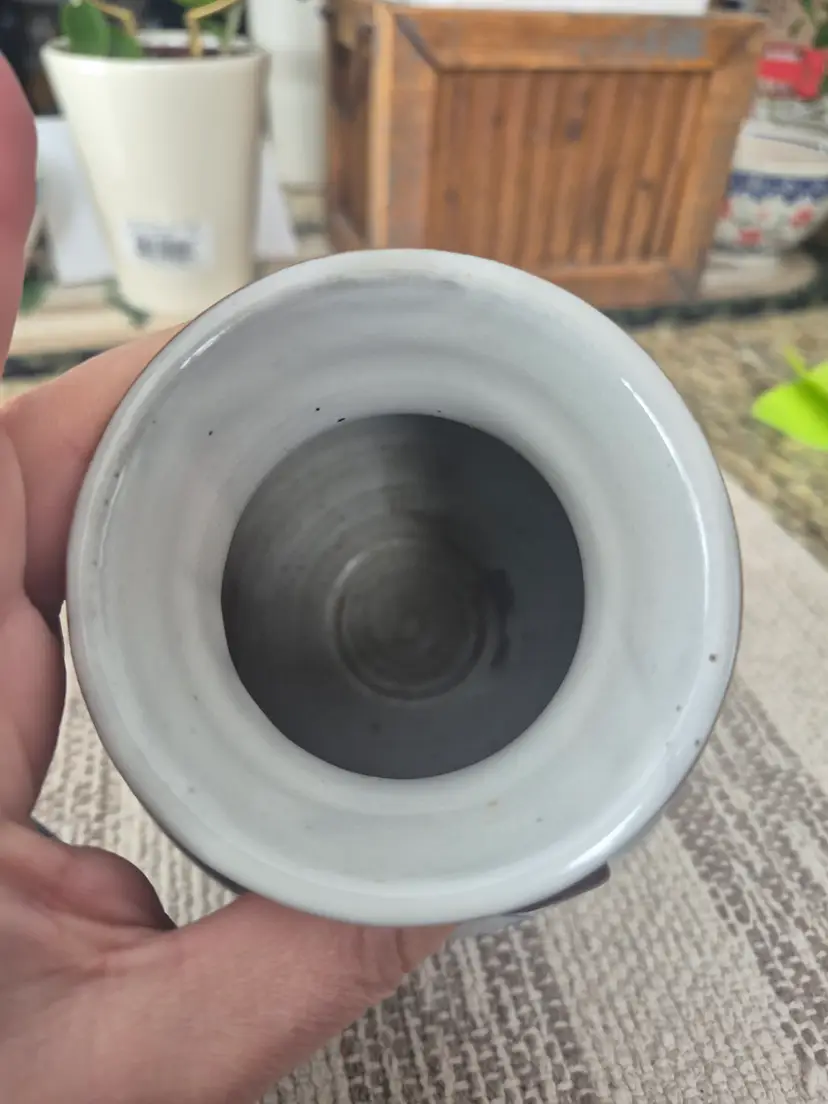 Blue, grey vase with green and brown details. Signed vintage Simon Pearce pottery