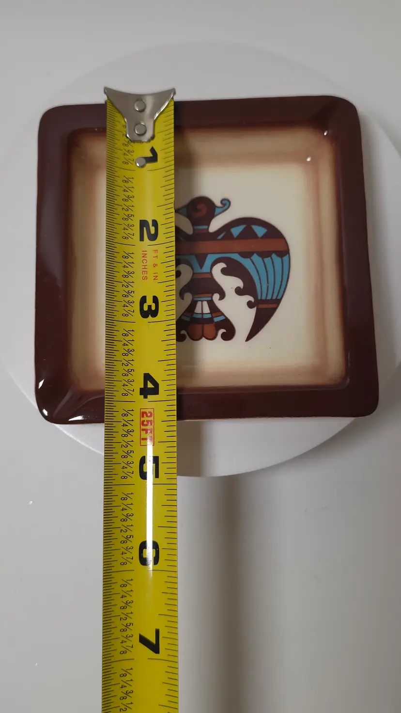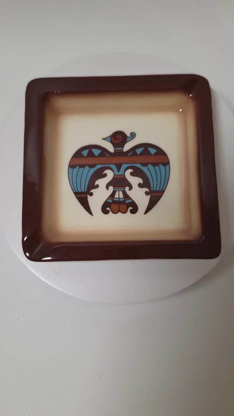 This vintage Sims Ceramic Thunderbird ashtray / trinket dish is a beautiful piece of Southwestern Native American folk art inspired piece, made in the United States. The ceramic ashtray features a unique Thunderbird design, adding a touch of Native American symbolism to any space. With its nostalgic charm and craftsmanship, this ashtray would make a great addition to any collection or a stylish decorative piece for any home.