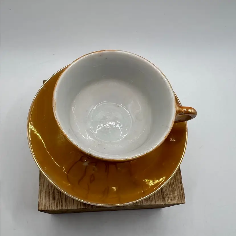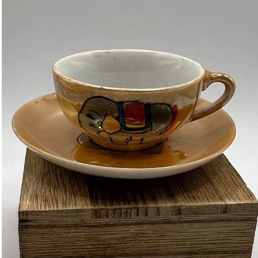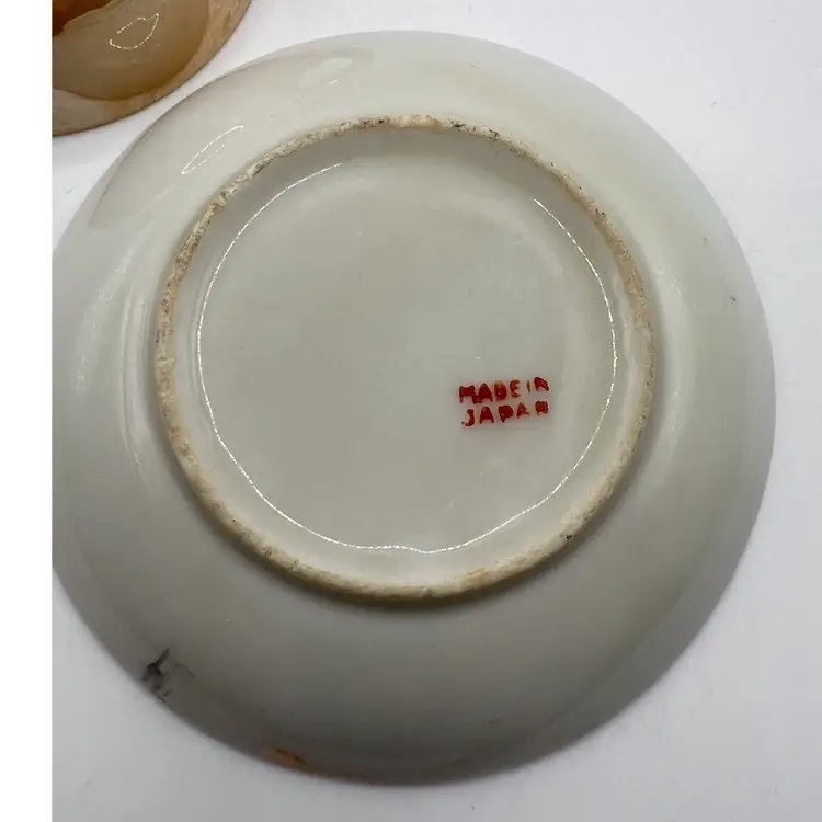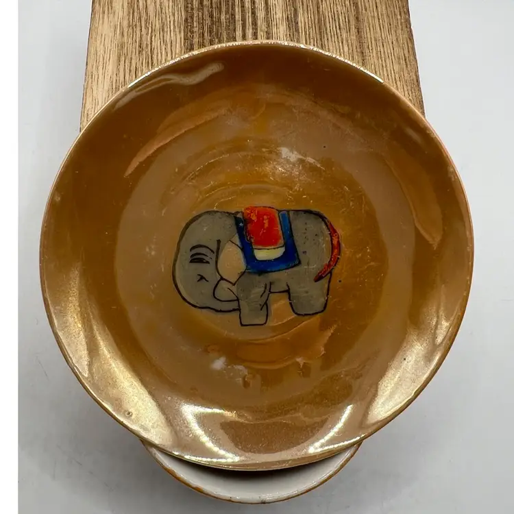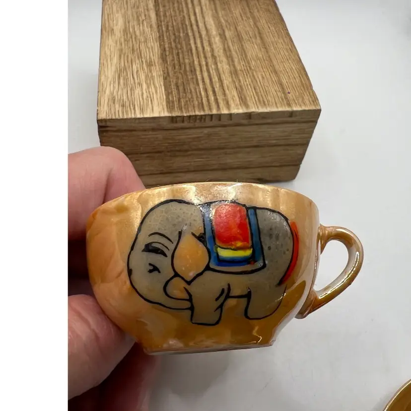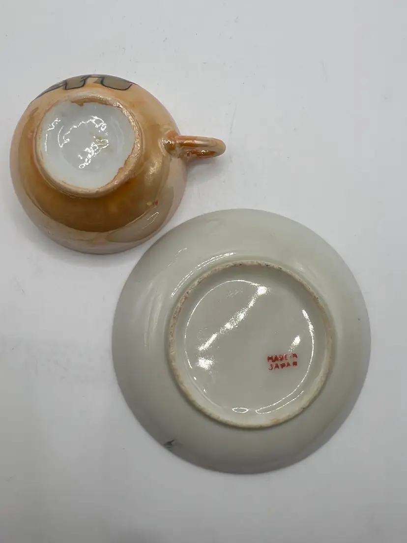 Cup measures 2” and saucer is 3” diameter. They are the orange tone of luster ware with hand painted elephants on each. There are a couple worn spots on saucer (pls see photo). Saucer is stamped “Made in Japan” in red. They have no chips or cracks. If you have any questions, please msg me Thank you