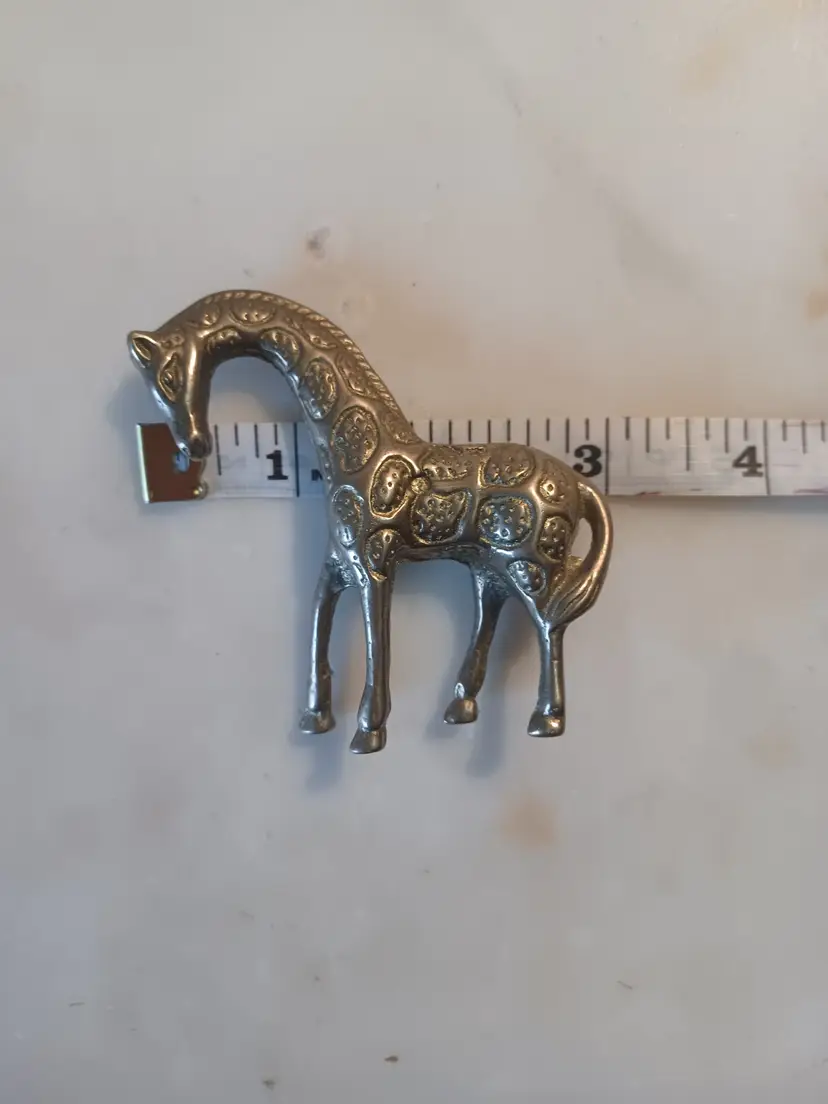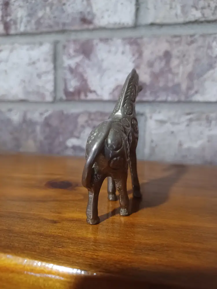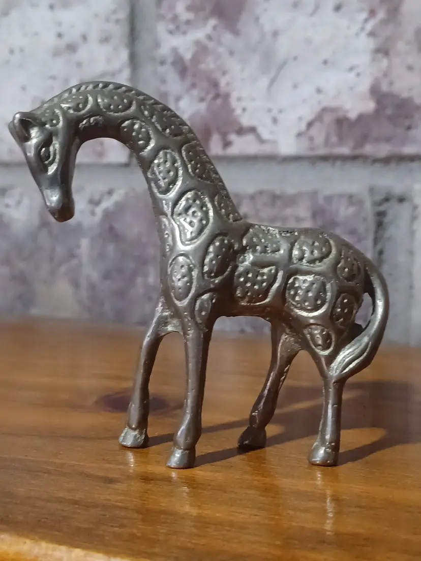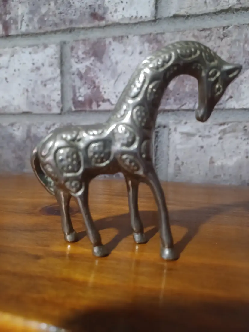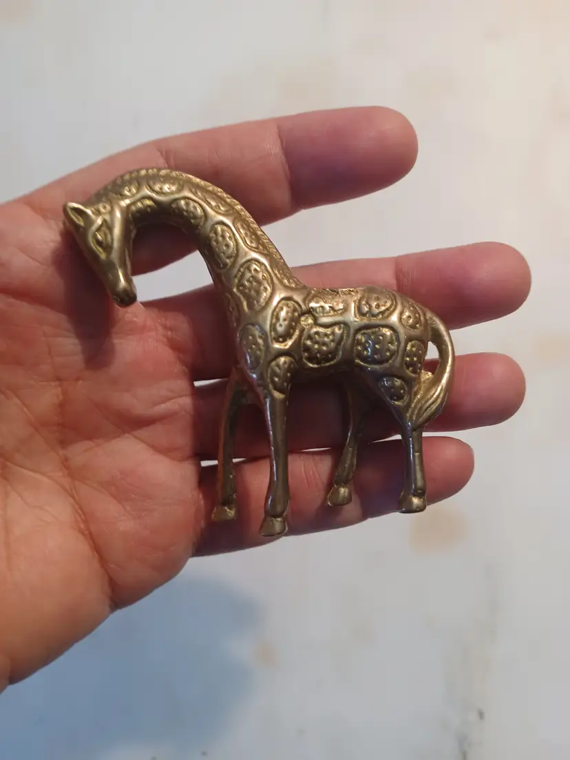 Add a touch of wild charm to your collection with this vintage solid brass giraffe figurine. Measuring approximately 3 inches wide, this miniature sculpture is perfect for display on a shelf, desk, or as part of a wildlife-themed décor collection.