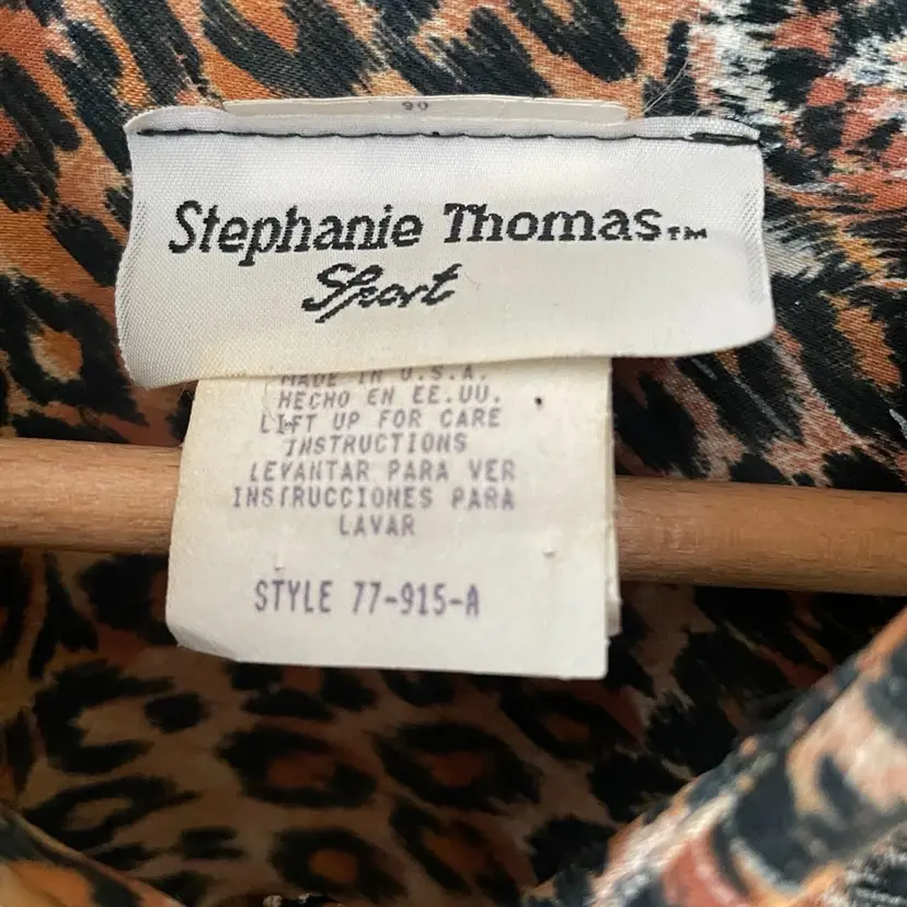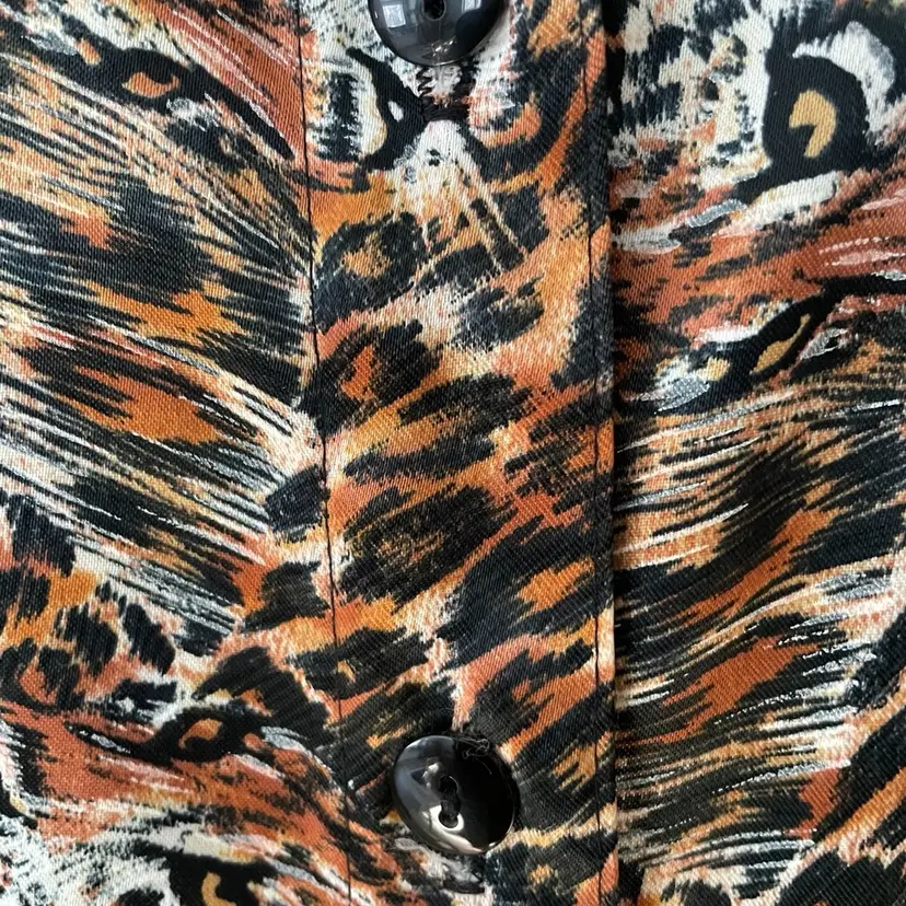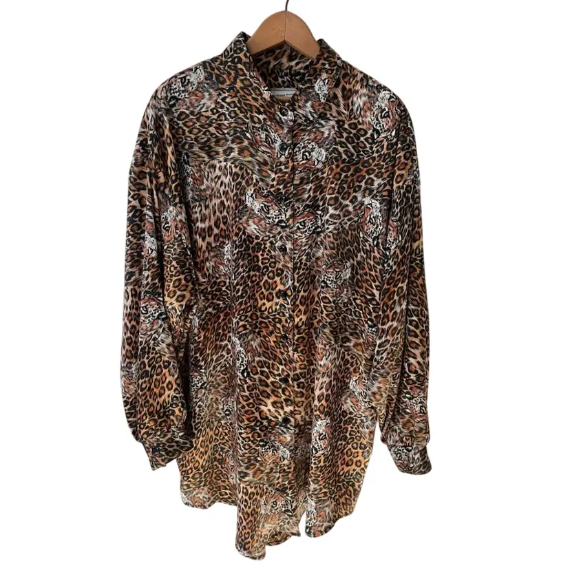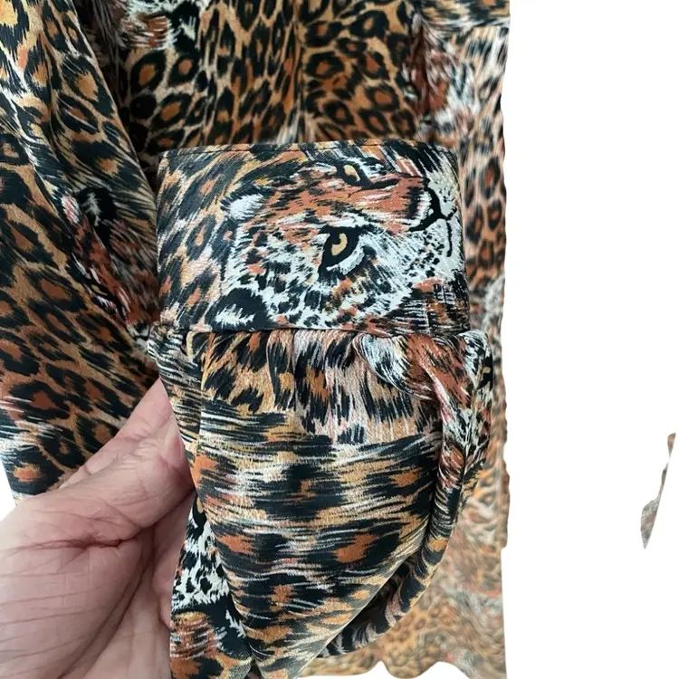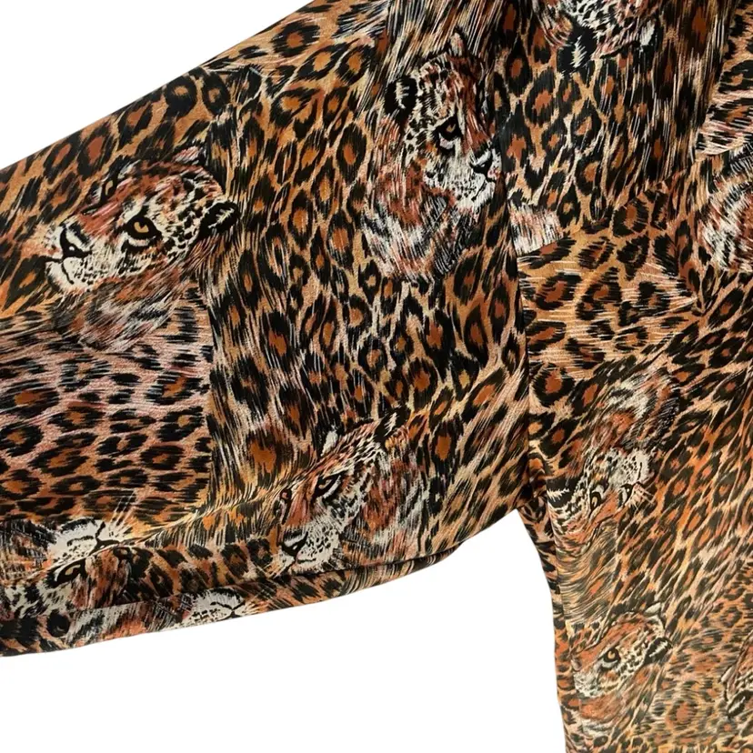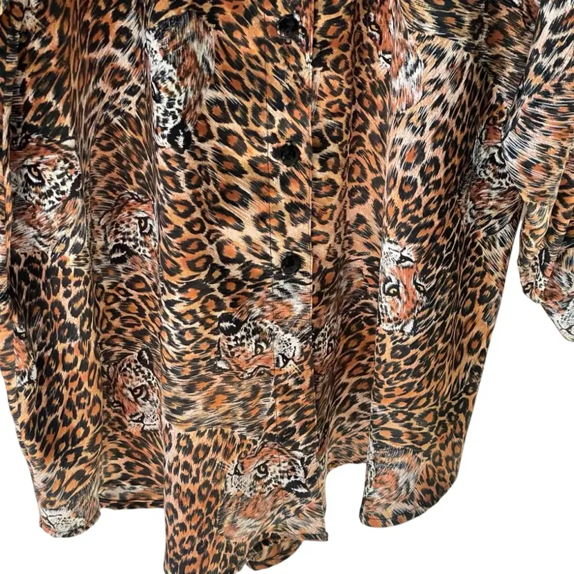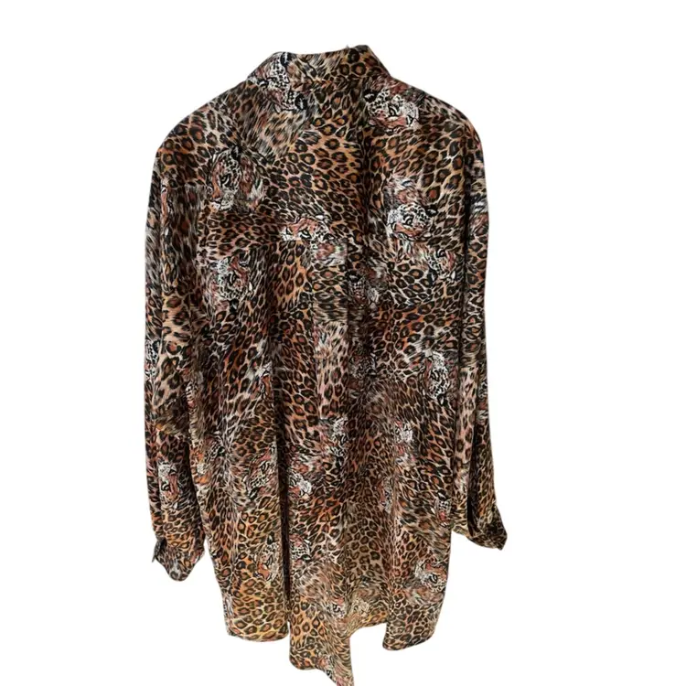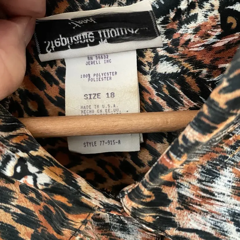 Size 18 . 100% Polyester. Very well made and the print is really classy looking. Button front & cuffed sleeves.
