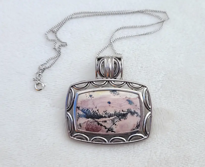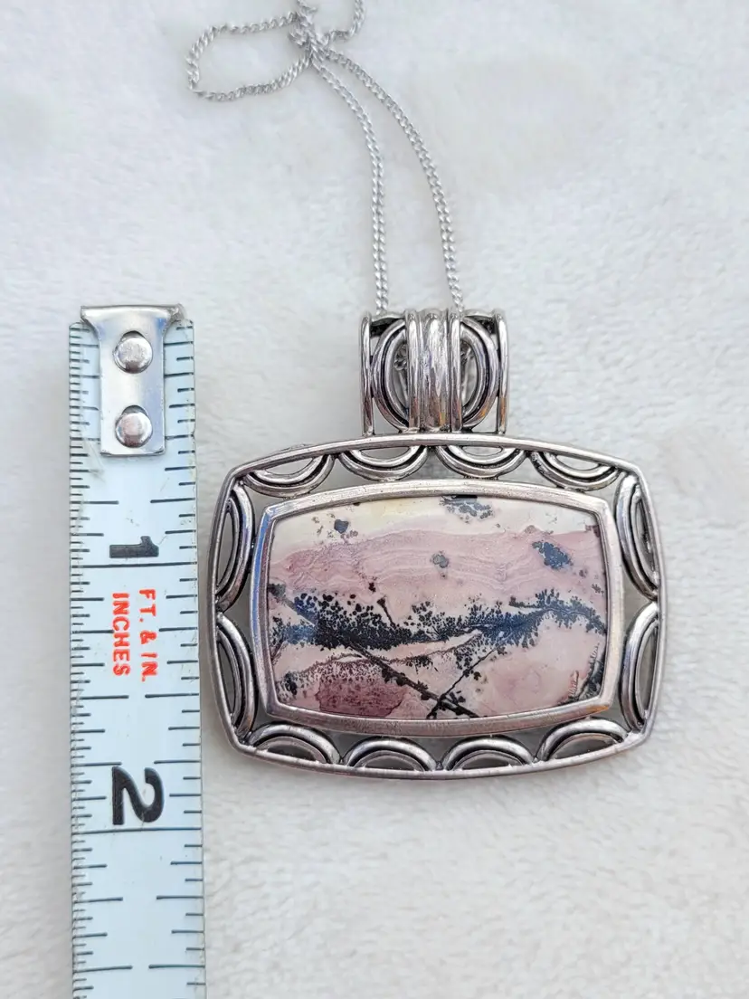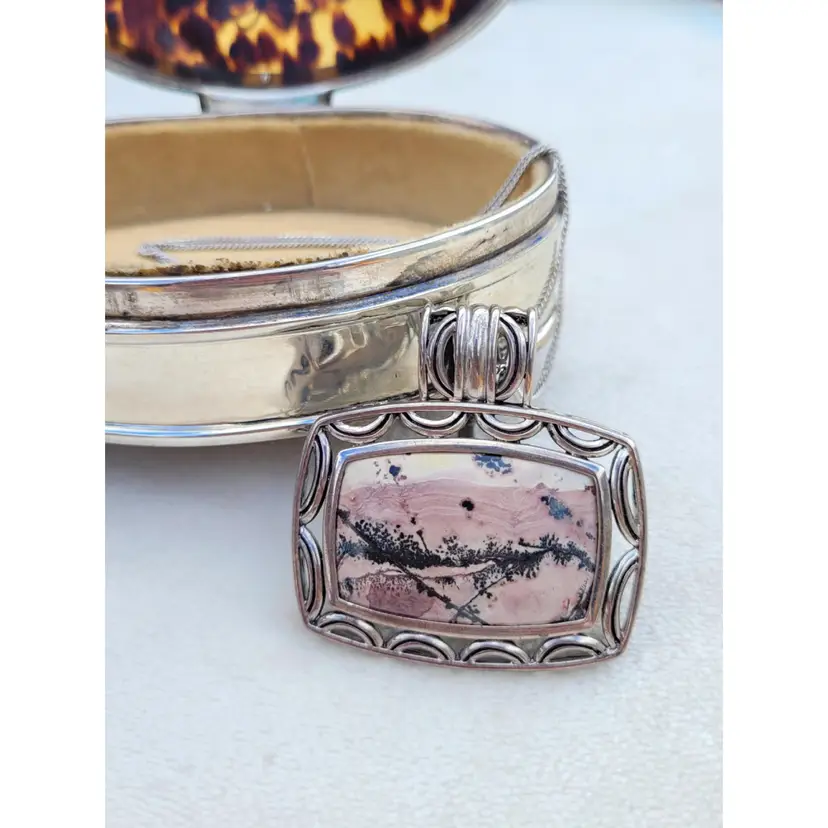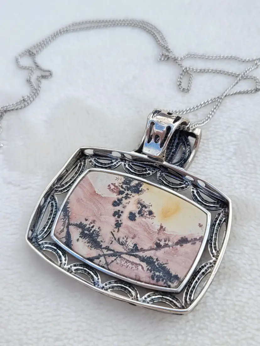 Beautiful heavy sterling silver necklace with a large pink jasper cabachon. The bale opens up to easily allow the chain to be switched out for a collar necklace. This is circa y2k and in good condition, please see pictures for details and measurements.