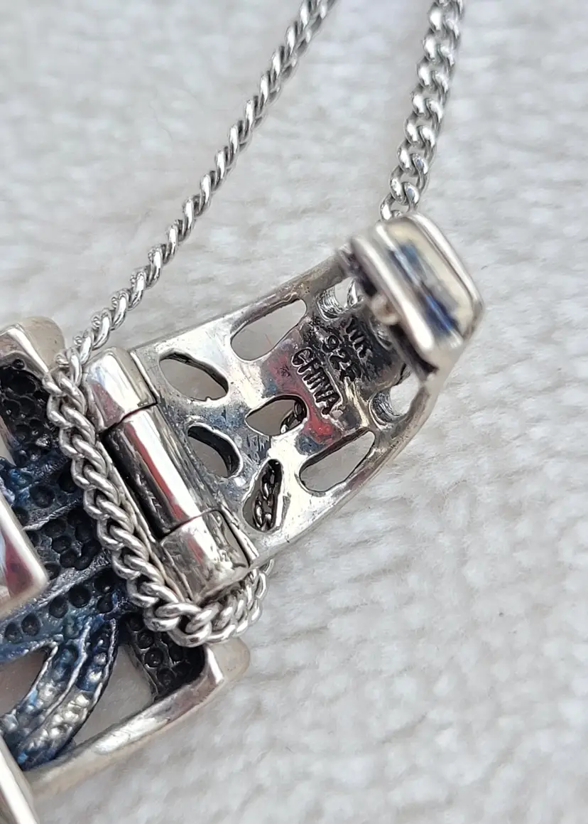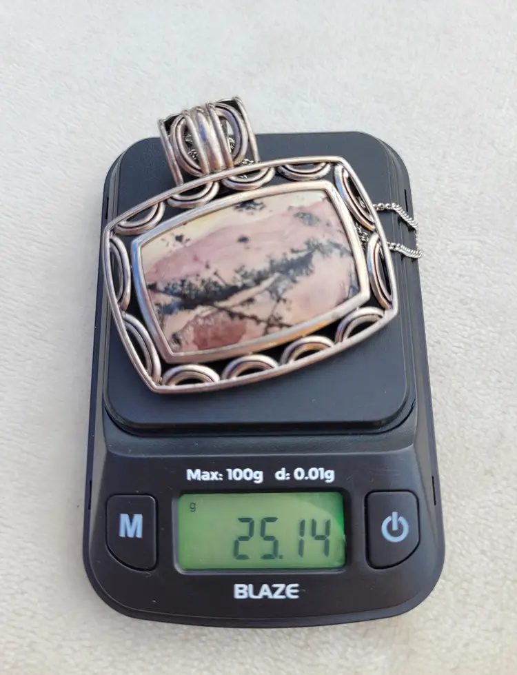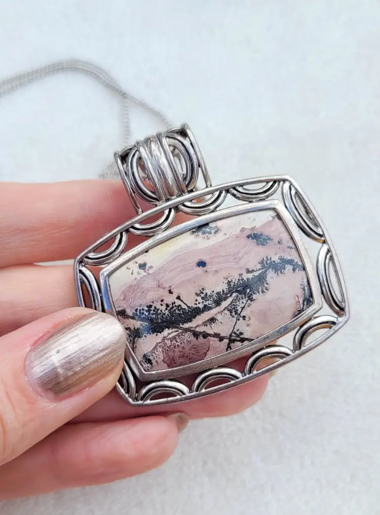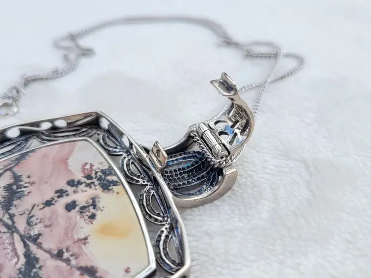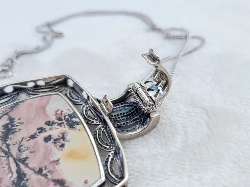 Beautiful heavy sterling silver necklace with a large pink jasper cabachon. The bale opens up to easily allow the chain to be switched out for a collar necklace. This is circa y2k and in good condition, please see pictures for details and measurements.