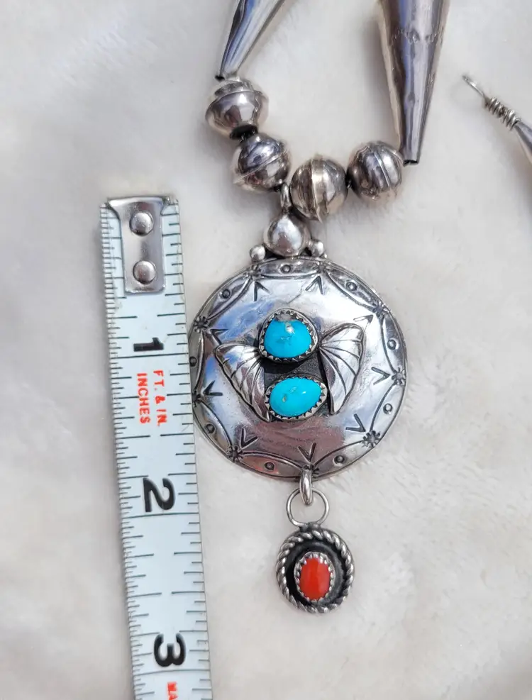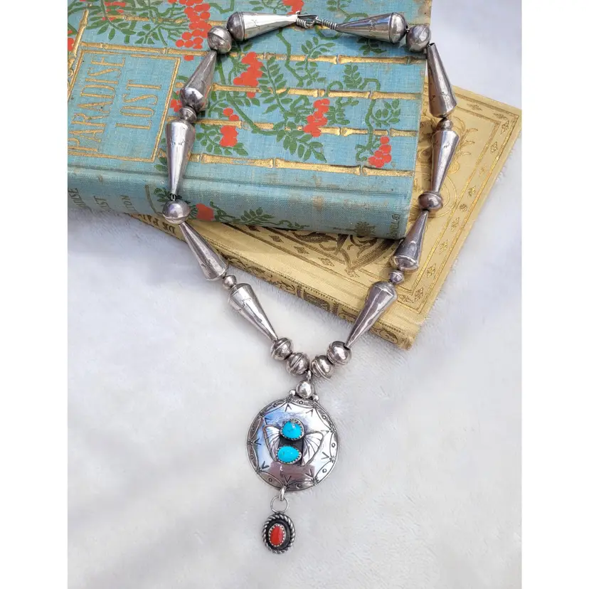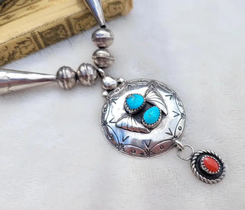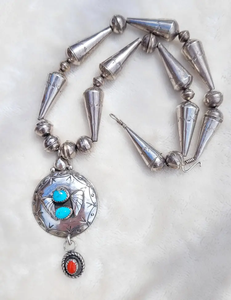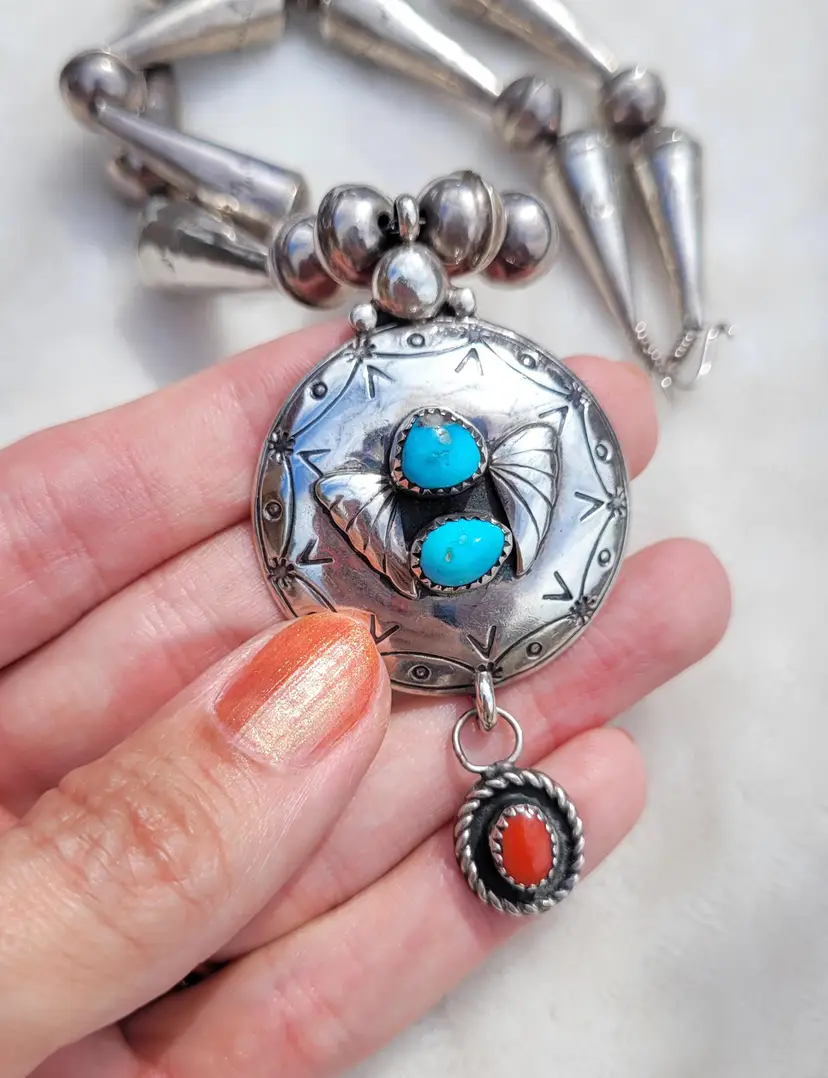 Huge, stunning statement of a piece comprised of a whopping 46 grams of pure sterling silver along with turquoise and coral stones on the pendant! This gorgeous piece of art is signed by the artisan but I've been unable to determine exactly who that is. This came from an estate collection of Native jewelry items and I'm estimating it is 1970s. It's in really good condition and looks incredible when worn. Please see pictures for details and measurements.