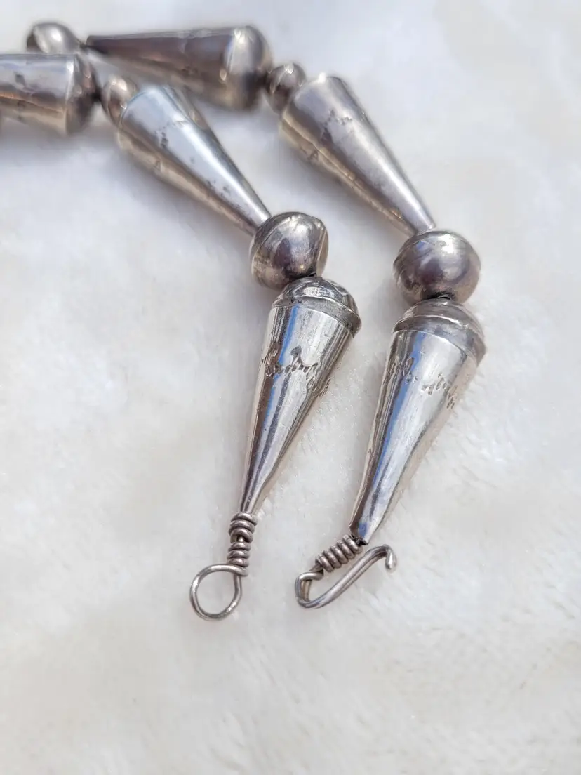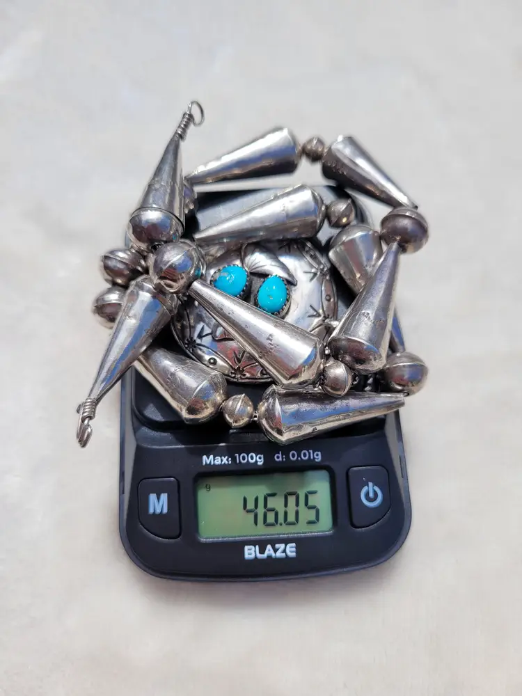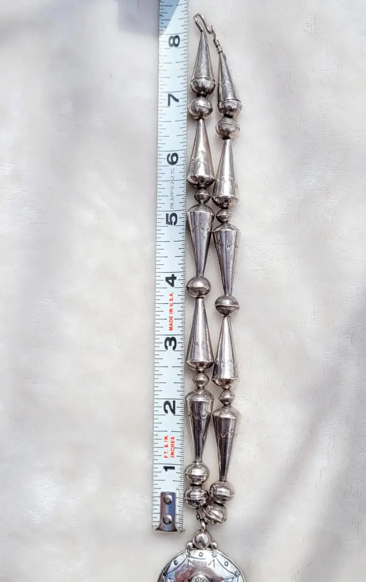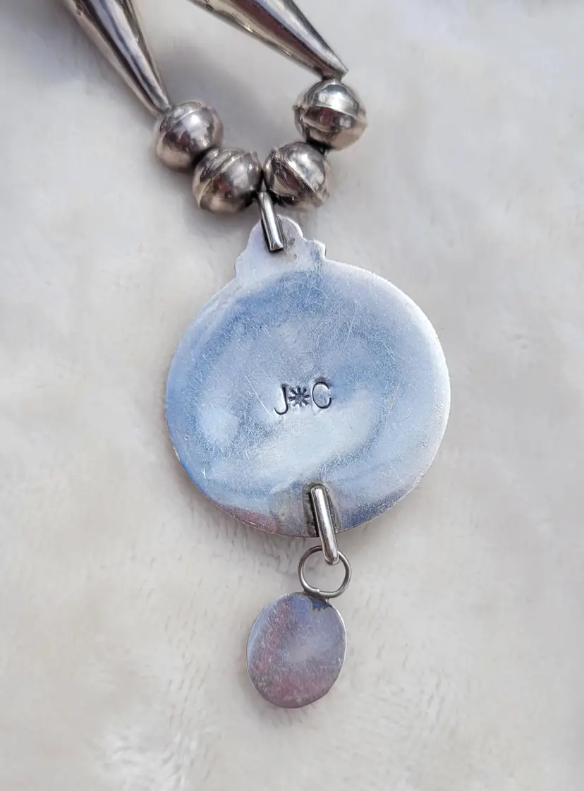 Huge, stunning statement of a piece comprised of a whopping 46 grams of pure sterling silver along with turquoise and coral stones on the pendant! This gorgeous piece of art is signed by the artisan but I've been unable to determine exactly who that is. This came from an estate collection of Native jewelry items and I'm estimating it is 1970s. It's in really good condition and looks incredible when worn. Please see pictures for details and measurements.