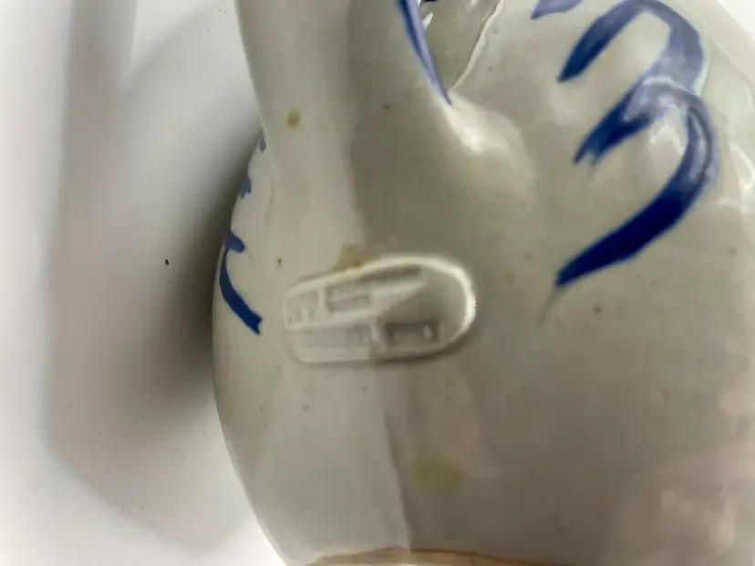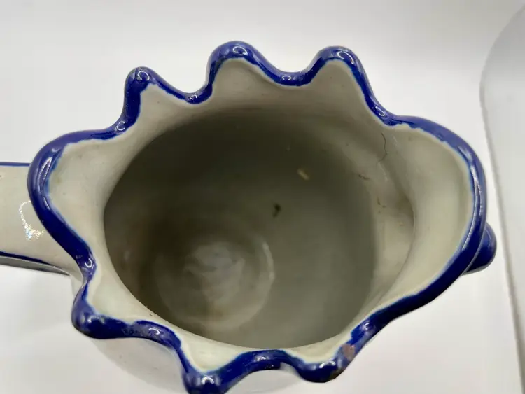 The VTG Stoneware Alley Cincinnati Advertising Rooster Pottery Pitcher by Skip Meinhart is a vintage piece of folk art originating from Cincinnati in the United States. Handmade from stoneware, this rooster-themed pitcher features a glossy finish and is signed by the artist. Standing at 8 inches tall with a 7-inch beak to handle length, this unique piece adds a touch of charm to any farmhouse or country-inspired decor with its art pottery production style and hand-painted detailing.