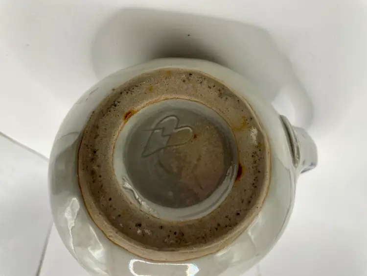 This piece is signed on the bottom with his signature M & a heart. Maker’s mark is impressed under the handle.
