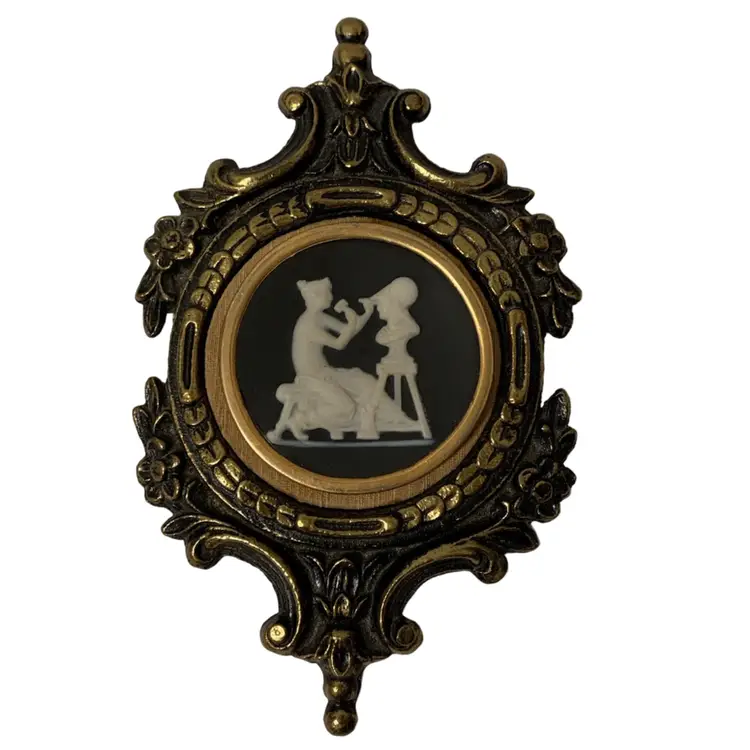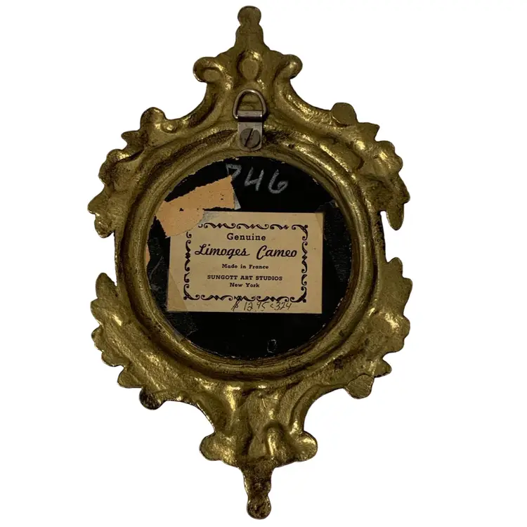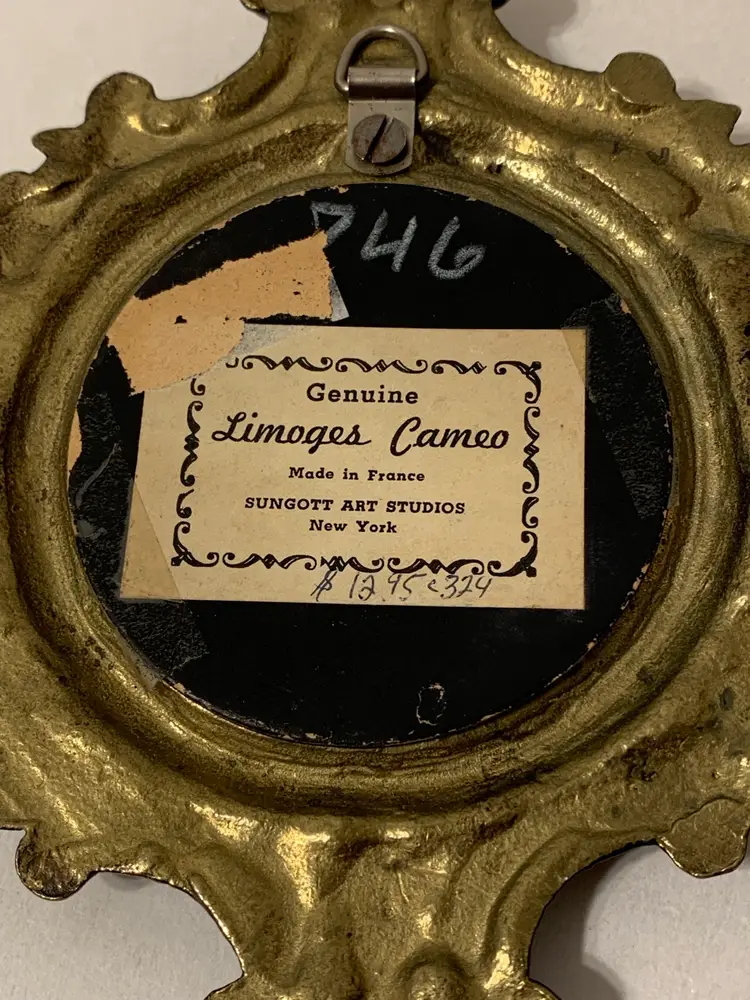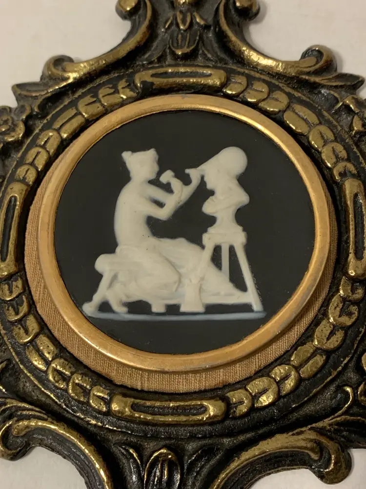 Great condition. Cameo is 3” in diameter. Frame is 8” tall by 4.5” in diameter. Free from cracks or chips.