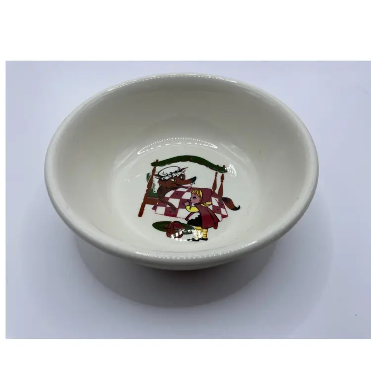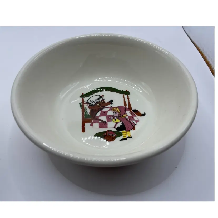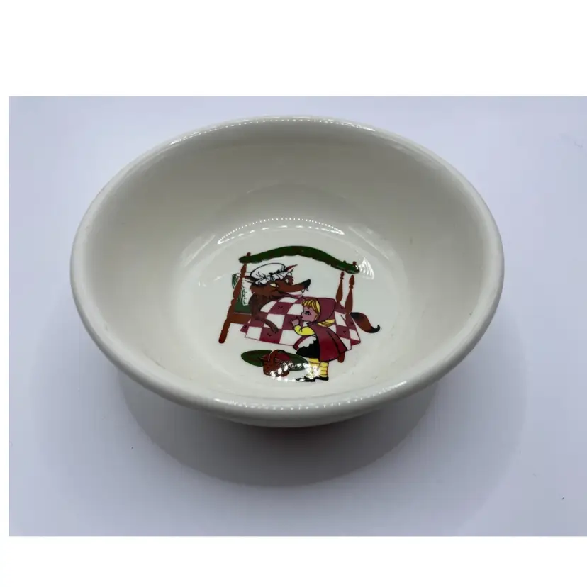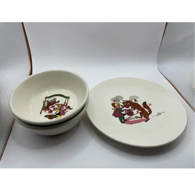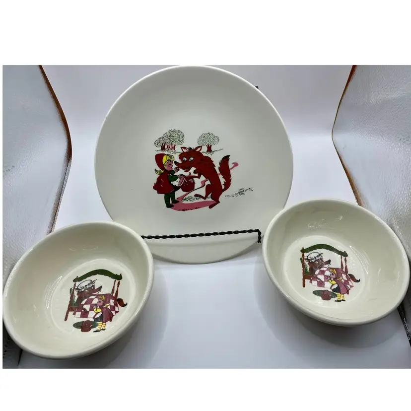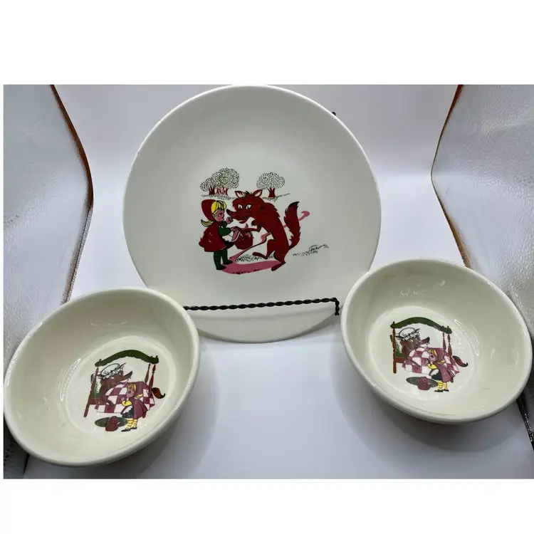 The VTG Taylor Smith Taylor Children’s Little Red Riding Hood Plate & 2 Bowls Kids set is a vintage three-piece collection with a round, multicolor ceramic design featuring a Little Red Riding Hood pattern. Made in America during the Mid 20th Century, this eclectic style set includes 2 cereal bowls and a dinner plate, perfect for all occasions. The brand, Taylor Smith & Taylor, is known for its original Storybook theme, making it a timeless addition for teens, adults, and unisex kids alike. Hand wash only to preserve the glossy finish and enjoy this charming wolf-themed set.