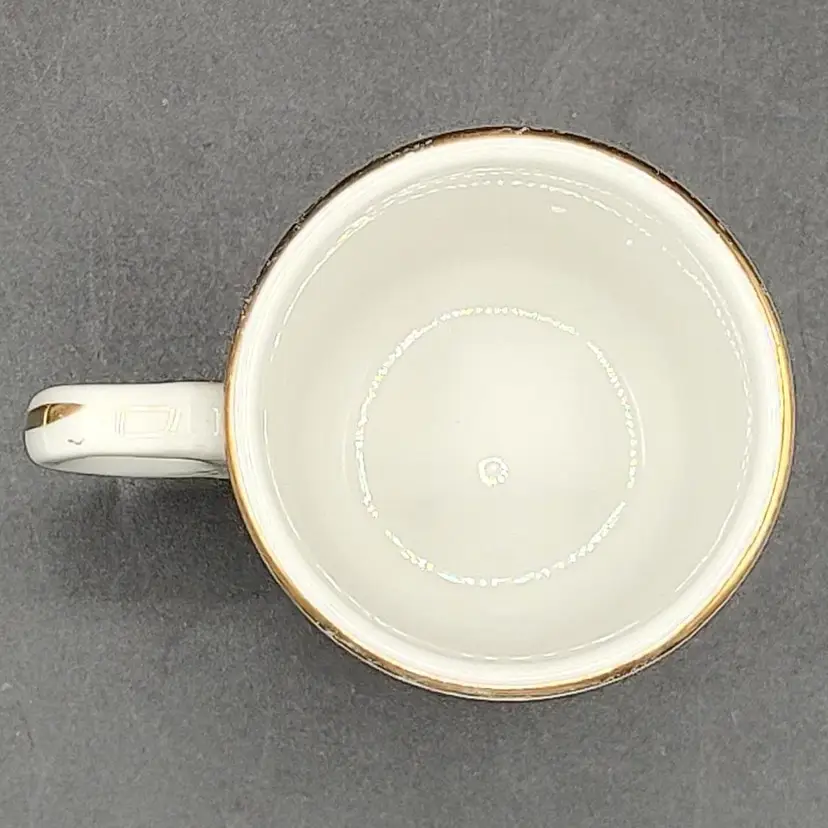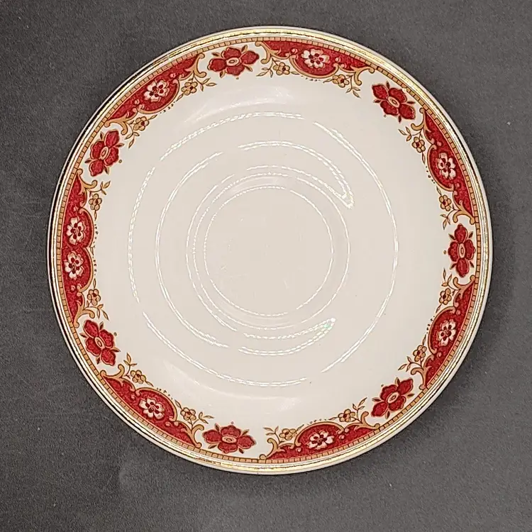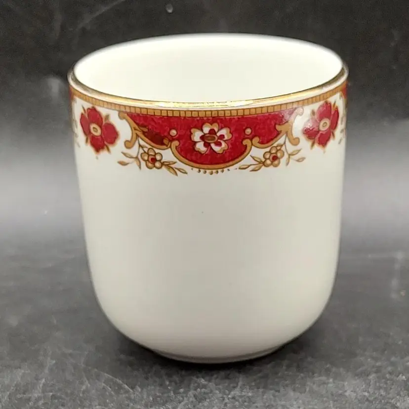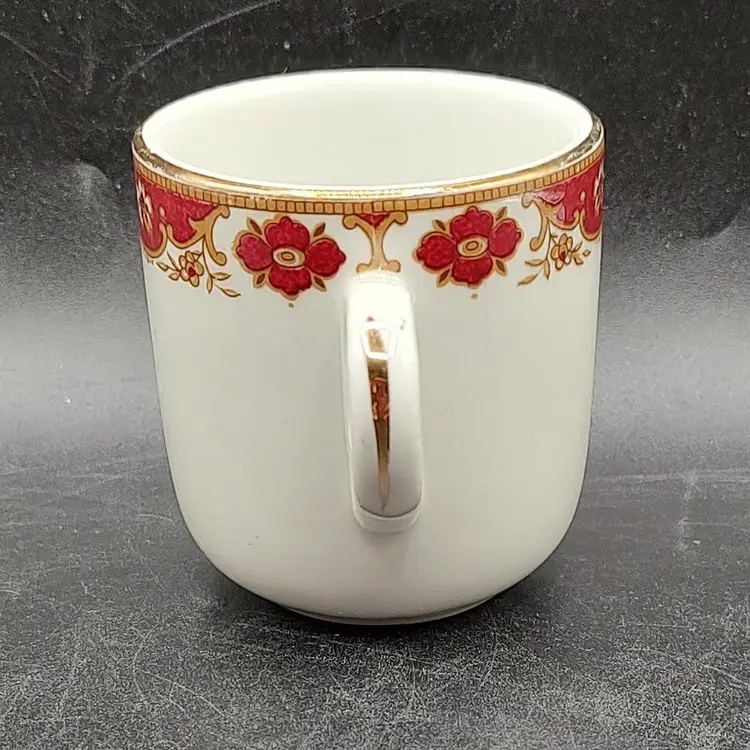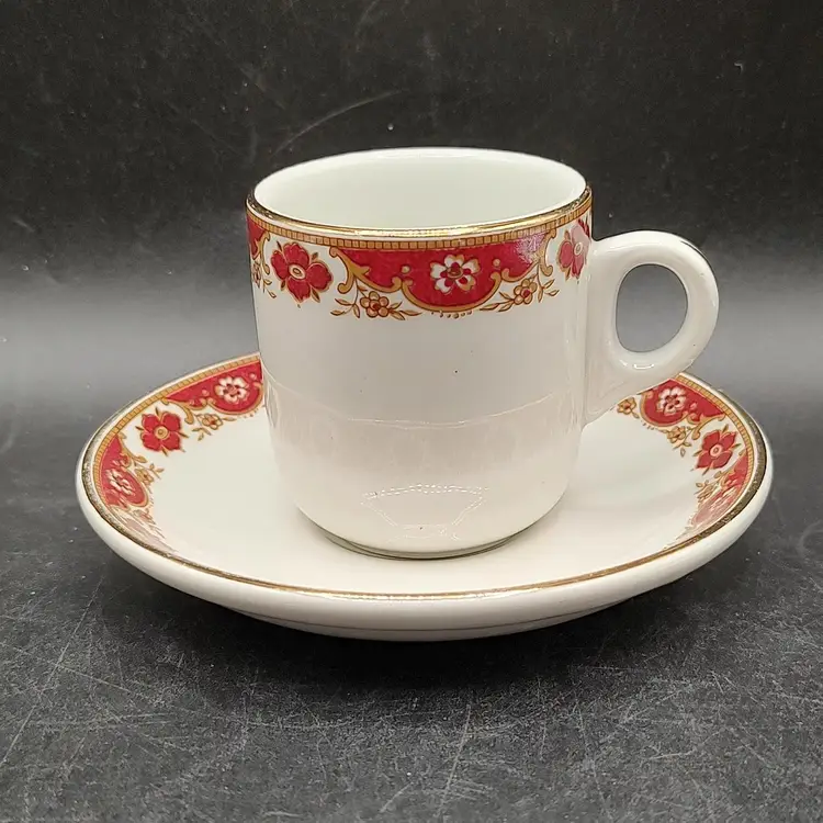 Vintage THF Maddock Ceramic Maroon And Gold Trimmed Miniature Demitasse Teacup And Saucer Set. In good condition with no chips or cracks has wear on bottom of saucer. Teacup height 2.5" x diameter 2"/ Saucer diameter 4.5". Made in England