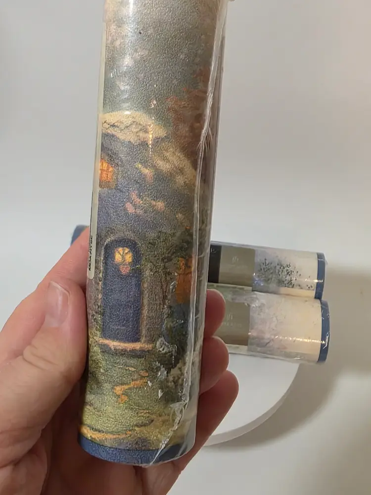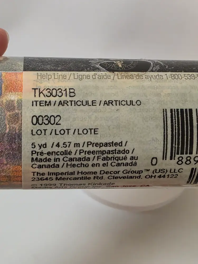 The product is a vintage Thomas Kinkade Wallpaper Border in the Cottage Village pattern. This multi-color, country-style vinyl border is 5 yards long and comes in a sealed package. Designed by the Painter of Light, this pre-pasted border is perfect for adding a touch of charm to any room in your home. Made in Canada by Imperial, this wallpaper border is a unique and stylish addition to your home decor.